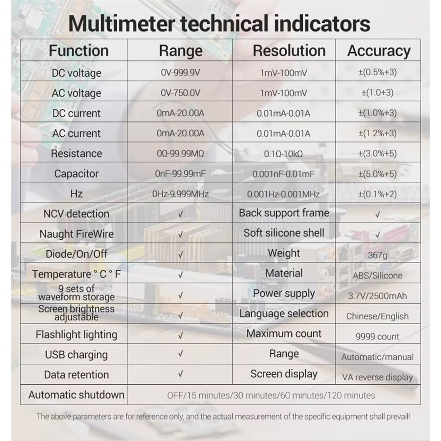 - Високоточний мультиметр: вбудований мультиметр дозволяє вимірювати постійну/змінну напругу, силу струму, опір, ємність, частоту і температуру, має тест напівпровідників (діодів і транзисторів), перевірку цілісності ланцюга (прозвонку), безконтактний детектор напруги та функцію визначення фазного і нейтрального провідників.