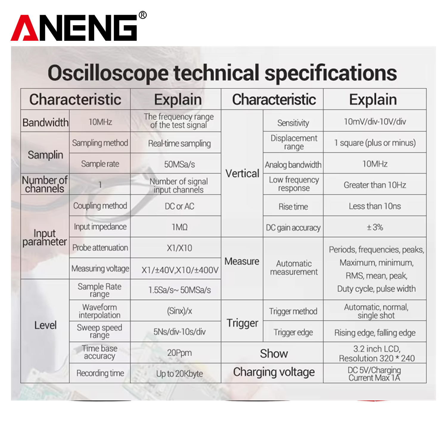 - Дизайн 2 в 1 з екраном TFT: цей прилад геніально поєднує функції цифрового осцилографа й мультиметра в одному пристрої, має 3,2-дюймовий кольоровий екран з роздільною здатністю 320*240 точок, показання на якому чіткі, а кольори насичені.