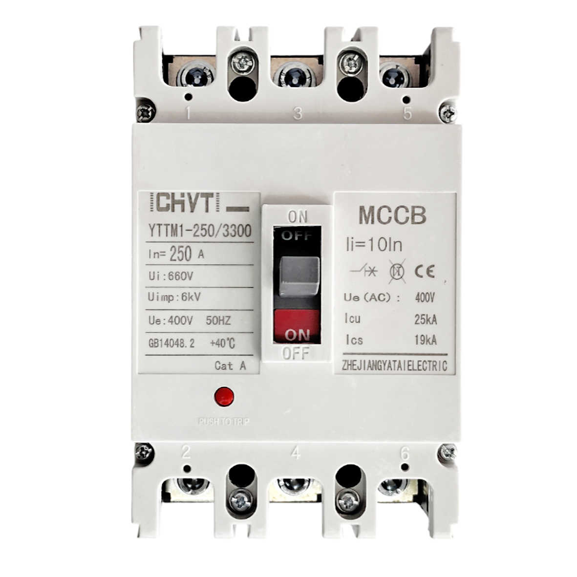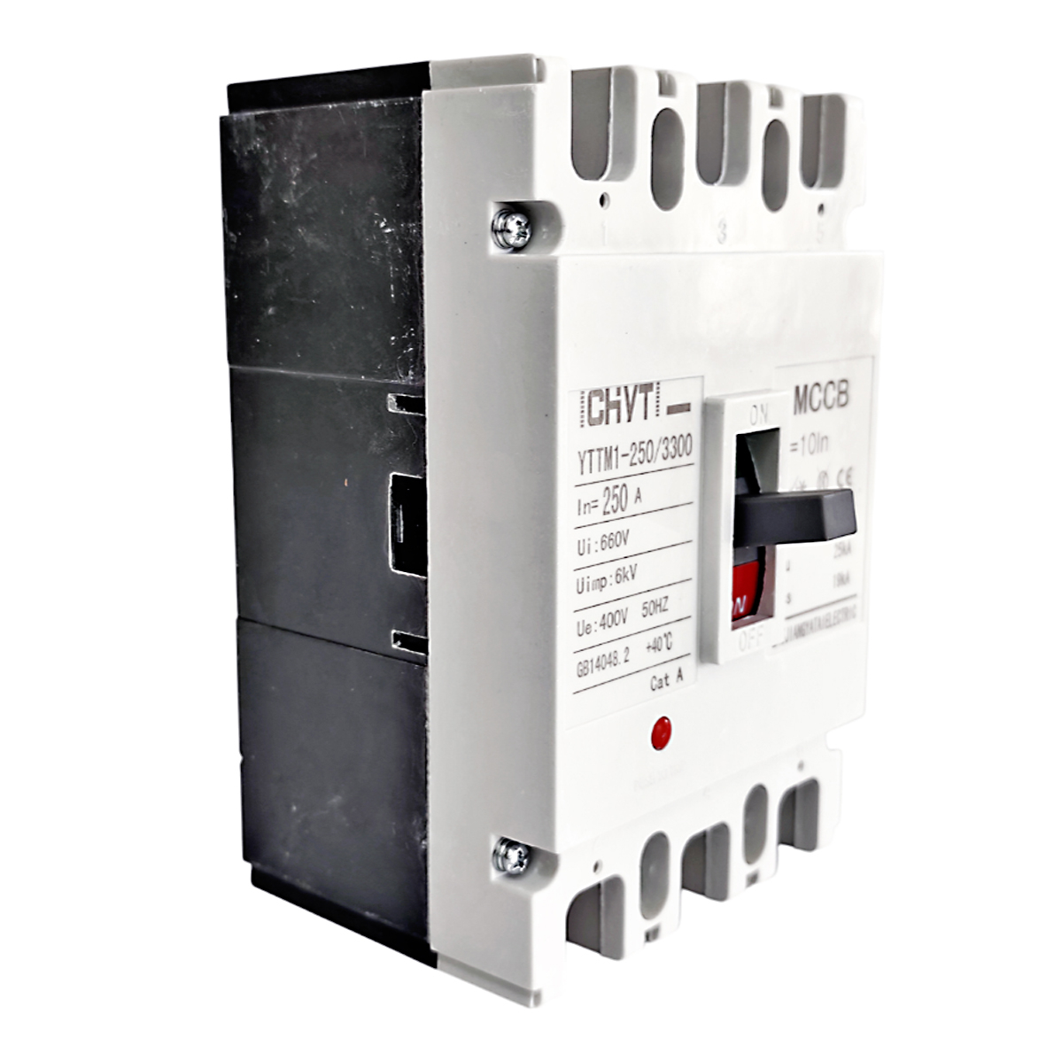 Автоматичні вимикачі YTTM1-250 CHYT призначені для захисту низьковольтних електричних мереж від перевантажень і струмів короткого замикання, а також для неперіодичного вимкнення електроенергії на певних зонах електромережі. Кількість полюсів: 3P, характеристика спрацьовування розчіплювача: "C", номінальний струм: 250А Вимикальна здатність: 25кА.