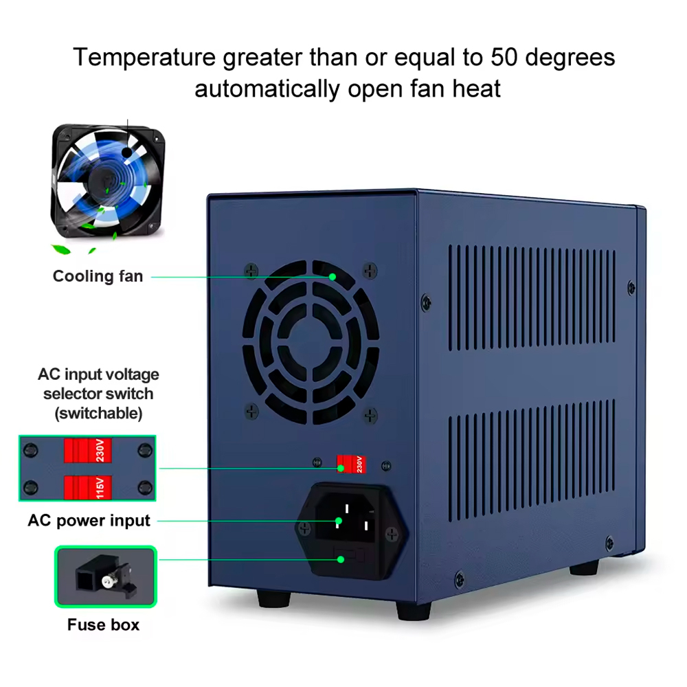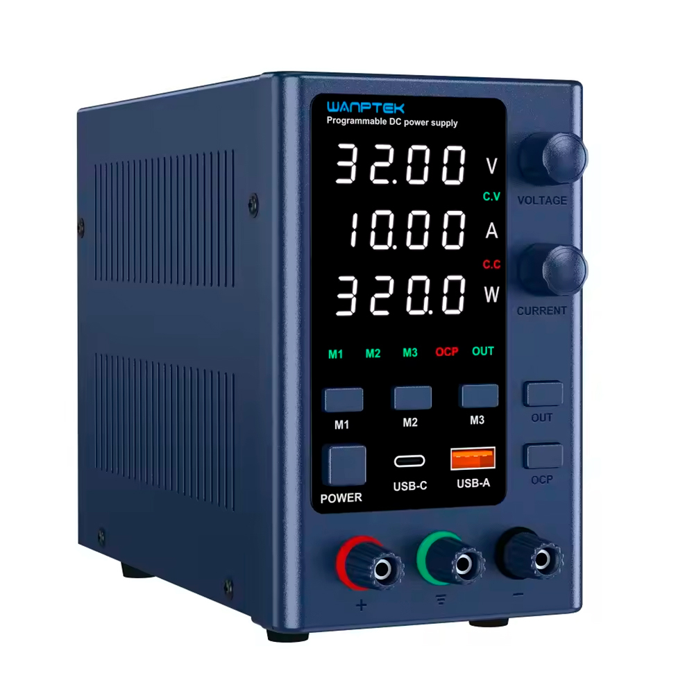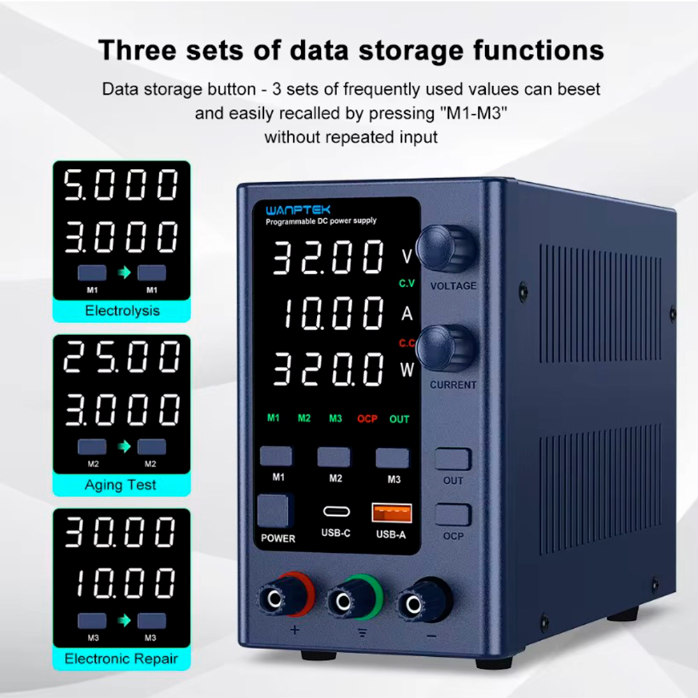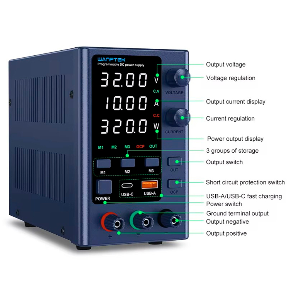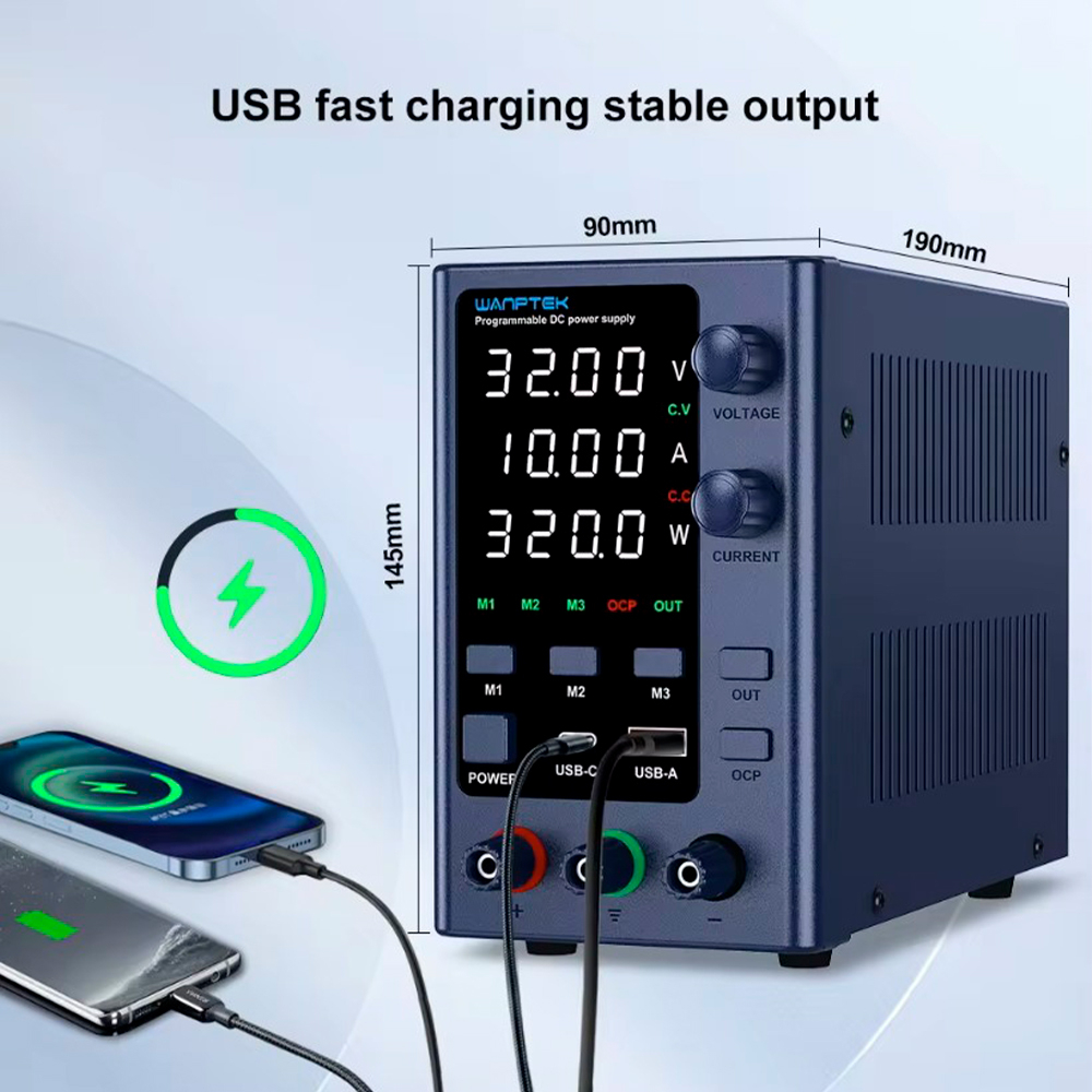 Пристрій має інтерфейс швидкої зарядки USB-A та Type-C, що підтримує різноманітні протоколи швидкої зарядки. Блок живлення має надійну схему захисту OVP та OCP, кнопку активації виходу OUT (Output) та кнопки пам’яті для збереження налаштувань напруги та струму. Цей продукт також забезпечує функцію зв’язку з комп’ютером (опціонально), що зручно для користувачів для підключення до джерела живлення та ПК, ви можете керувати використанням джерела живлення через програмний інтерфейс для реалізації дистанційного керування. Стабільність та коефіцієнт пульсацій джерела живлення дуже хороші. Він має невеликий розмір, гарний дизайн, простий в експлуатації, може працювати при повному навантаженні протягом тривалого часу, що подобається користувачам.