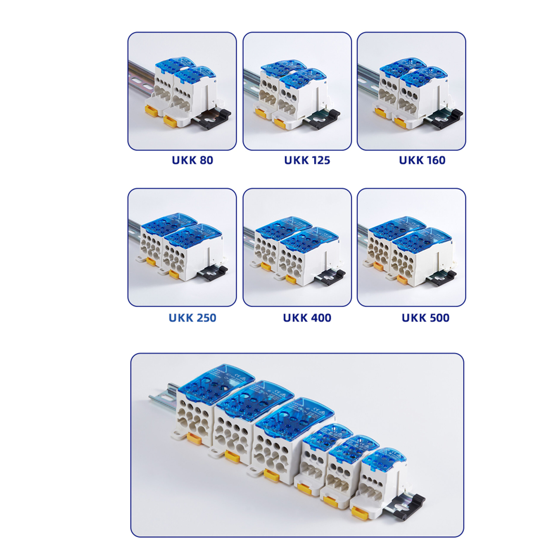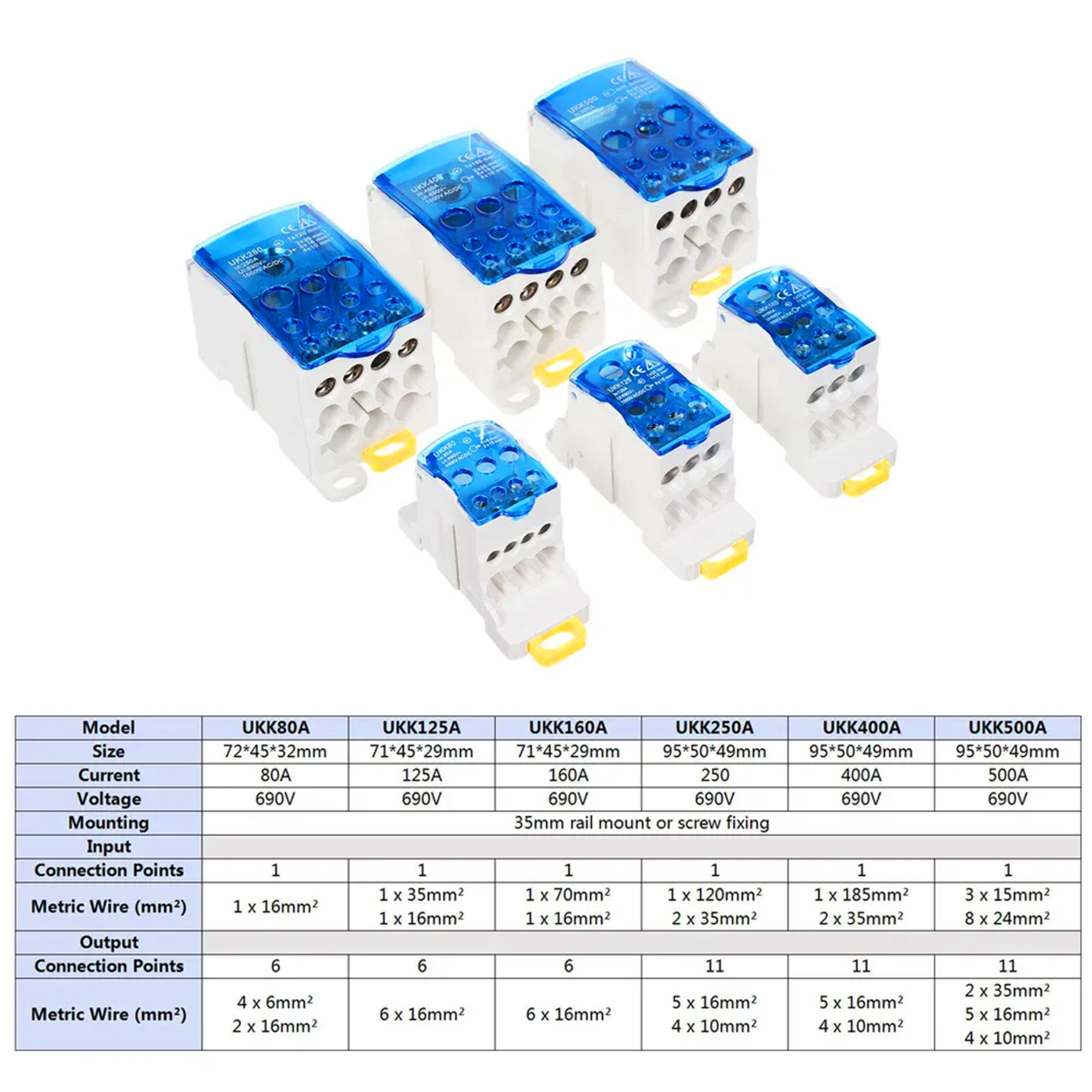 | UKK160 | 160 | 690 | IP 20 | 1х (10-70) 1х (2,5-16) | 6х(2,5-16) | 71х46х29 |