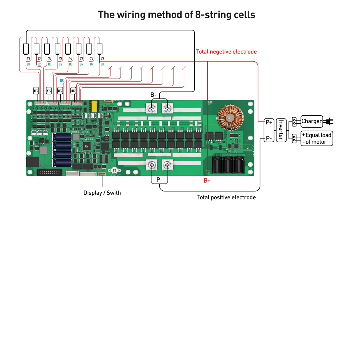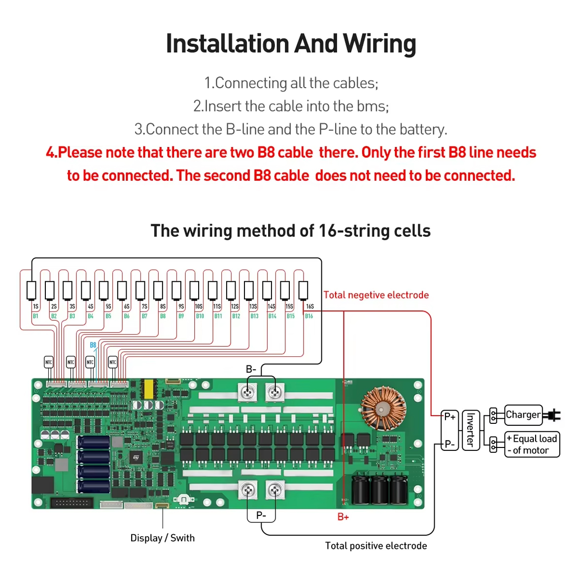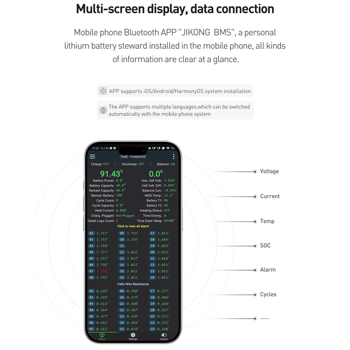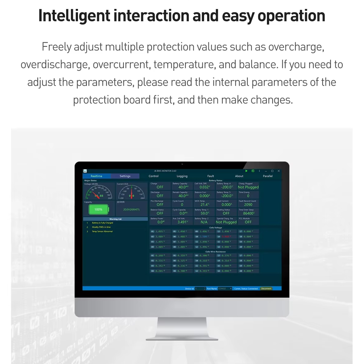 Інверторна BMS JK Smart PB1A16S10P 100A – це сучасна система керування батареями, призначена для роботи з інверторами. Вона підтримує до 16 послідовно підключених комірок та забезпечує захист від перезаряду, перерозряду, перегріву та короткого замикання. З номінальним струмом 100А ця BMS підходить для потужних акумуляторних систем, таких як електромобілі та системи зберігання енергії. Вона легко інтегрується в існуючі інверторні системи, що робить її ідеальним вибором для створення ефективних та безпечних енергосистем. Особливості: Smart BMS PB1A16S10P має вбудовану систему активного балансування кожної комірки струмом до 1А з окремими налаштуваннями, яке дозволяє відстежувати напругу кожної комірки в режимі реального часу та покращувати термін служби батареї за рахунок активного керування балансуванням;