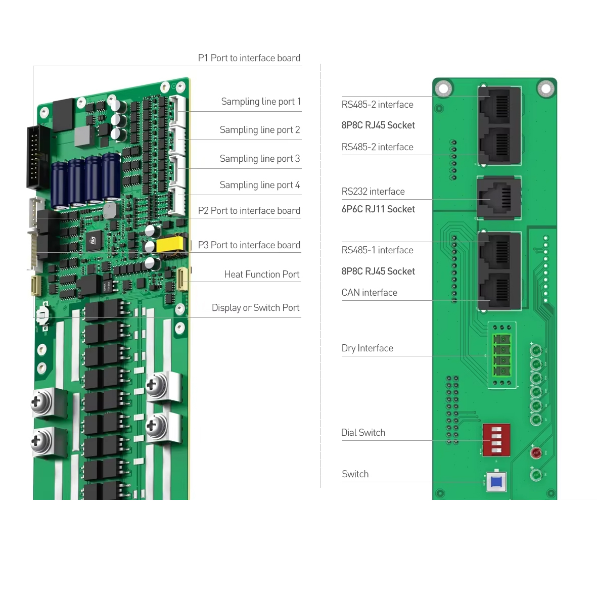 Комунікаційна плата зі світлодіодною індикацією рівня заряду та стану акумуляторної збірки, роз'ємами RS232/RS485/CAN типу кручена пара, перемикачі управління роз'ємами RS232/RS485/CAN;