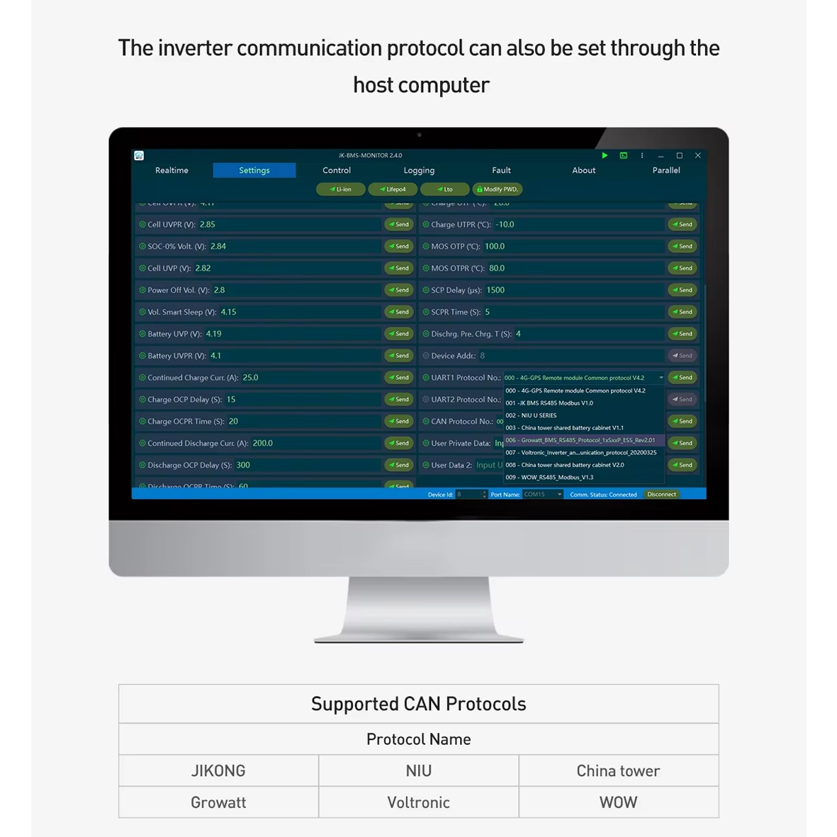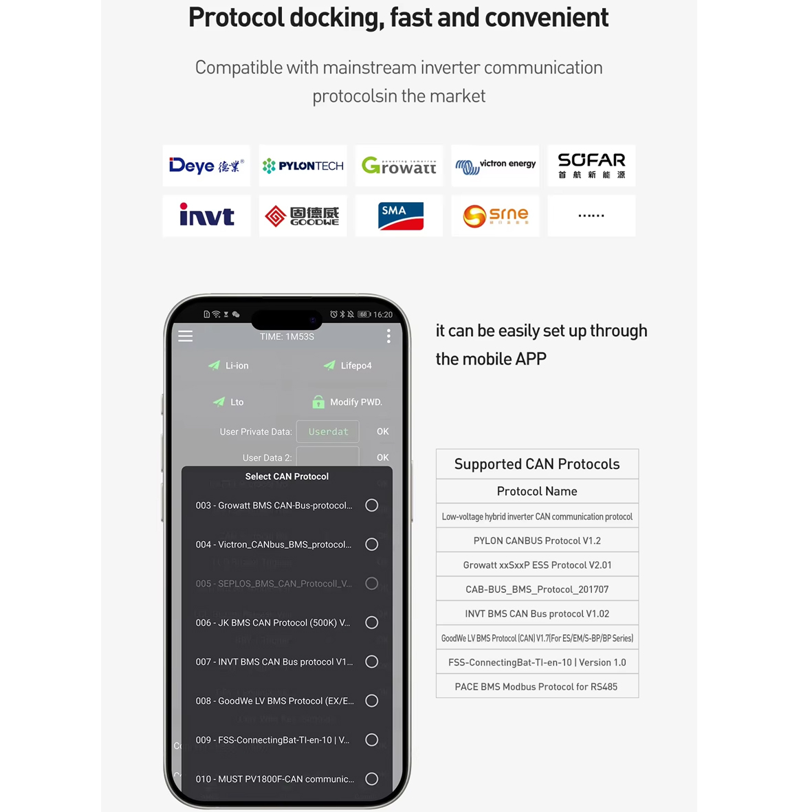 JiKong BMS PB1A16S10P 100A 8S-16S нового покоління має шини CAN, RS485, RS232 та підтримує протоколи обміну більшості інверторів та систем зберігання енергії (Pylon, Deye, Victron, Must, Growatt, Axioma, GoodWe тощо);