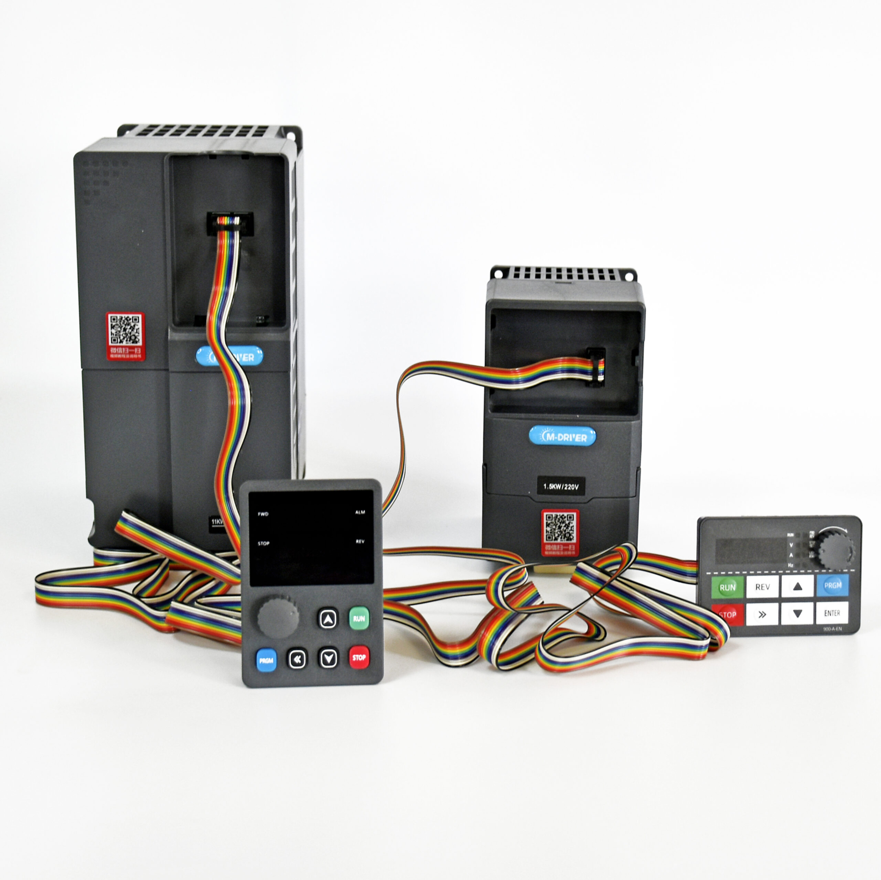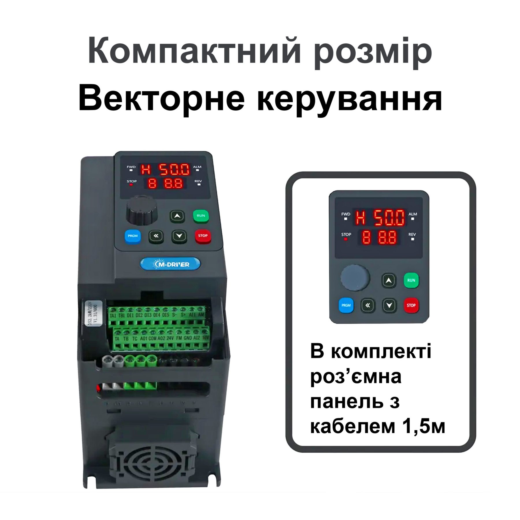 Постійно у продажу високоякісні частотні перетворювачі промислового типу векторні з постійним моментом для двигунів 0,5 кВт – 55 кВт 380В, а також потужніші моделі на замовлення. Широкий вибір вхідної напруги - 3фази 380В, 1фаза 220В, перетворювач з 1фази 220В на вході на 3фази 380В на виході. В наявності додаткові гальмівні опори для керування швидкістю обертання високонавантажених двигунів, потенціометри, датчики для управління тиском насосів та інше. Наші частотні перетворювачі забезпечують автоматичний захист двигуна за напругою, струмами, моментом, захист від перекосу фаз, від перегріву та короткого замикання на виході. Розраховані на короткочасні навантаження до 150% протягом 60сек і 180% протягом 10сек. Оснащені найпрогресивнішим контролером управління з безліччю функцій. Мають виносний пульт управління з потенціометром (подовжується звичайним UTP кабель з RJ 45 connector). Друковані плати із захисним лаком. Електронні компоненти кращих світових виробників NXP, Toshiba, Avago ON. Керамічні конденсатори Samsung. Мають пиле та вологозахист, надійну систему вентиляції та охолодження з можливістю легкого доступу для очищення. Посилений захист від перешкод (EMC EMI). Вбудований гальмівний модуль. Управління швидкістю обертання двигуна за допомогою встановлених налаштувань (16 ступенів), аналогове керування (потенціометром, 0-10В, 4-20мА), цифрове, MODBUS (RS-485). Наші частотні перетворювачі мають вбудовану функцію для плавного регулювання та керування тиском насосів, гідростанцій тощо із завданням нижнього та верхнього порогу тиску. Для цього буде потрібно додатковий недорогий датчик тиску, який ви можете придбати у нас.