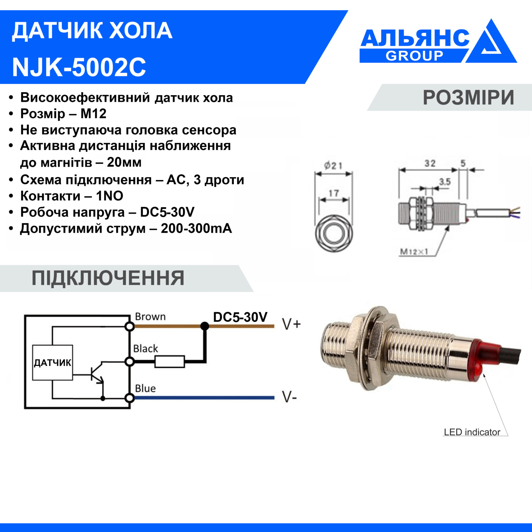 Продаємо Датчик Холла Зближення. Датчик застосовується як кінцеві і базові датчики ЧПУ осей, для контролю положення рухомих об'єктів. Висока повторюваність спрацьовування. Датчик не вимагає налаштування, легко монтується за допомогою двох гайок та двох гроверів . Датчик базується на елементі Холла. Зона спрацьовування датчика 0-20 мм. На задній торцевій частині датчика встановлено червоний світлодіод індикації.NJK-5002C DC5-30V12mm діаметр,3-Wire, NPN, NO contact,не виступаюча плоска головка сенсора,до 20 mm робоча дистанція,200-300mA допустимий струм