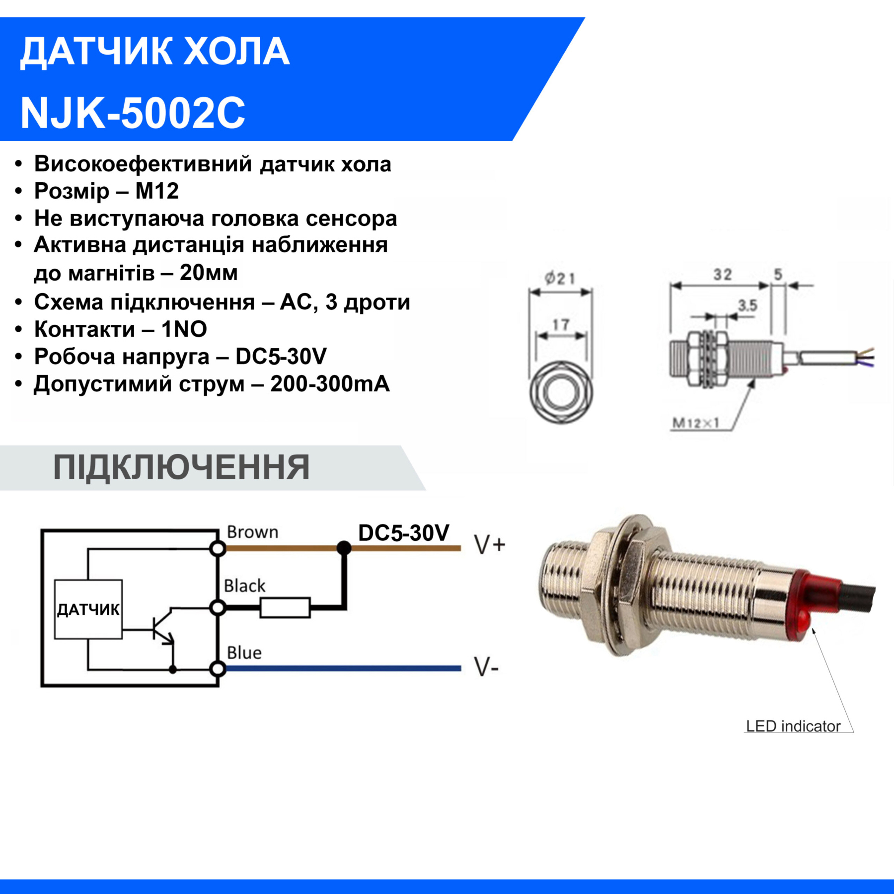 - Підключення: 3-Wire (коричневий – VCC, синій – GND, чорний – вихід)