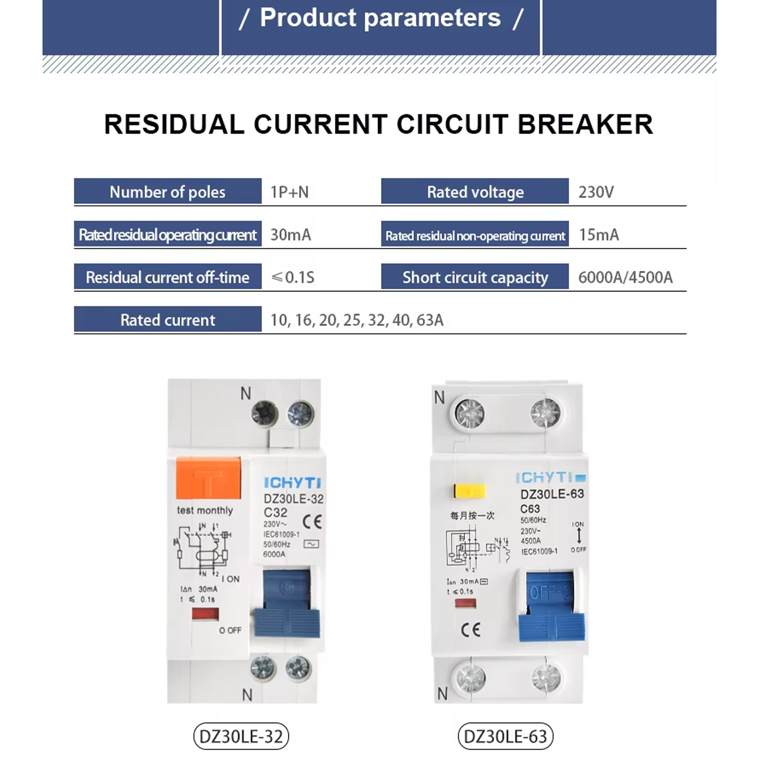 Модель продукту - DZ30LE-16 Полюси - 2(1P+N) Номінальний струм (A) - 16А Номінальний різницевий струм спрацювання, робочий струм (мА) - 30мА Номінальний різницевий струм спрацювання, неробочий струм (мА) - 15мА Номінальна напруга (В) - 230В Час вимкнення (спрацювання) - ≤0,1S Розмикаюча здатність (lcu) - 6000A
