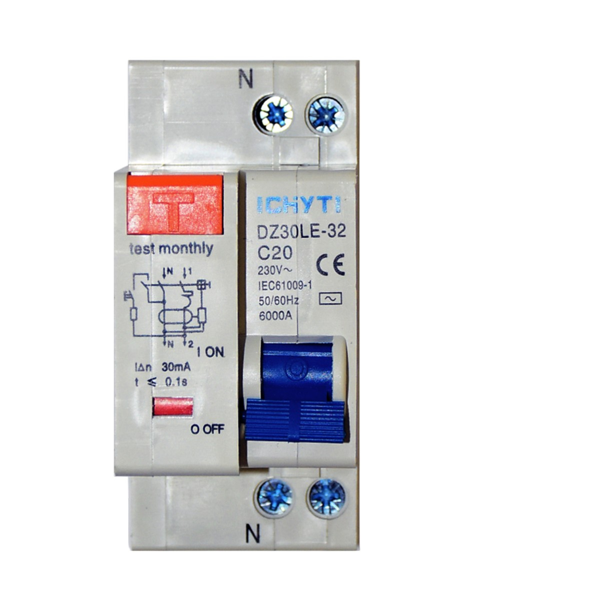 Модель продукту - DZ30LE-20 Полюси - 2(1P+N) Номінальний струм (A) - 20А Номінальний різницевий струм спрацювання, робочий струм (мА) - 30мА Номінальний різницевий струм спрацювання, неробочий струм (мА) - 15мА Номінальна напруга (В) - 230В Час вимкнення (спрацювання) - ≤0,1S Розмикаюча здатність (lcu) - 6000A