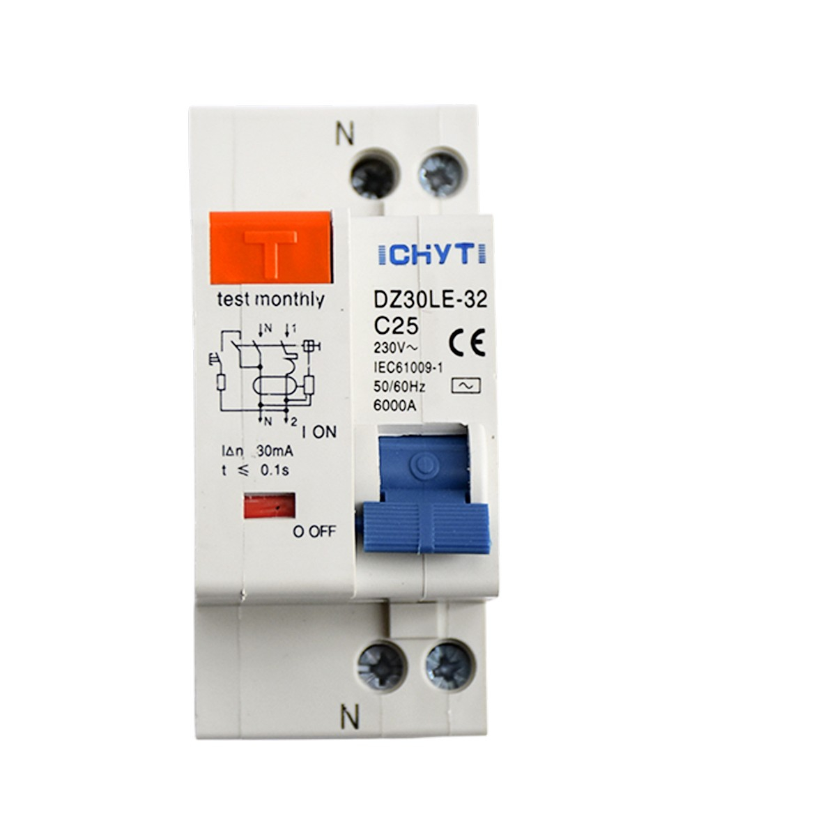 Модель продукту - DZ30LE-25 Полюси - 2(1P+N) Номінальний струм (A) - 25А Номінальний різницевий струм спрацювання, робочий струм (мА) - 30мА Номінальний різницевий струм спрацювання, неробочий струм (мА) - 15мА Номінальна напруга (В) - 230В Час вимкнення (спрацювання) - ≤0,1S Розмикаюча здатність (lcu) - 6000A