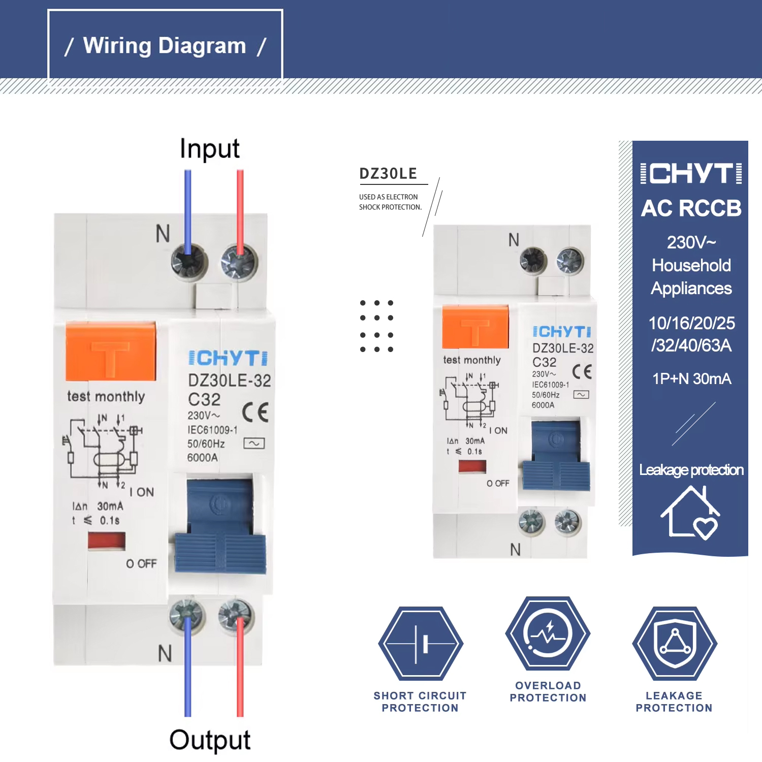 Модель продукту - DZ30LE-63 Полюси - 2(1P+N) Номінальний струм (A) - 63А Номінальний різницевий струм спрацювання, робочий струм (мА) - 30мА Номінальний різницевий струм спрацювання, неробочий струм (мА) - 15мА Номінальна напруга (В) - 230В Час вимкнення (спрацювання) - ≤0,1S Розмикаюча здатність (lcu) - 4500A