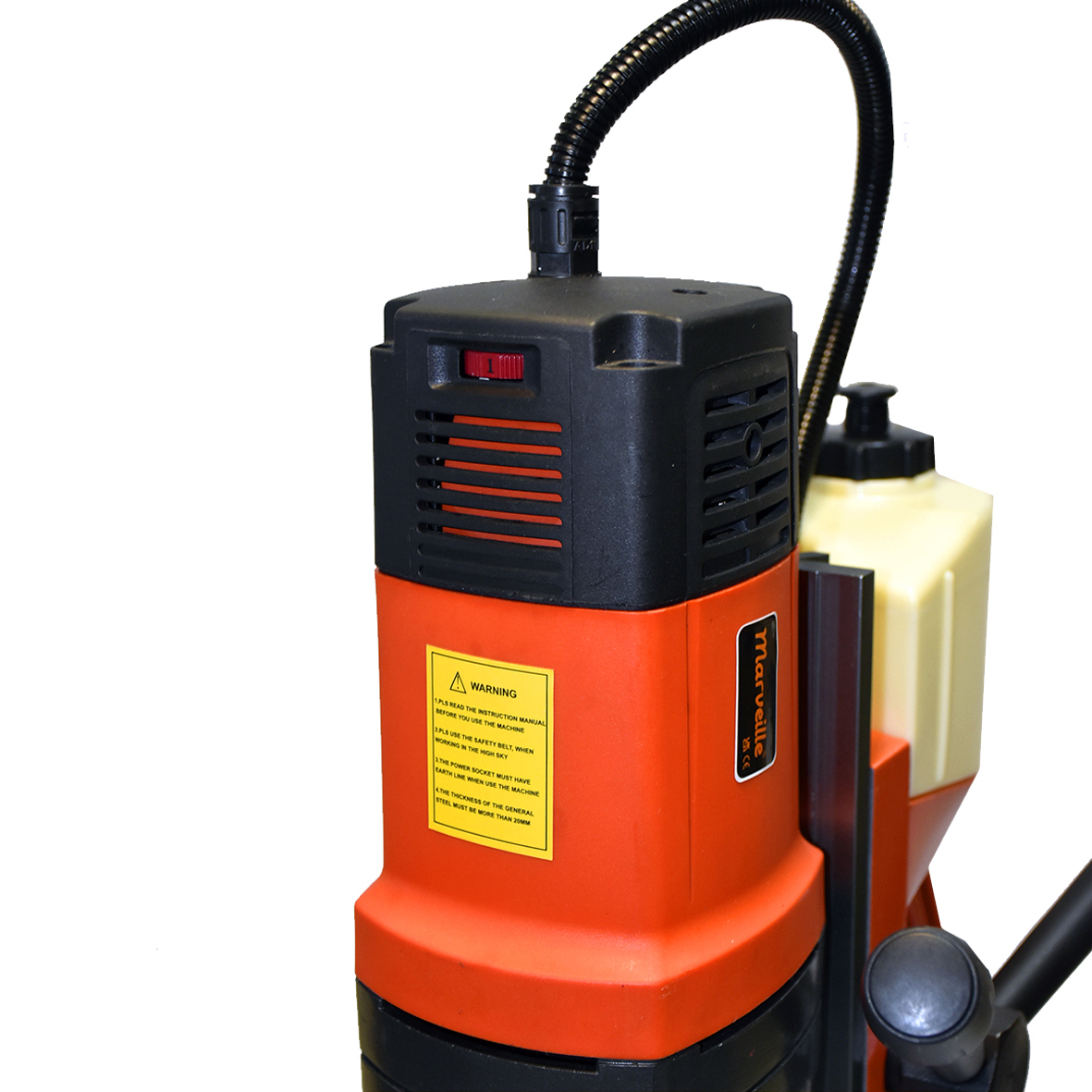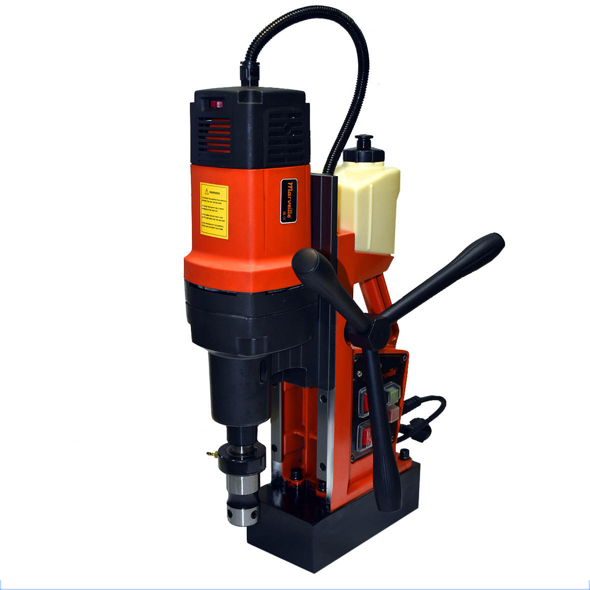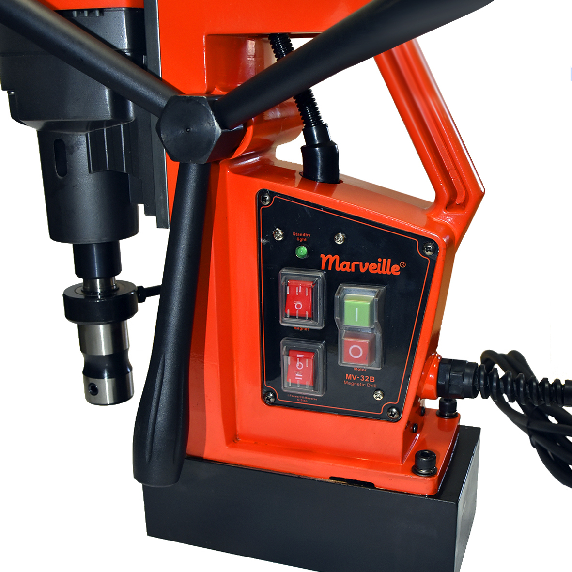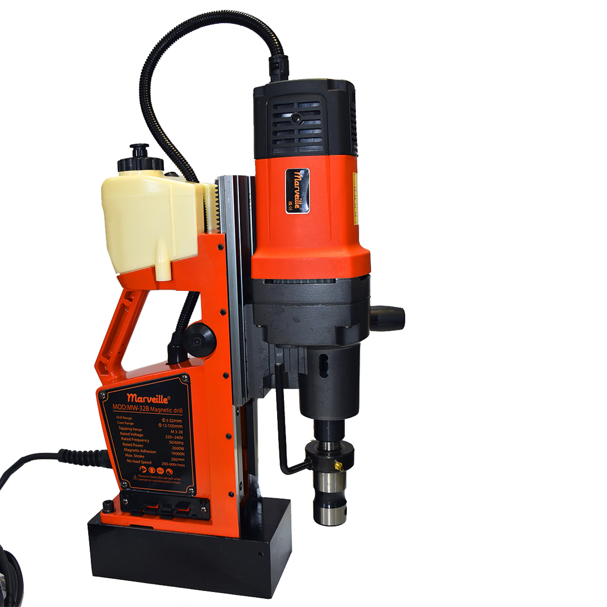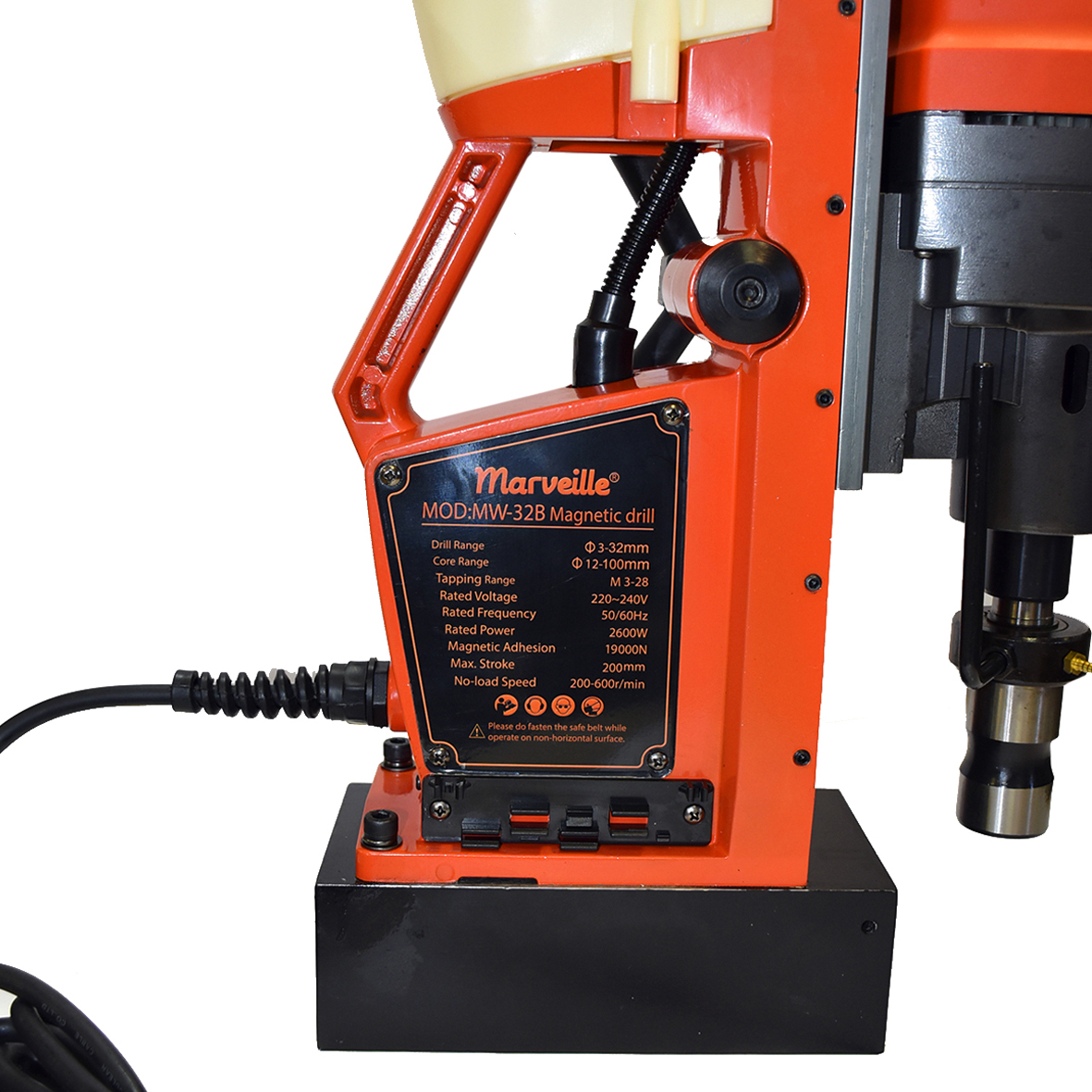 Макс. диам. сверла: ≤ Φ32 мм Макс. діам. наріз. резьби: ≤ Φ28 мм Макс діам. кільцевої фрези: ≤ Φ60 мм Номінальна напруга: 220-240В Номінальна частота: 50-60 Гц Магнітна адгезія: 19000 Н Номінальна споживана потужність: 2600 Вт Швидкість холостого ходу: 200-600 об/хв Хід: 190 мм Хвостовик Weldon: MT3 з конусом Морзе MT3 з патроном 16 мм з бесступенчатой регулировкой скорости з вращением вперед и назад з функцією нарізання різьби з конусом