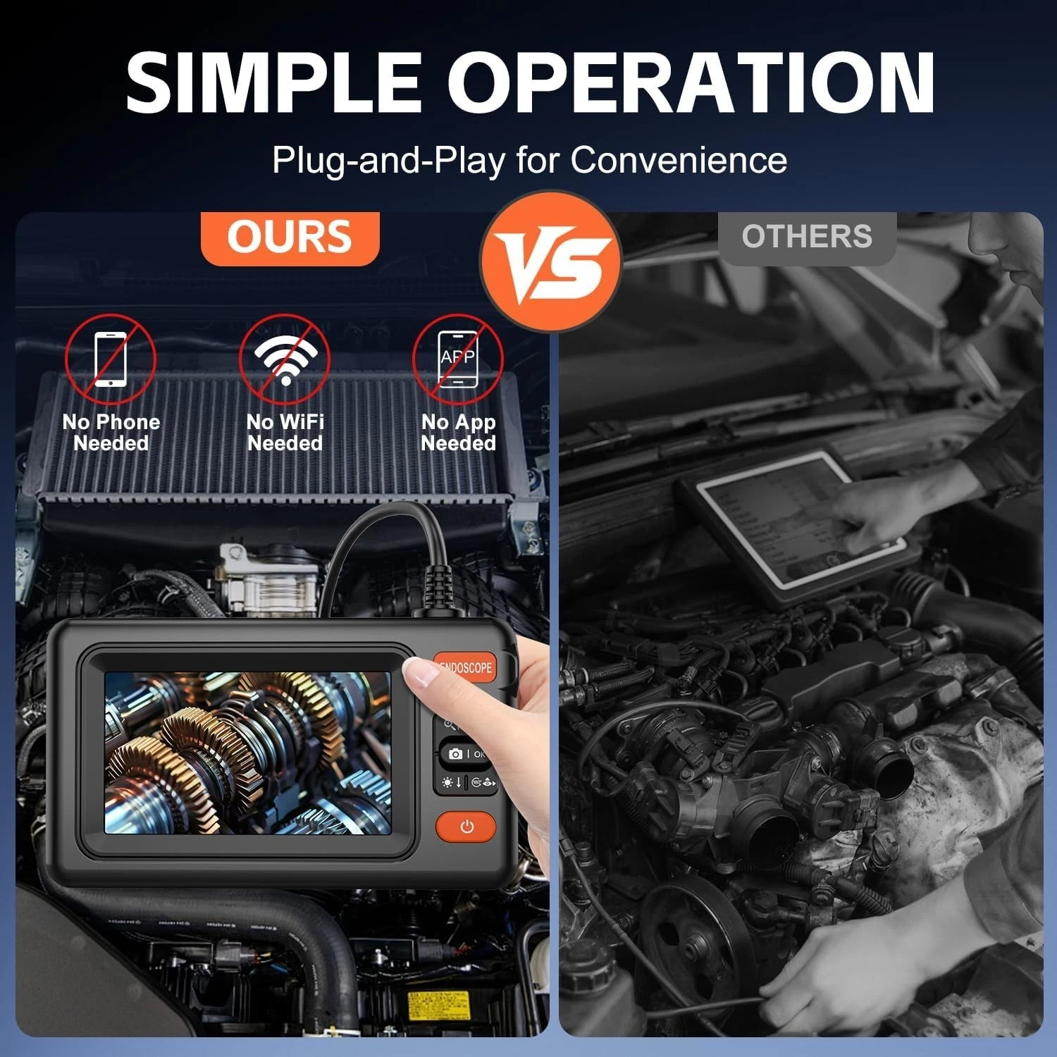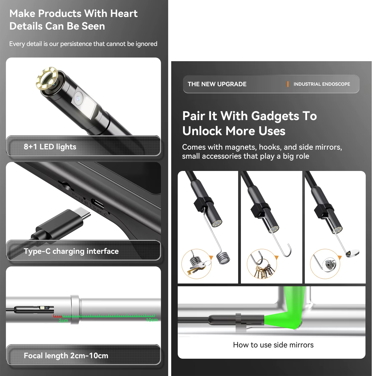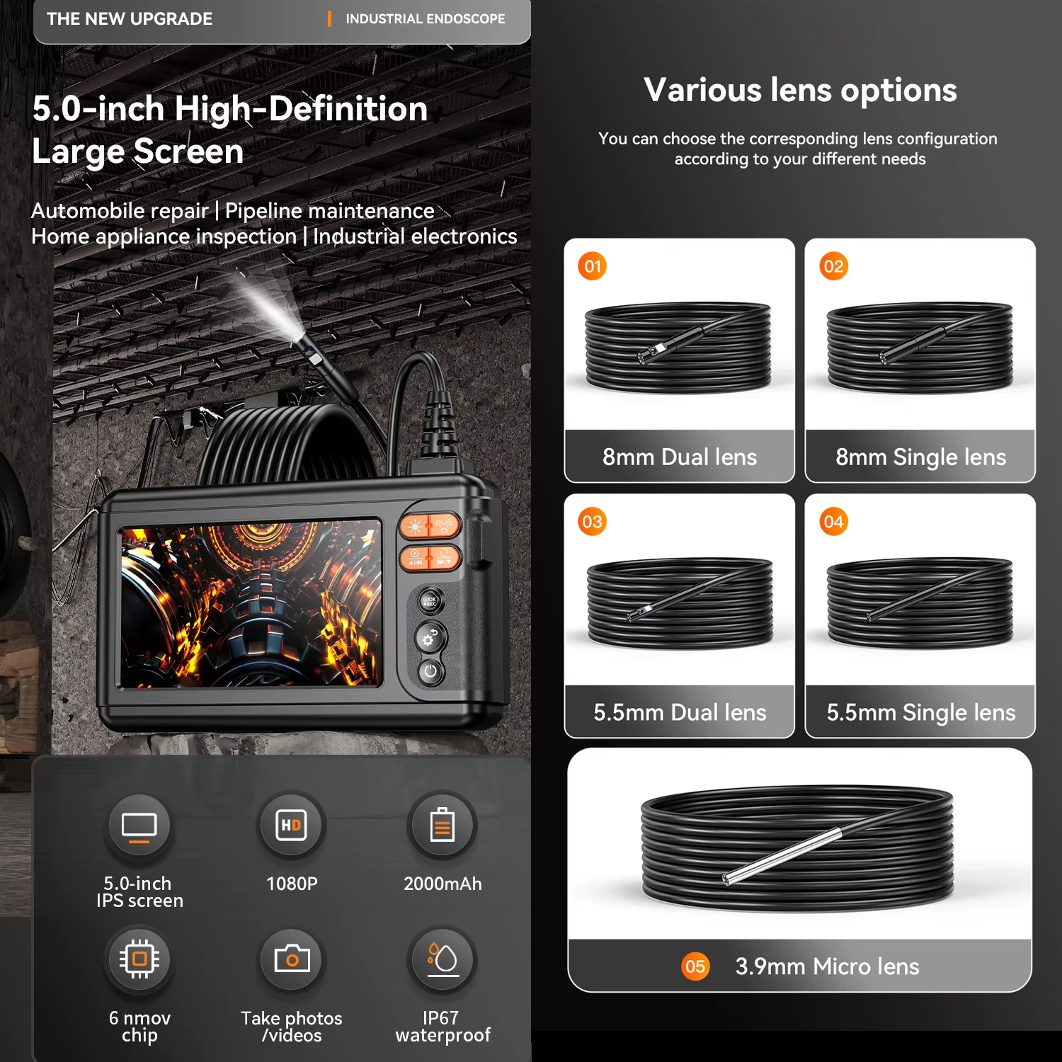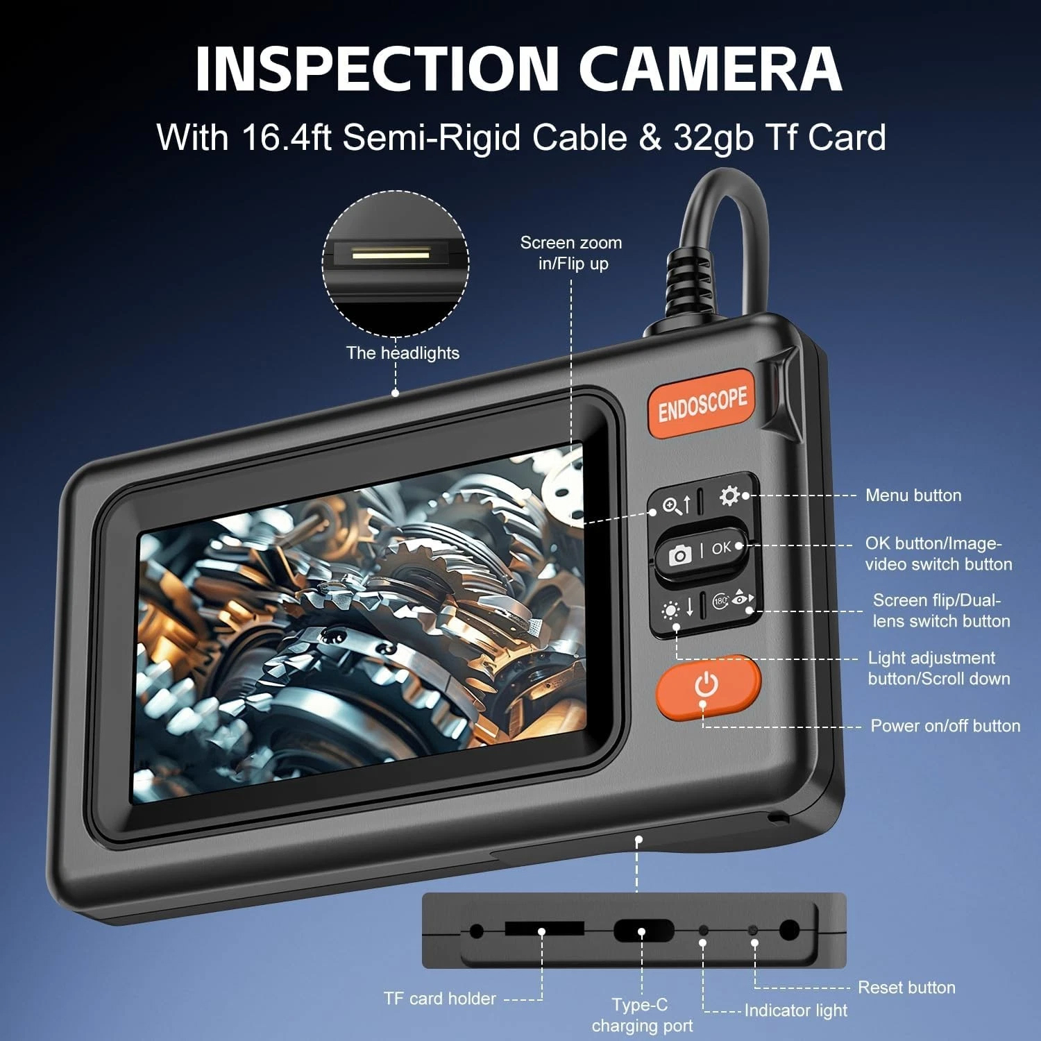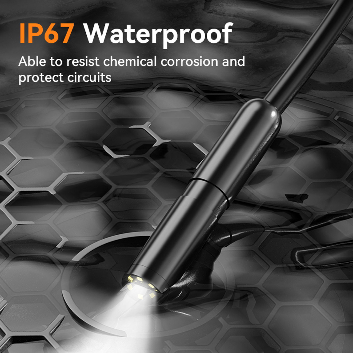 Ендоскоп ANESOK C50 - це сучасний ендоскоп компанії ANESOK, що має 2 потужні камери діаметром 8мм з підсвіткою - фронтальну і бічну. Бічна камера обертається на 360°, при цьому ви можете переключатись між камерами, або виводити зображення з обох одночасно на великий IPS дисплей з діагоналлю 5 дюймів. Пристрій має всі необхідні для спостереження функції – запис фото, відео, регулювання яскравості підсвітки обох камер, багатомовне зручне меню і інтерфейс, довгий 10 метровий кабель і набір з гачками і магнітом для діставання предметів за допомогою зонду.