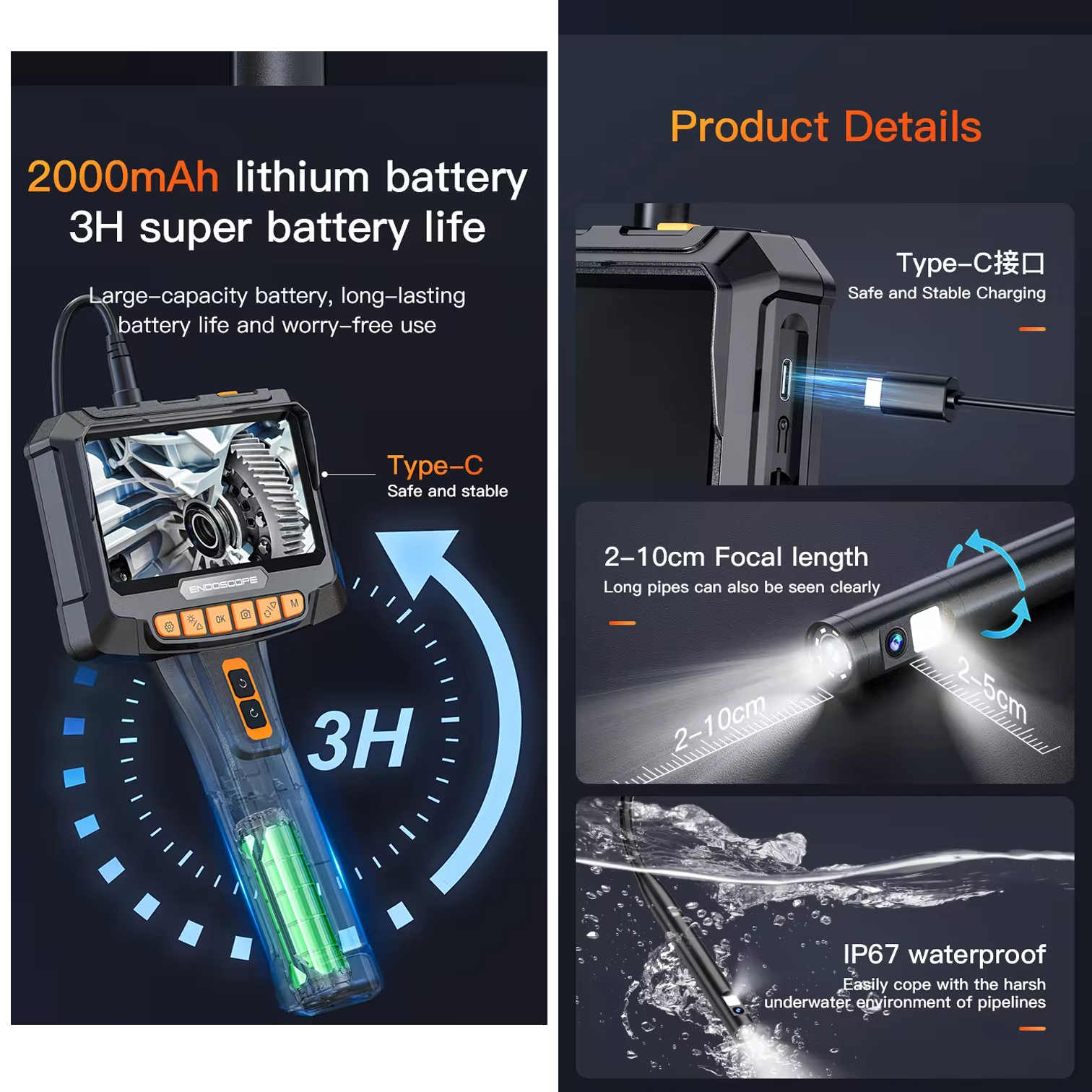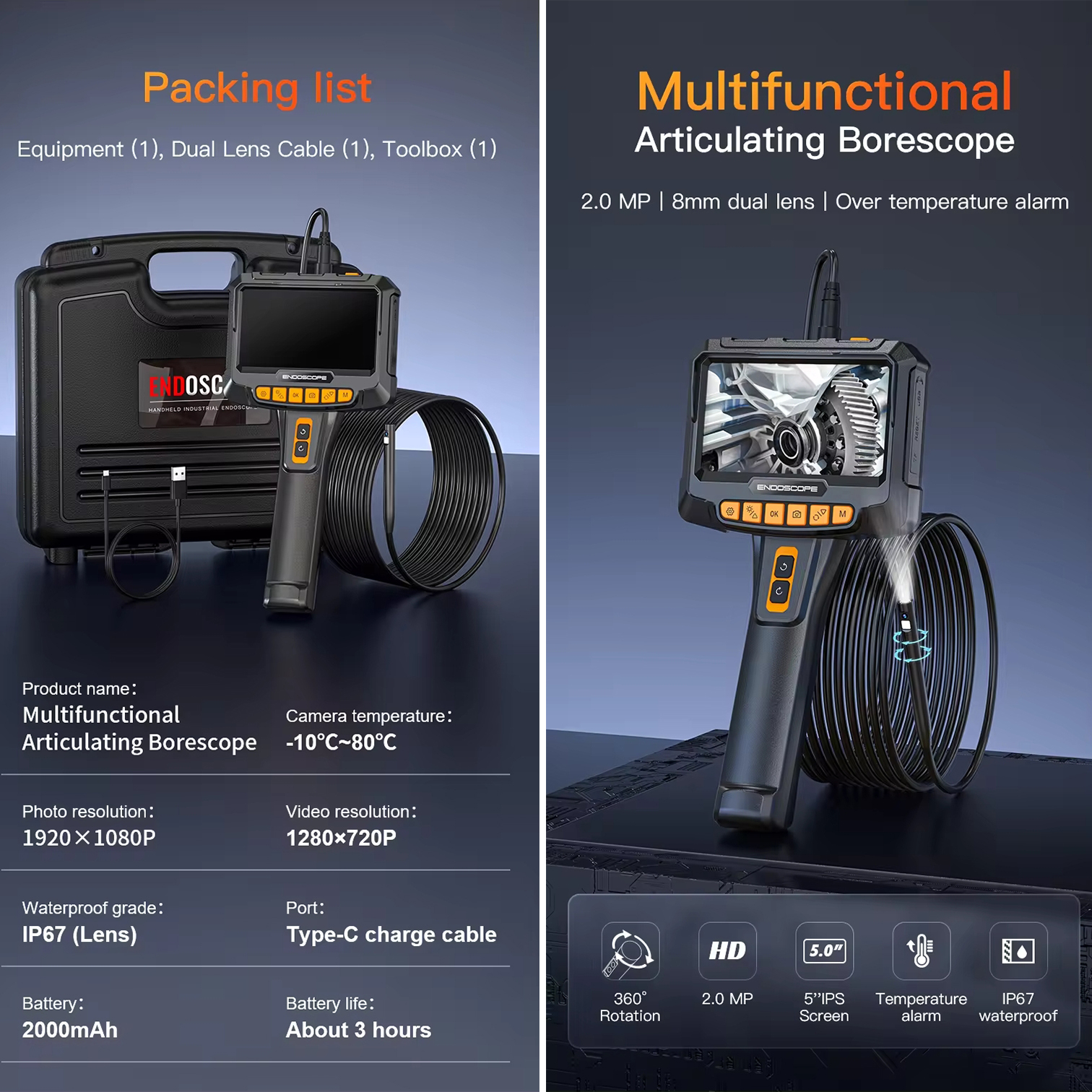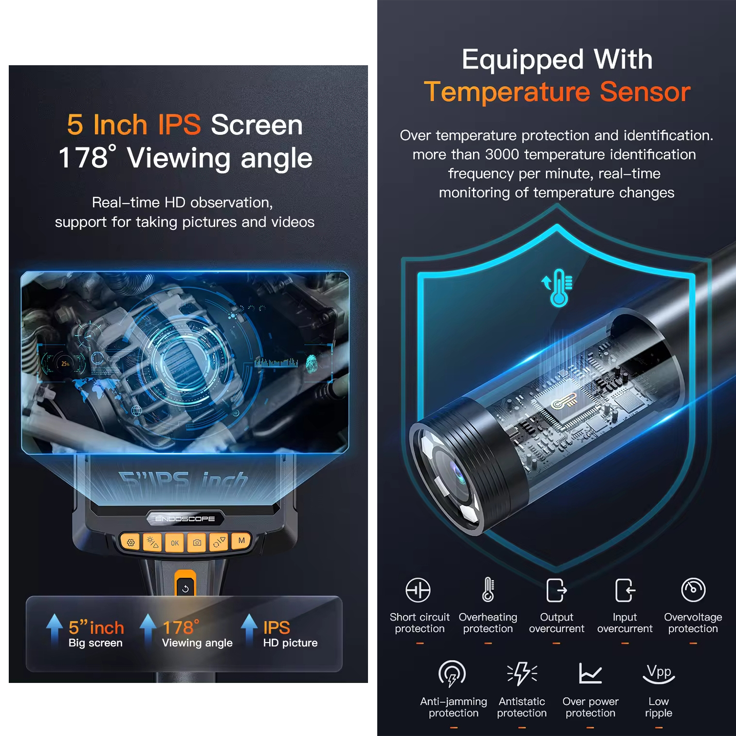 Ендоскоп поворотний ANESOK G10 PRO - це найновіший ендоскоп компанії ANESOK, що має 2 потужні камери з підсвіткою - фронтальну і бічну. Бічна камера обертається на 360°, при цьому ви можете перемикатися між камерами, або виводити зображення з обох одночасно на великий IPS дисплей з діагоналлю 5 дюймів. Пристрій має всі необхідні для спостереження функції – запис фото, відео, регулювання яскравості підсвітки обох камер, багатомовне зручне меню і інтерфейс, довгий 5 метровий кабель і набір з гачками й магнітом для діставання предметів за допомогою зонду. Характеристики ендоскоп поворотний: