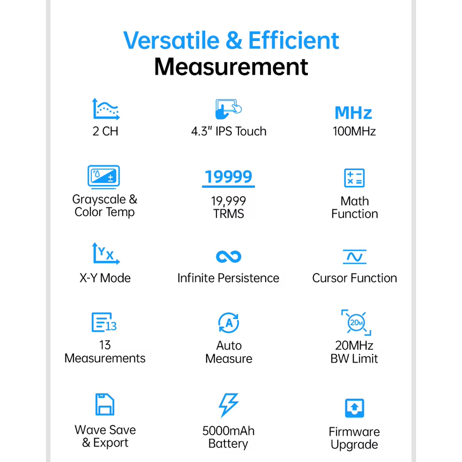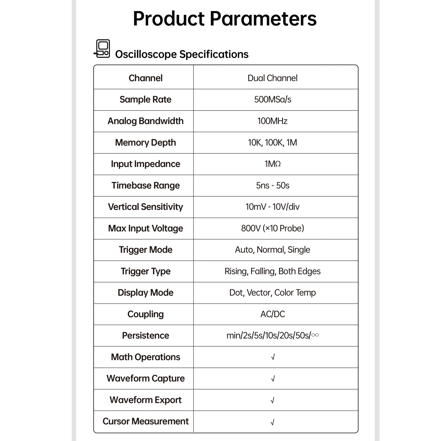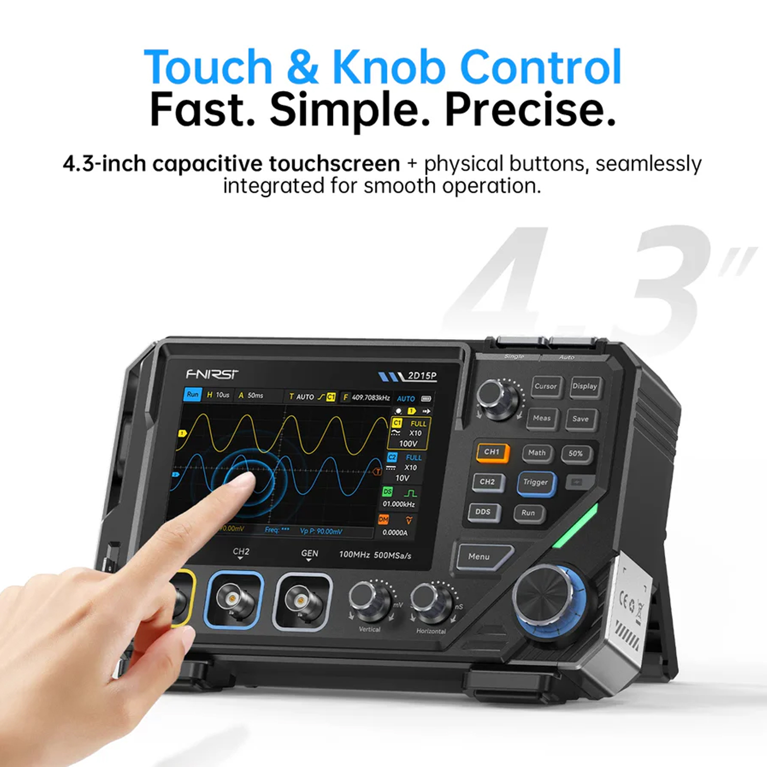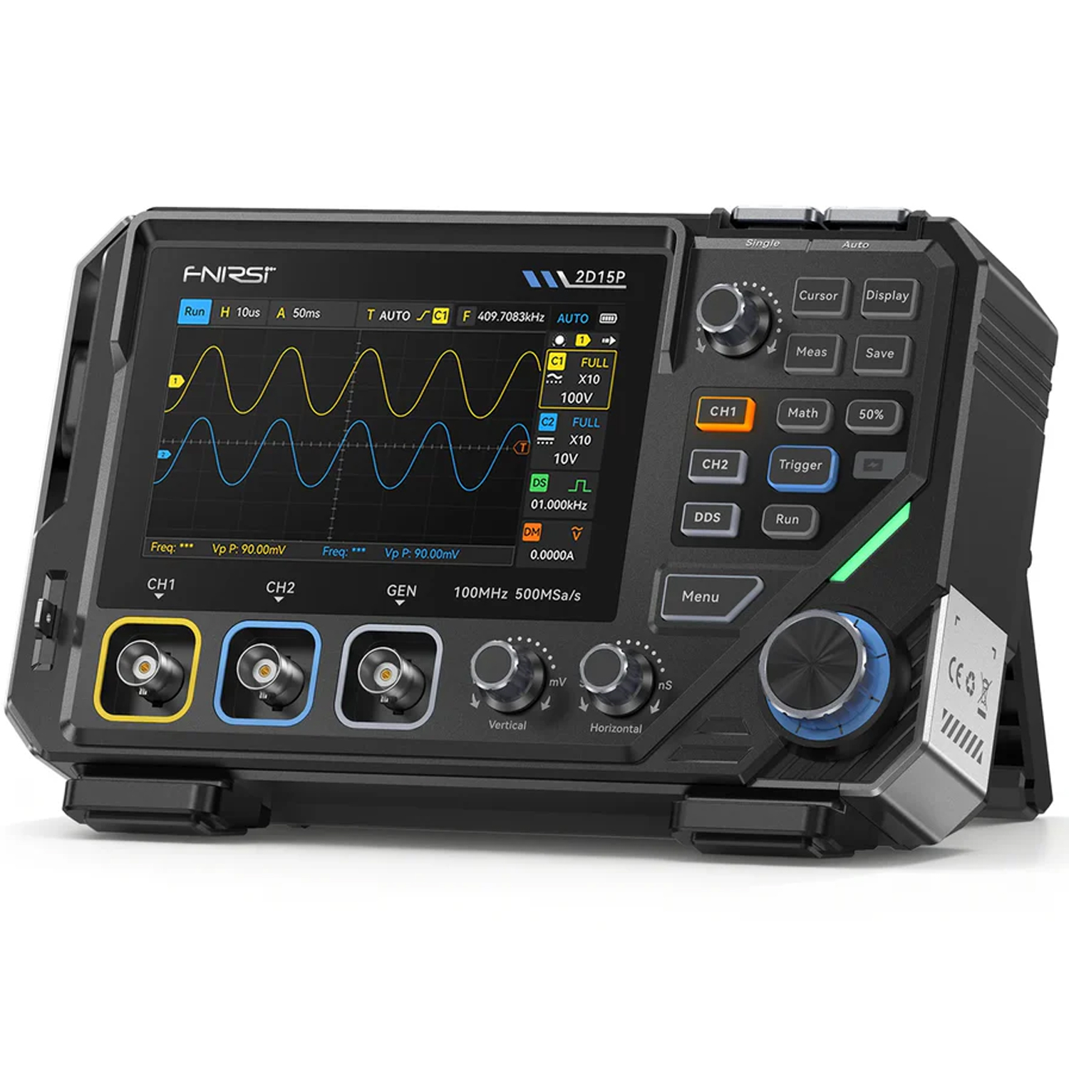 FNIRSI 2D15P поєднує фізичні кнопки з 4,3-дюймовим ємнісним сенсорним екраном. Він пропонує дискретизацію 500 Мвиб/с, пропускну здатність для одного каналу 100 МГц (двоканальний режим 50 МГц) та глибину пам'яті від 10 тис. до 1 МБ. Функції включають 128-рівневий дисплей у градаціях сірого, захоплення сигналів зі швидкістю 1200 кадрів/с, математичні функції, 18 автоматичних вимірювань, генератор сигналів з частотою 10 МГц та мультиметр True RMS з 19999 відліками, що підтримує тестування напруги, струму, опору, ємності, діодів та перевірки провідності кола.