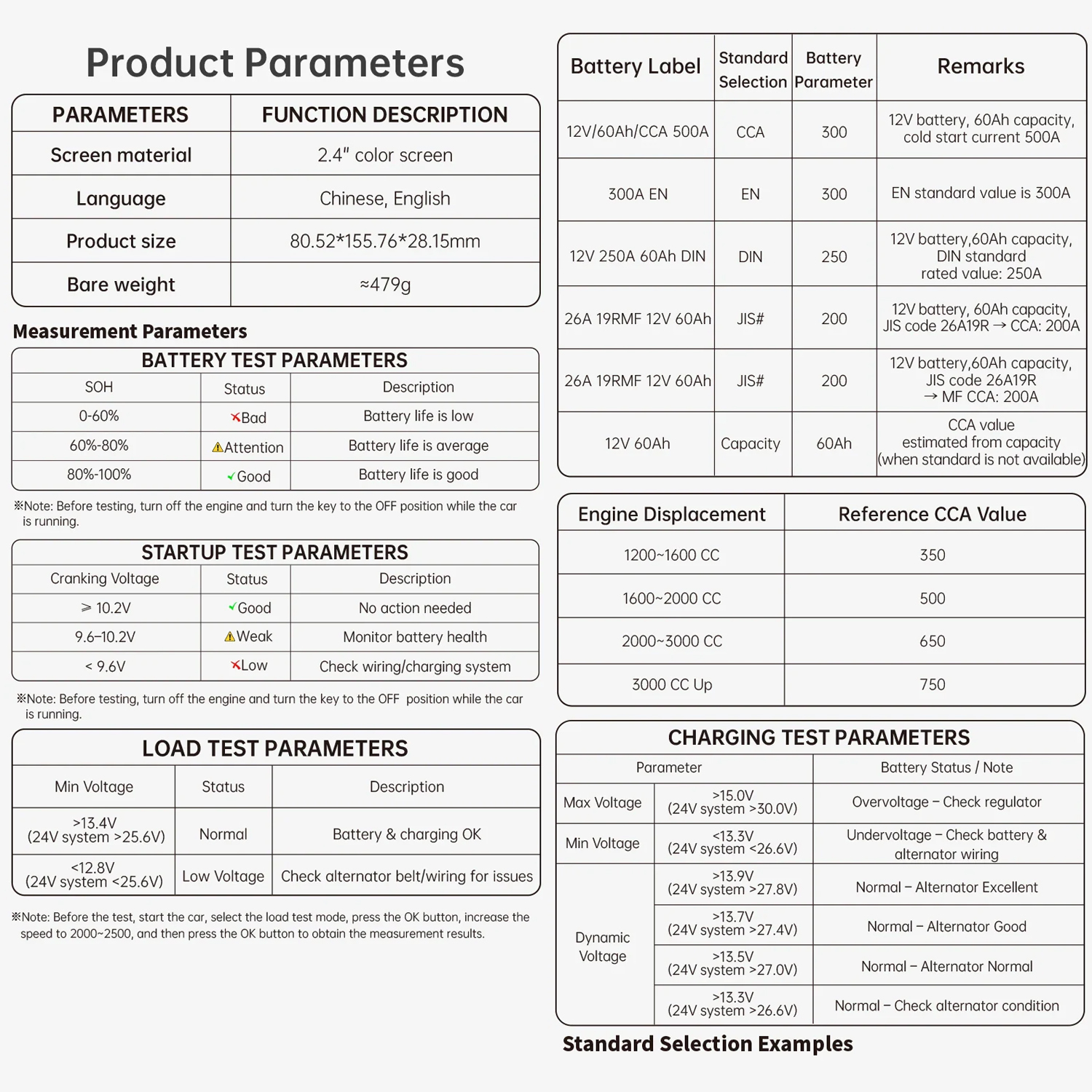 - 6 міжнародних стандартів для акумуляторів : CCA, IEC, EN, DIN, JIS та GB для глобальної точності.