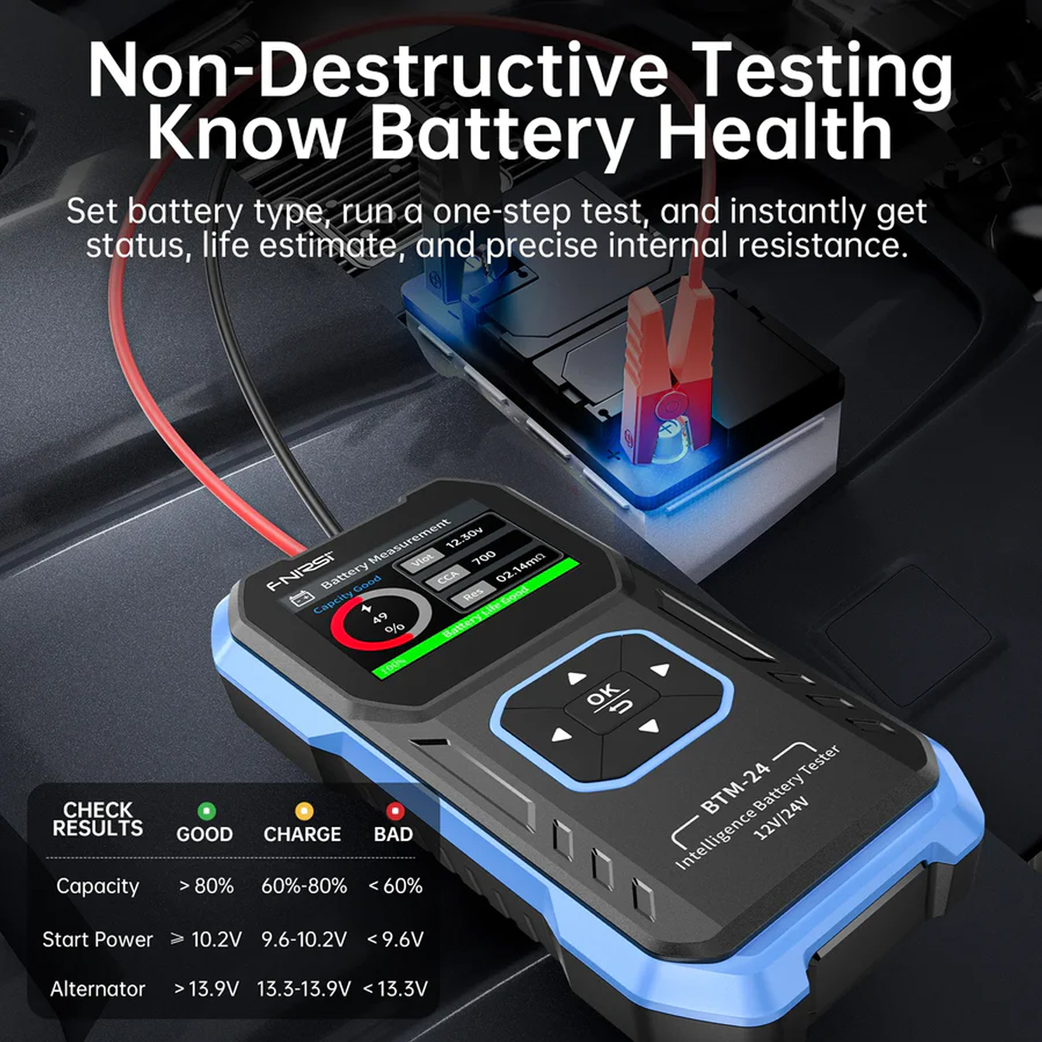- Комплексна діагностика : вимірює напругу, внутрішній опір, стан заряду (SoC), стан справності (SoH), номінальний зарядний струм (CCA) та характеристики навантаження.