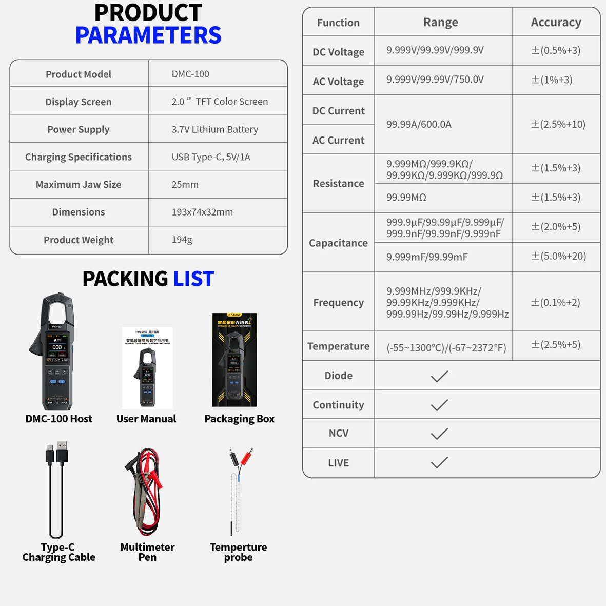 FNIRSI DMC-100 — це високоточний інтелектуальний струмомір із 10 000 лічильниками, що охоплює надширокий діапазон напруги 750 В та струму 600 А, що дозволяє легко використовувати його для інженерного обслуговування, лабораторних досліджень, капітального ремонту транспортних засобів або діагностики домашньої електропроводки. Основні моменти : Високоточне та широкодіапазонне вимірювання : пропонує 10 000 істинних RMS-значень з підтримкою напруги до 750 В та струму 600 А, що робить його придатним для різних застосувань. Розширений дисплей та інтерфейс : оснащений 2,0-дюймовим повнокольоровим TFT-екраном з роздільною здатністю 240 × 320, що має інтуїтивно зрозумілий інтерфейс користувача, регульовану яскравість та візуалізацію кривої даних для чітких та зручних показників. Універсальна функціональність : підтримує три режими вимірювання (звичайний, сигнальний та потужний), а також безконтактне виявлення напруги NCV та ідентифікацію нульової/пожежної лінії для покращеного використання. Надійна потужність та ефективність : Живлення від довговічного акумулятора 3,7 В 1500 мАг з інтелектуальним автоматичним вимкненням для подовження терміну служби акумулятора. Зручні функції : ліхтарик, підсвічування екрана та опції збереження даних, що робить його практичним та надійним інструментом для різних сценаріїв. Особливості: