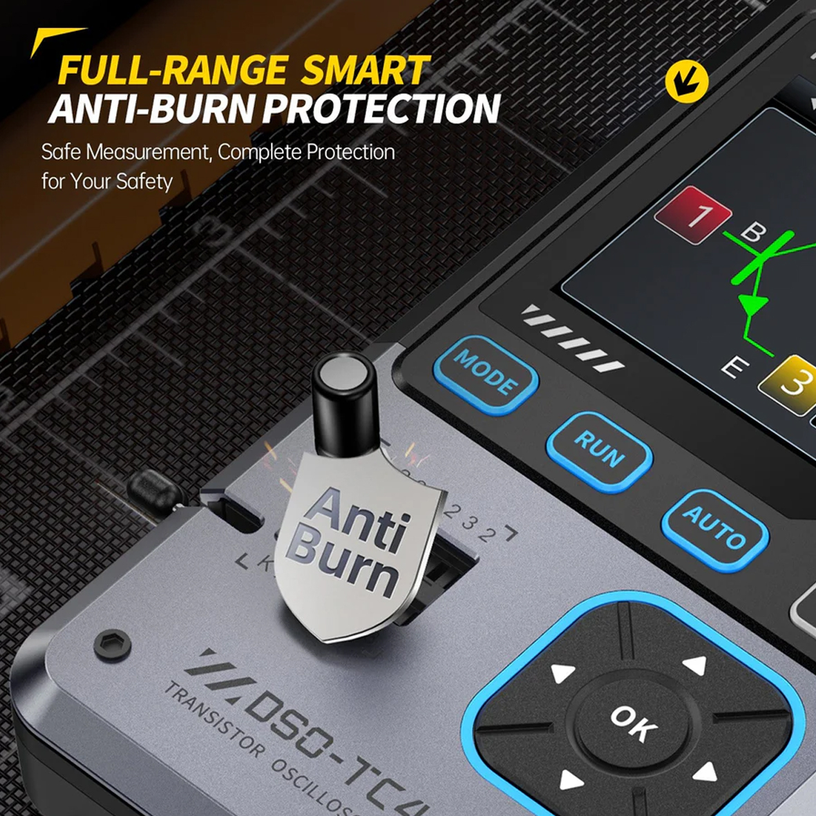 DSO-TC4 — це багатофункціональний транзисторний осцилограф, випущений FNIRSI, який є універсальним та практичним, і розроблений для галузей технічного обслуговування та досліджень і розробок. Він об'єднує осцилограф, генератор сигналів і транзистор. Основні моменти : ◉ Багатофункціональний інструмент : поєднує осцилограф, тестер транзисторів та генератор сигналів в одному оновленому пристрої для універсального використання. ◉ Розумний захист від вигорання : повний діапазон захисту забезпечує безпечні вимірювання в усіх режимах. ◉ Високопродуктивний осцилограф : смуга пропускання 10 МГц, частота дискретизації 48 Мвиб/с, максимальна вхідна напруга 400 В. Автоматичний режим одним дотиком для швидкого та точного захоплення сигналу. ◉ Ідентифікація компонентів : Перевірка діодів, стабілітронів, тріністорів, конденсаторів, резисторів, котушок індуктивності, транзисторів, MOSFET та інших компонентів одним кліком. ◉ Кольоровий TFT-дисплей : 2,8-дюймовий TFT-екран високої роздільної здатності для чіткої візуалізації осцилограм та даних. Основні характеристики продукту: Функції осцилографа: