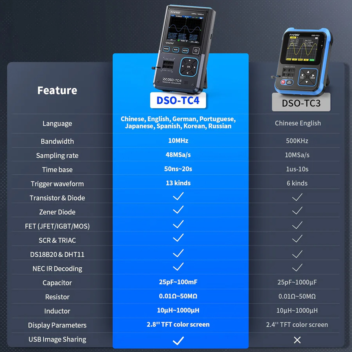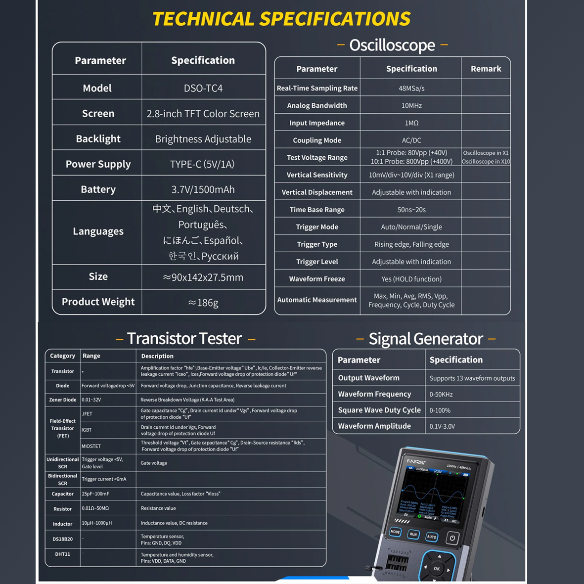 FNIRSI DSO-TC4, тестер електр. компонентів / портативний осцилограф 10 МГц / генератор сигналів