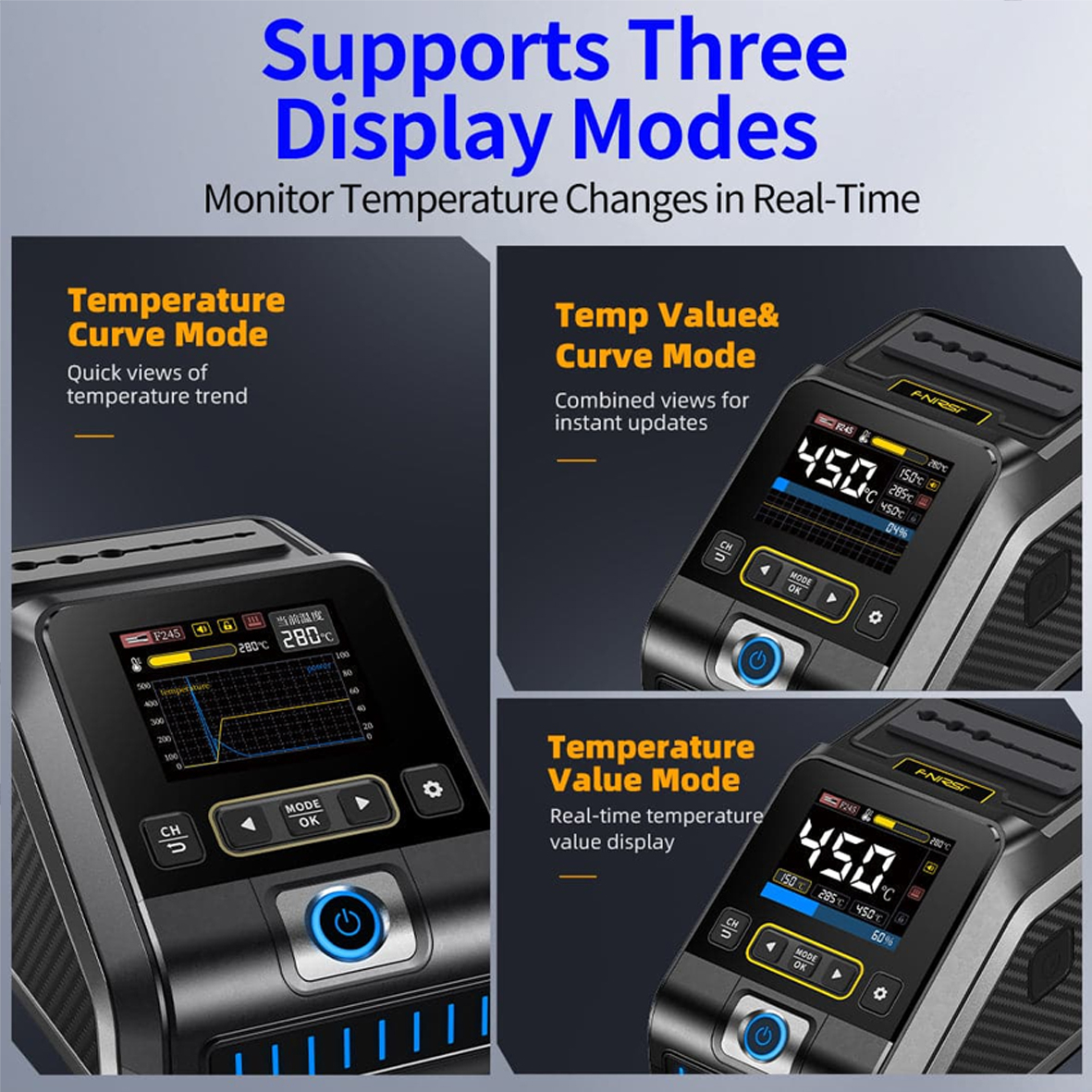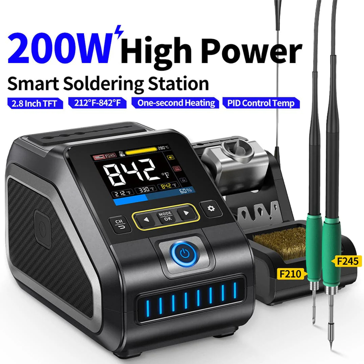 Паяльна станція FNIRSI DWS-200 це високопотужна прецизійна паяльна станція (200 Вт) з регульованим діапазонрм температур від 100℃ до 450℃ (від 212℉ до 842℉). Має режим динамічної температурної кривої для розширеного моніторингу, підтримку перетворення між градусами Цельсія та Фаренгейта, попередньо встановлені три набори значень температури для швидкого налаштування. Характеристики: Екран: 4,8-дюймовий TFT-екран Діапазон температур: 100–450 ℃ Пікова потужність: 200 W (макс.) Вхідна напруга: 100-240 В (змінного струму) Вхідний струм: 3А Тип ручки: ручка F210, F245 Розміри: 156*96*103 мм Комплектація DWS-200 + F210 + 3 Tips: Хост-пристрій: 1 Підставка для паяльника: 1 Ручка F210: 1 Насадки K/I/JS: 3 Допоміжні руки: 2 Кабель живлення EU: 1 З'єднувальний кабель: 1 Корисне відео