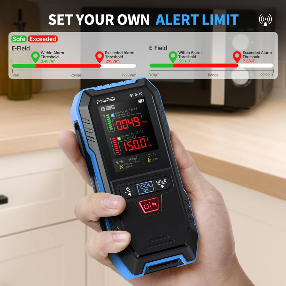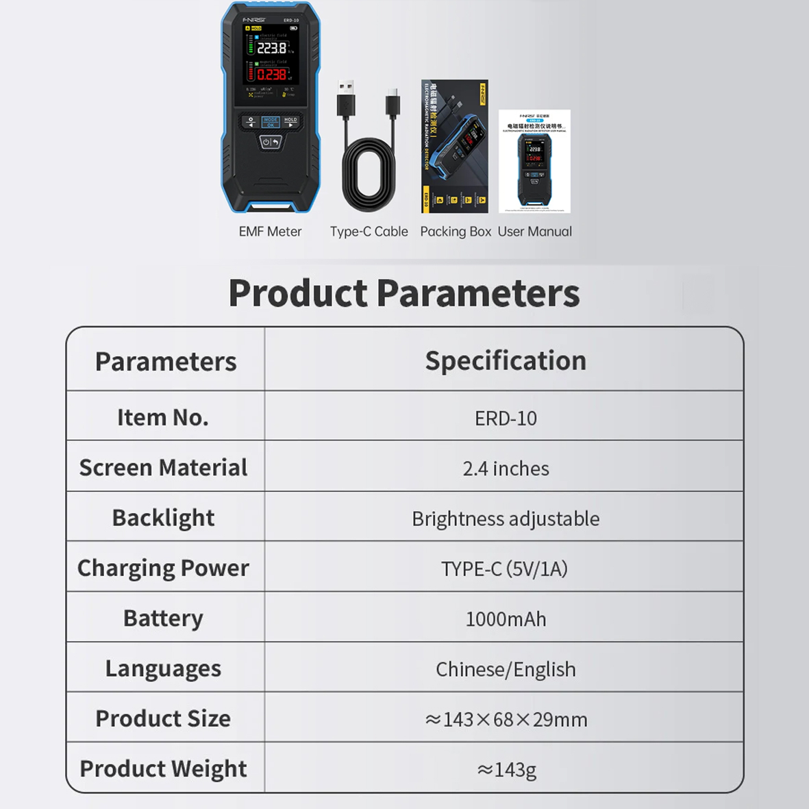 ERD-10 – це детектор електромагнітного випромінювання, професійний прилад, що використовується для вимірювання електромагнітного випромінювання. Він підходить для різних застосувань, таких як будинки, офіси, транспортні засоби та зовнішні середовища. Він оснащений 2,4-дюймовим кольоровим екраном високої чіткості та підтримує моніторинг напруженості електричного поля, напруженості магнітного поля, потужності випромінювання та температури навколишнього середовища. Основні моменти : ◉ Універсальне застосування : ERD-10 ідеально підходить для дому, офісу, автомобіля та зовнішнього середовища, задовольняючи різноманітні потреби моніторингу електромагнітного випромінювання. ◉ Багатофункціональний та високоточний : вимірює електричне поле (1–1999 В/м ±1 В/м), магнітне поле (0,01–99,99 мкТл ±0,01 мкТл), радіочастотну потужність (0,2–1000 мВт/см²) та температуру. Налаштовувані пороги спрацьовування сигналізації (за замовчуванням: 40 В/м для електричного поля, 0,4 мкТл для магнітного поля). ◉ Зручний дизайн : кольоровий екран 2,4 дюйма, функція збереження даних (HOLDS), двомовний інтерфейс (EN/CN), компактний розмір (143×68×29 мм, 143 г) та заряджання через USB-C для інтуїтивно зрозумілого та портативного використання. ◉ Розумна розширюваність : Підтримка налаштування системного меню (гучність/яскравість/автоматичне вимкнення), оновлення прошивки та скидання до заводських налаштувань одним клацанням миші для підвищеної гнучкості. ◉ Тривалий час роботи від акумулятора : вбудований акумулятор ємністю 1000 мАг забезпечує тривалу роботу. Специфікації Основні параметри: