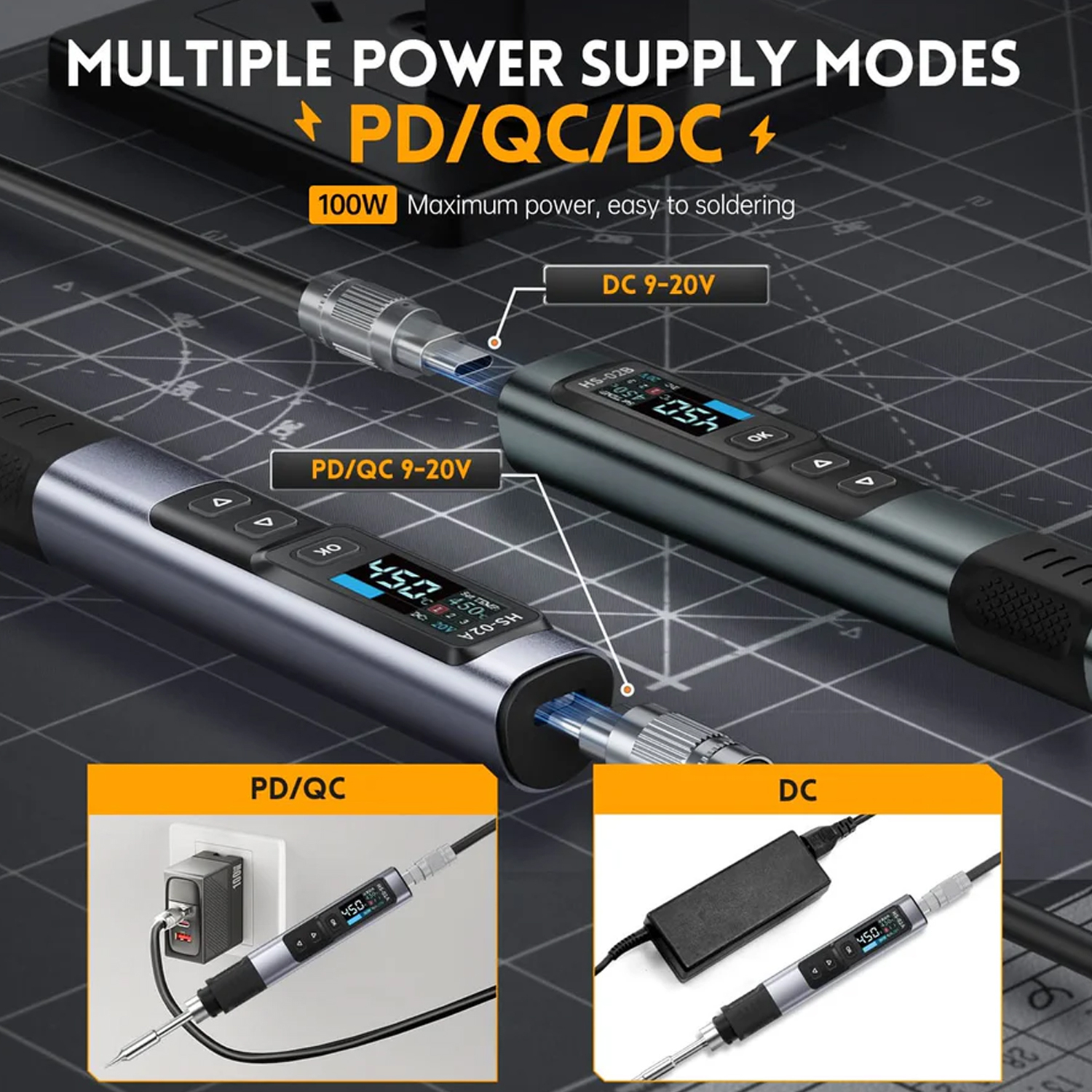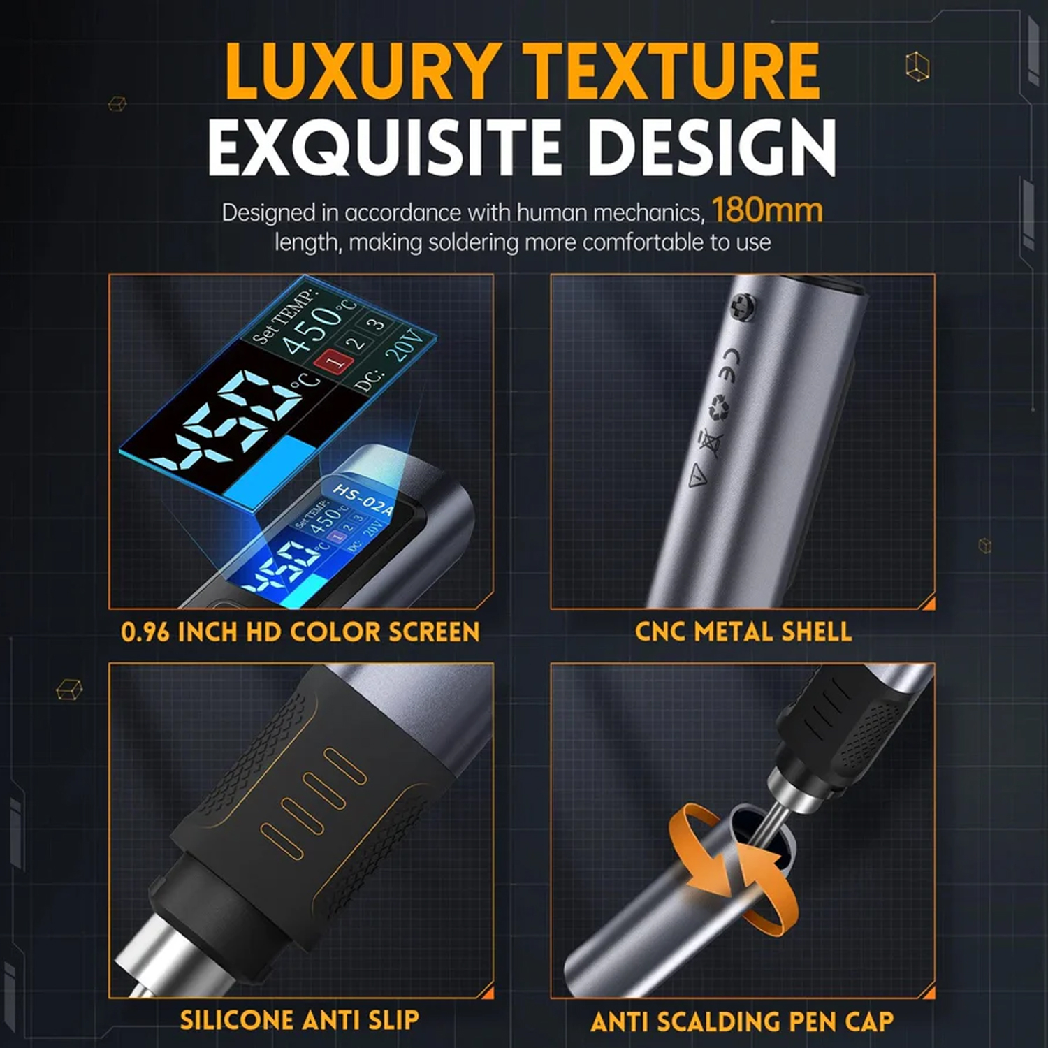 6. Широкий набір аксесуарів: HS-02A оснащений 6 паяльними жалами (K, KU, JS, I, C2, B). HS-02B оснащений 3 паяльними жалами (I, IS, K). Інтегрована конструкція дозволяє паяльнику швидко нагріватися та підтримувати стабільну температуру. А зарядний адаптер потужністю 100 Вт дозволяє використовувати його негайно.