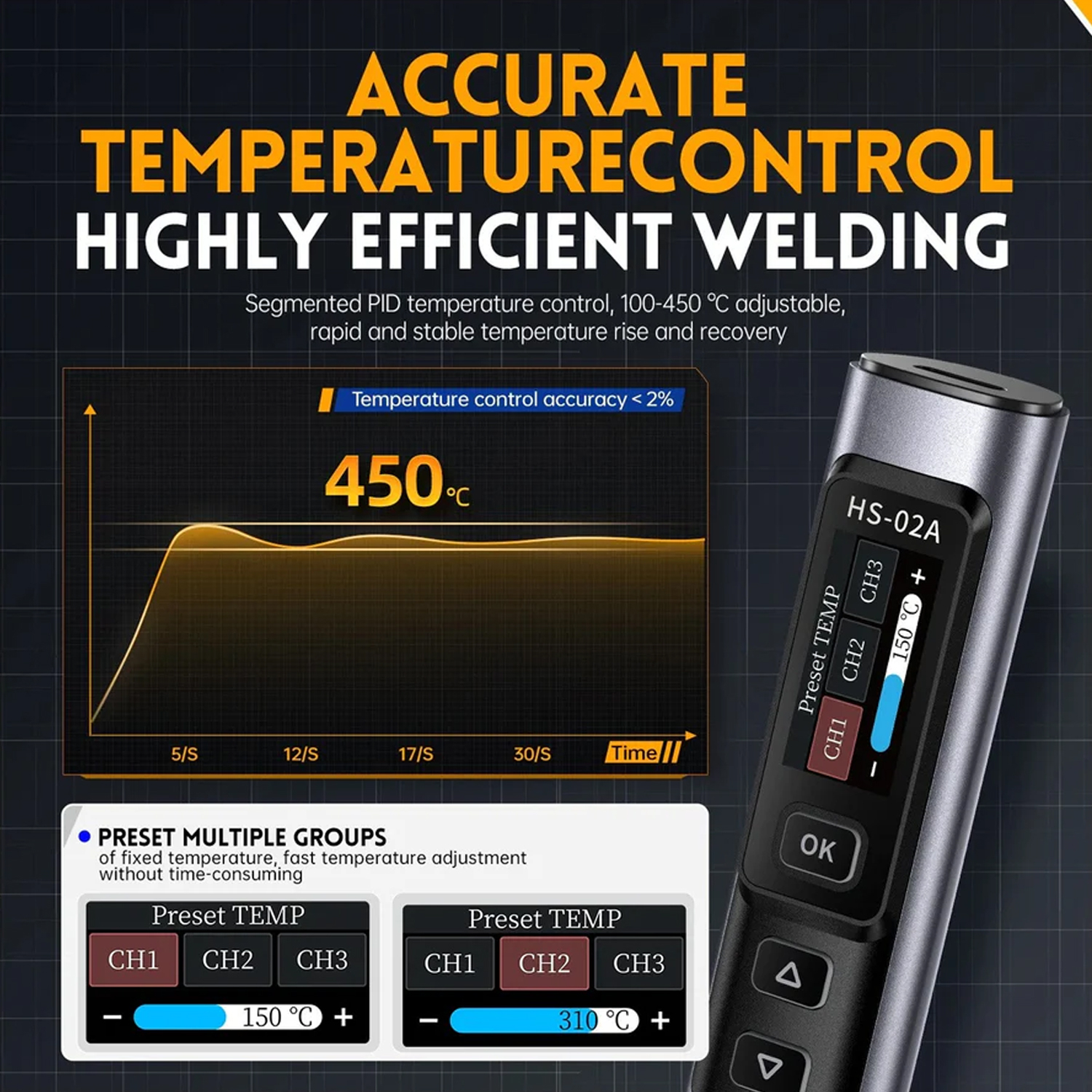 1. Повністю оновлений: Паяльник FNIRSI HS-02 має оновлений дизайн із покращеним зчепленням, коротшим наконечником, більшим дисплеєм 0,96 дюйма та швидшою швидкістю нагрівання. Ідеально підходить для ремонту електронних компонентів, ремонту ювелірних виробів, паяння друкованих плат та мікропаяння.