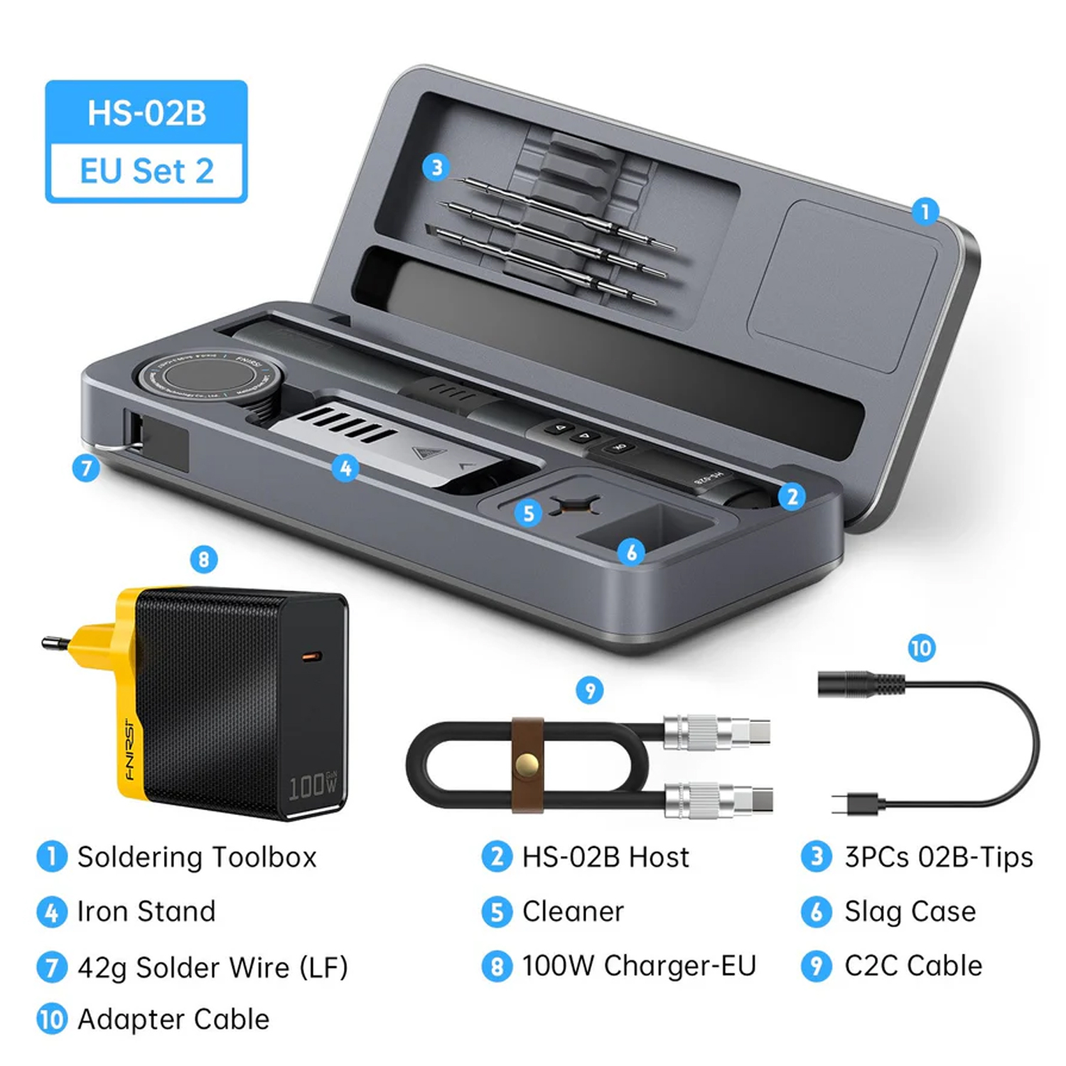 6. Широкий набір аксесуарів: HS-02A оснащений 6 паяльними жалами (K, KU, JS, I, C2, B). HS-02B оснащений 3 паяльними жалами (I, IS, K). Інтегрована конструкція дозволяє паяльнику швидко нагріватися та підтримувати стабільну температуру. А зарядний адаптер потужністю 100 Вт дозволяє використовувати його негайно.