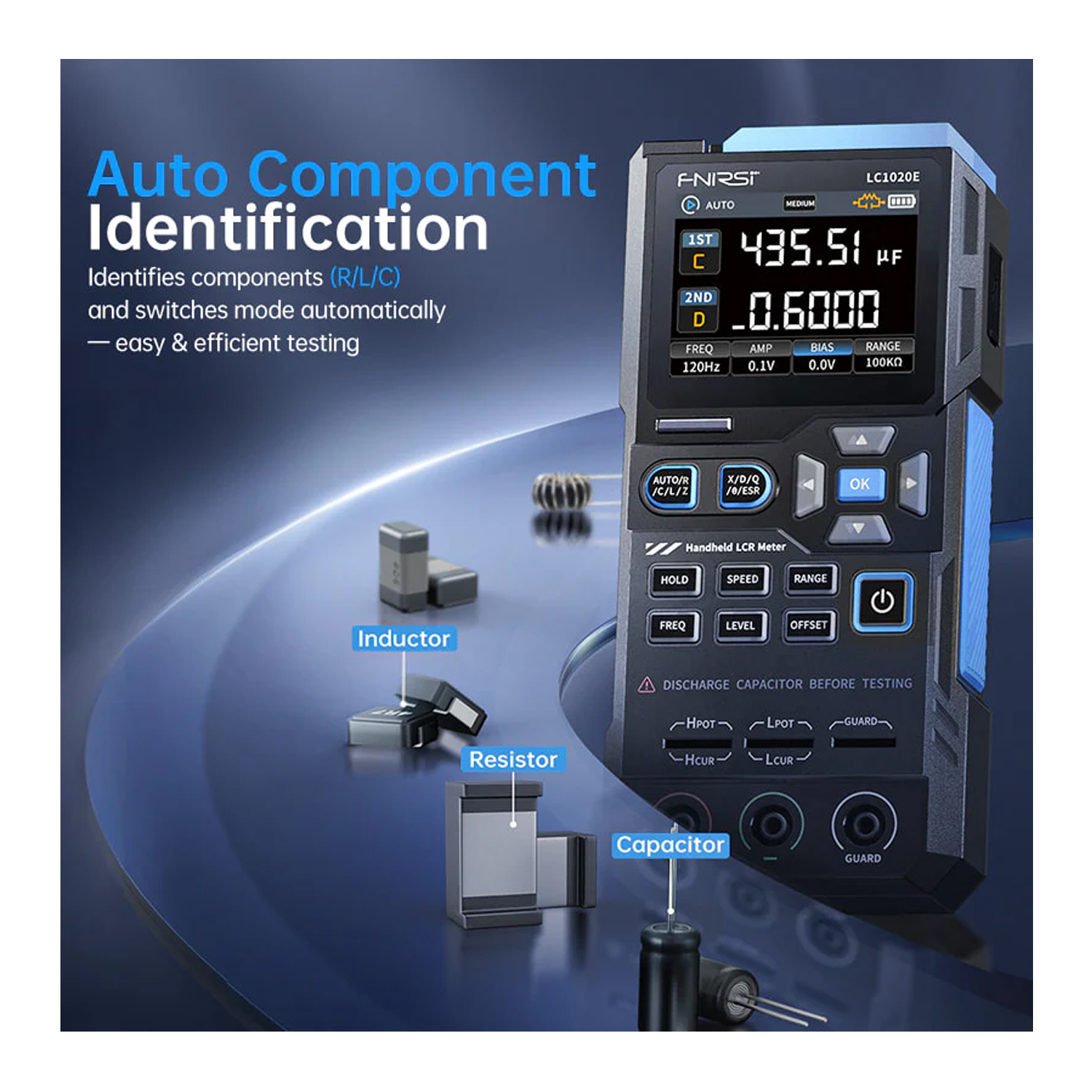 Вимірює значення L/C/R/Z з автоматичним перемиканням режимів та відображає X/D/Q/θ/ESR як вторинні параметри для комплексного аналізу компонентів. - Інтелектуальна автоматична ідентифікація компонентів.