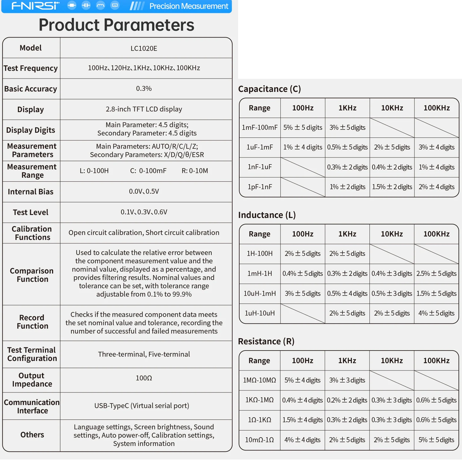 до ±0,05% , пропонуючи в 10 разів підвищену точність для вимірювань професійного рівня. - Підтримка широкого спектру параметрів.
