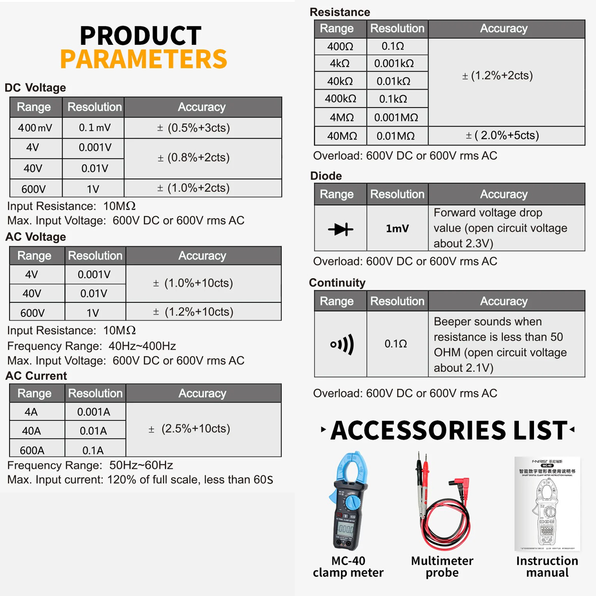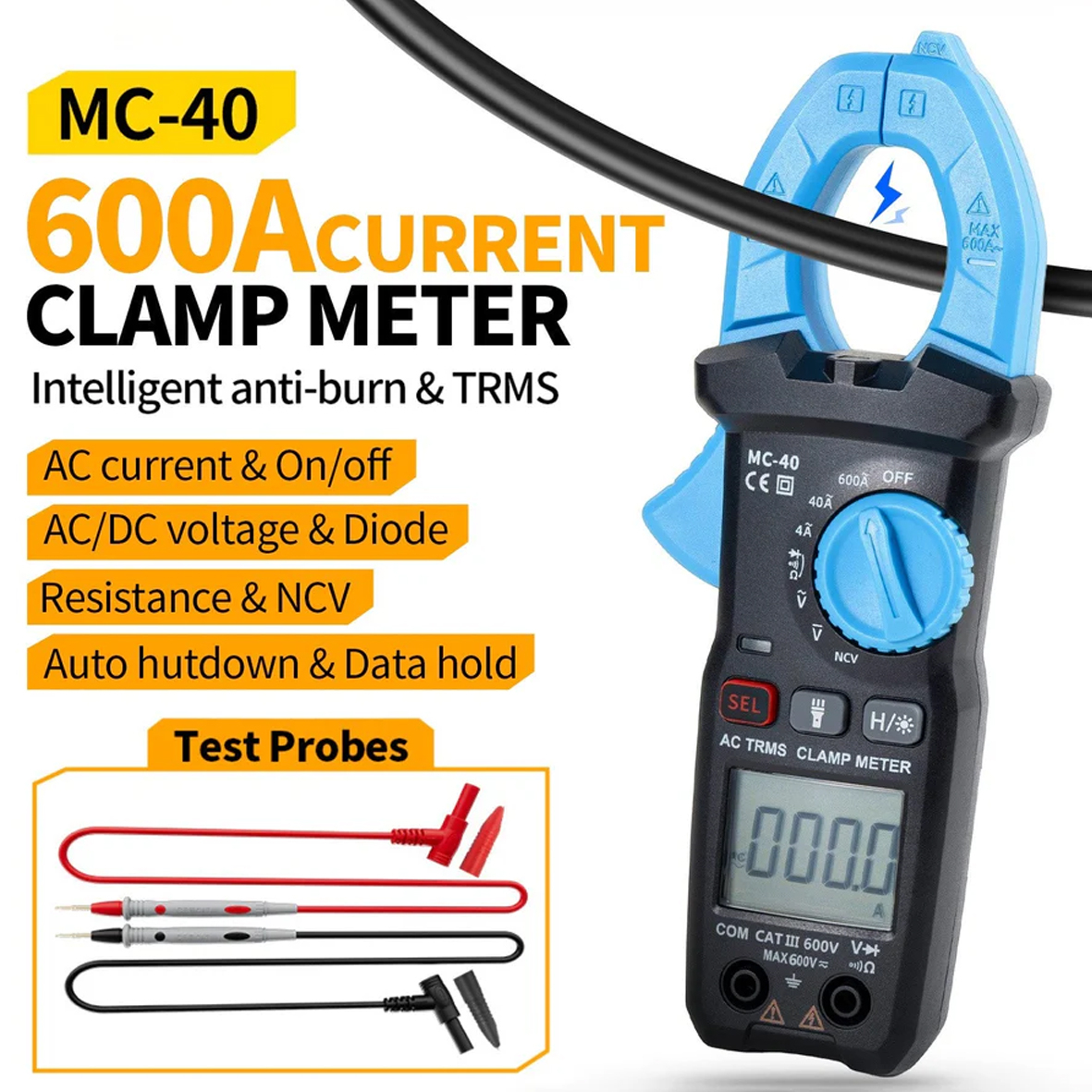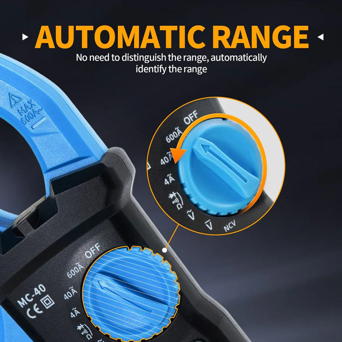 MC-40 оснащений низкою додаткових функцій, включаючи безконтактне виявлення напруги, тестування діодів, вимірювання опору та автоматичне вимкнення для економії заряду батареї. Міцний, ергономічний дизайн та великий отвір для затискачів роблять його зручним у використанні та транспортуванні. Основні моменти ✦ Інтелектуальний захист від вигорання: безпечніший у використанні, всебічний захист, без страху перевантаження. ✦ Високоякісний чіп: Точніше вимірювання, висока швидкість вимірювання! Частота дискретизації тричі на секунду. ✦ Автоматичний діапазон: Немає потреби розрізняти діапазон, діапазон визначається автоматично. ✦ Вимірювання високого струму 600 А: вища верхня межа, ширше застосування. Особливості: