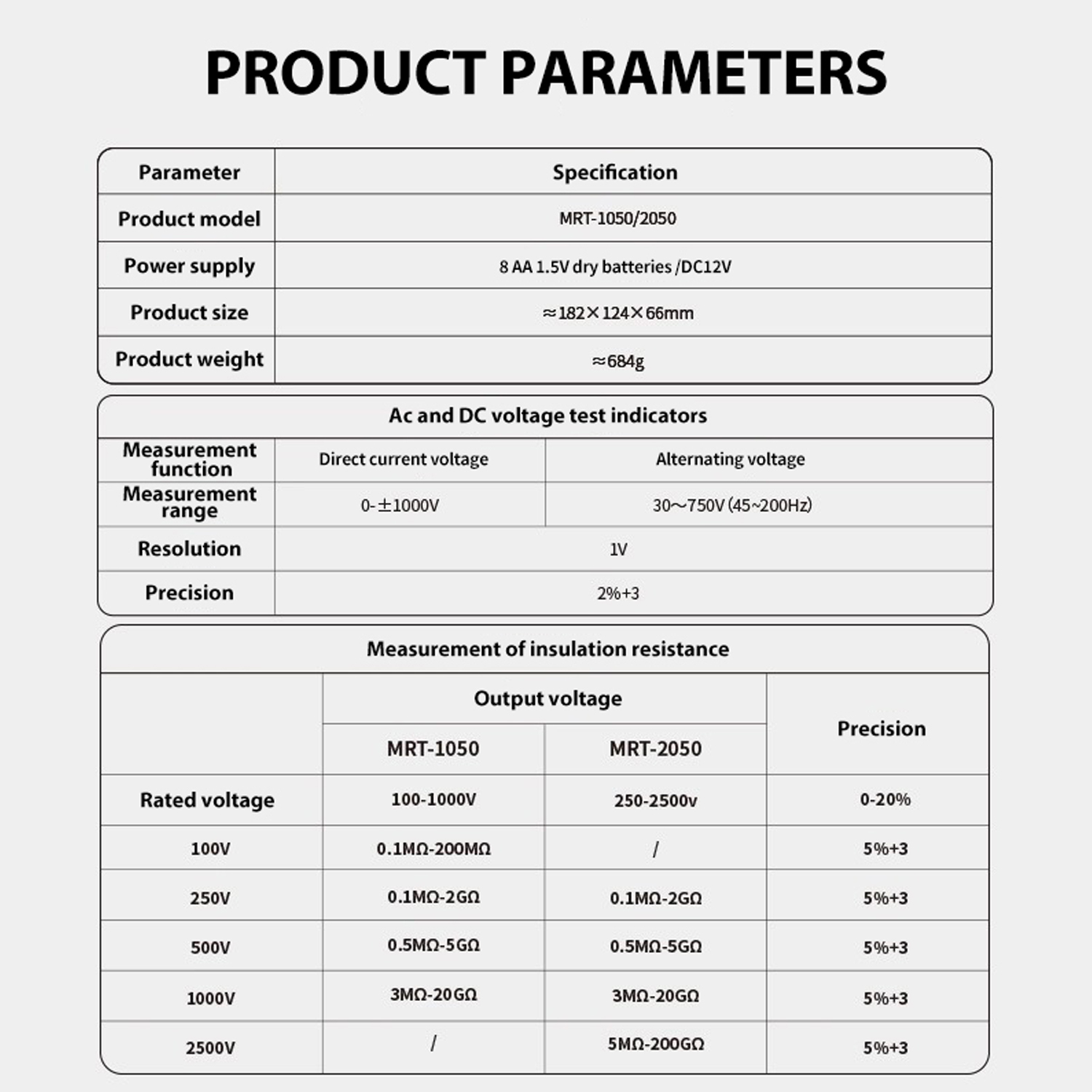 | Тестова напруга (Вихідна) | 100В / 250В / 500В / 1000В |