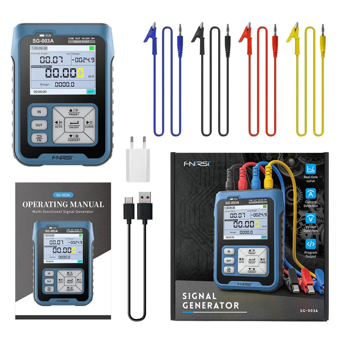 ✦ Генератор сигналів з кількома портами: Синій (IN-) є альтернативним, а також вхідним портом, який можна переключити на джерело живлення 24 В для випробувань. Червоний (OUT) та чорний (COM) утворюють вихідний порт. Жовтий (IN+) та синій (IN-) утворюють вхідний порт.