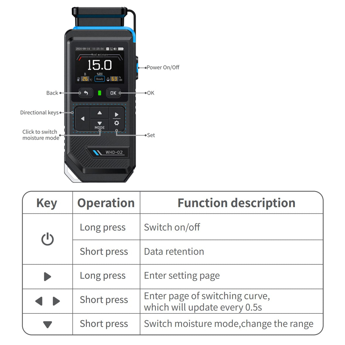 ● Діапазон вимірювання: 5 %–50 % вологості деревини