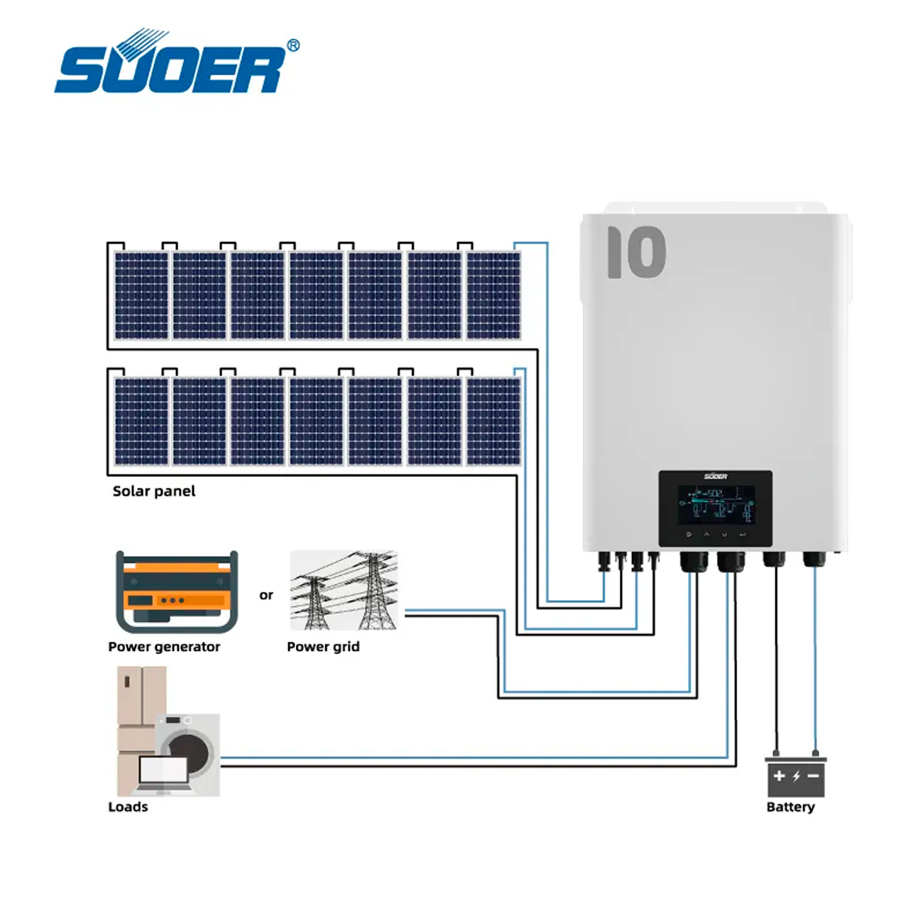 Наш гібридний інвертор – це багатофункціональний пристрій, що поєднує можливості інвертора, сонячного зарядного пристрою, приладу для безперебійного заряджання акумулятора та системи безперебійного живлення від акумуляторів (UPS). На дисплеї інвертора відображаються основні поточні параметри, а розширений діапазон функцій та налаштувань можна змінювати за допомогою кнопок керування або за допомогою спеціальної програми при підключенні інвертора до персонального комп’ютера. Інвертор має багато режимів роботи, де можна вибрати пріоритет у використанні енергії від стаціонарного джерела живлення АС, сонячних панелей, акумуляторів та визначити порядок їхнього перемикання протягом дня та в разі зникнення/відновлення відповідного джерела енергопостачання. Інвертор генерує на виході чисту синусоїду (PF=1), працює в режимі швидкісного перемикання в режимі UPS (без виключення та збоїв побутової техніки, ПК тощо), має функцію холодного запуску та автоматично перезавантажується при відновленні змінного струму. Дозволяє працювати без використання батарей у сонячний день від сонячних панелей. Має надпотужні блоки живлення AC/DC та MPPT для швидкісного заряджання акумуляторних батарей (широкий вхідний діапазон PV 90VDC-500VDC, 160A MPPT SCC та інтелектуальний 3 - ступеневий зарядний пристрій 160А/180А DC). Інвертор оптимізований для роботи з різними типами акумуляторів, а для літієвих акумуляторів має спеціальні унікальні функції щодо максимального збереження їхньої ємності та ефективного заряджання/використання. Спеціальний функціонал забезпечує повний захист від перевантаження та короткого замикання, дозволяє короткострокове перевищення потужності в 2 рази протягом 5 секунд для навантажень електричних двигунів.ХАРАКТЕРИСТИКИ :