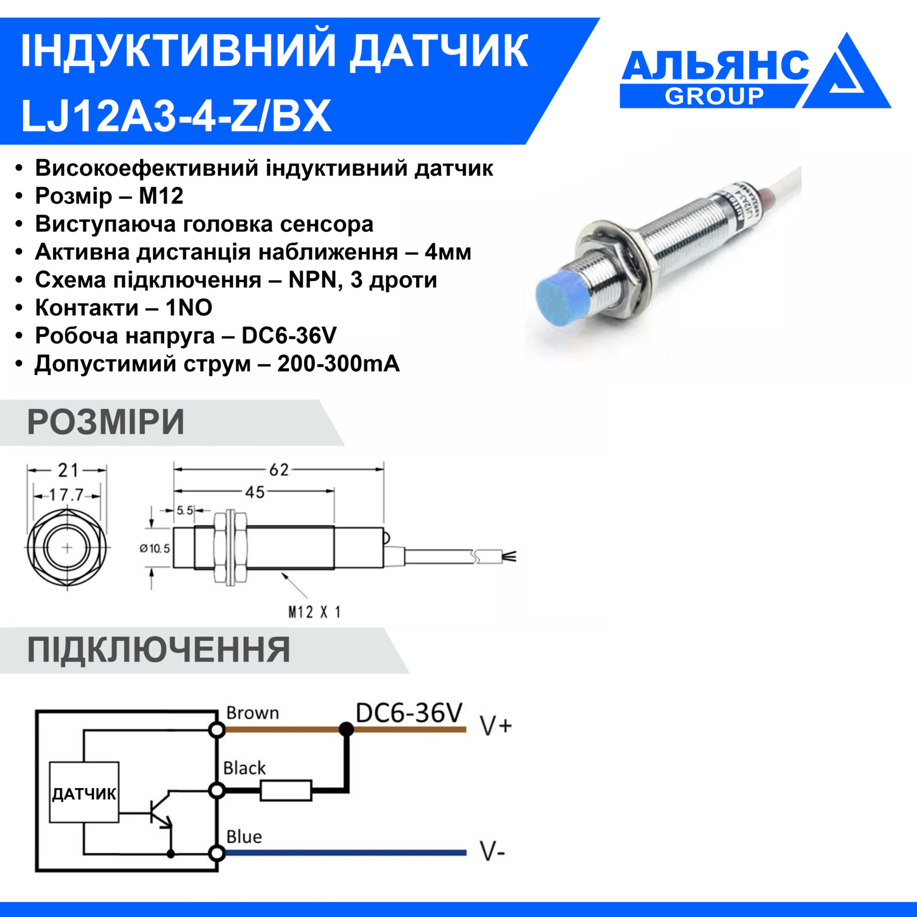 Індуктивний датчик LJ12A3-4-Z/BX DC6-36V