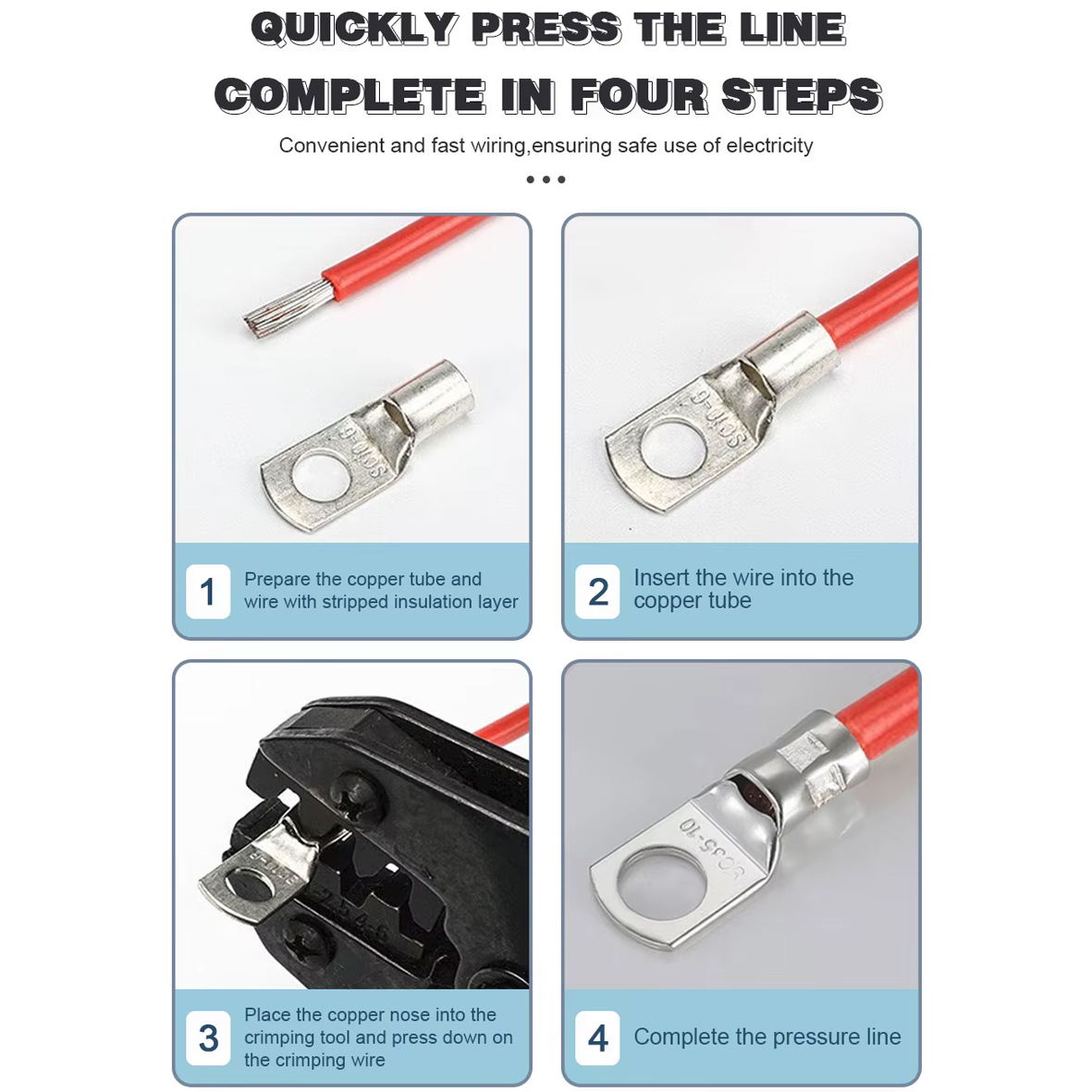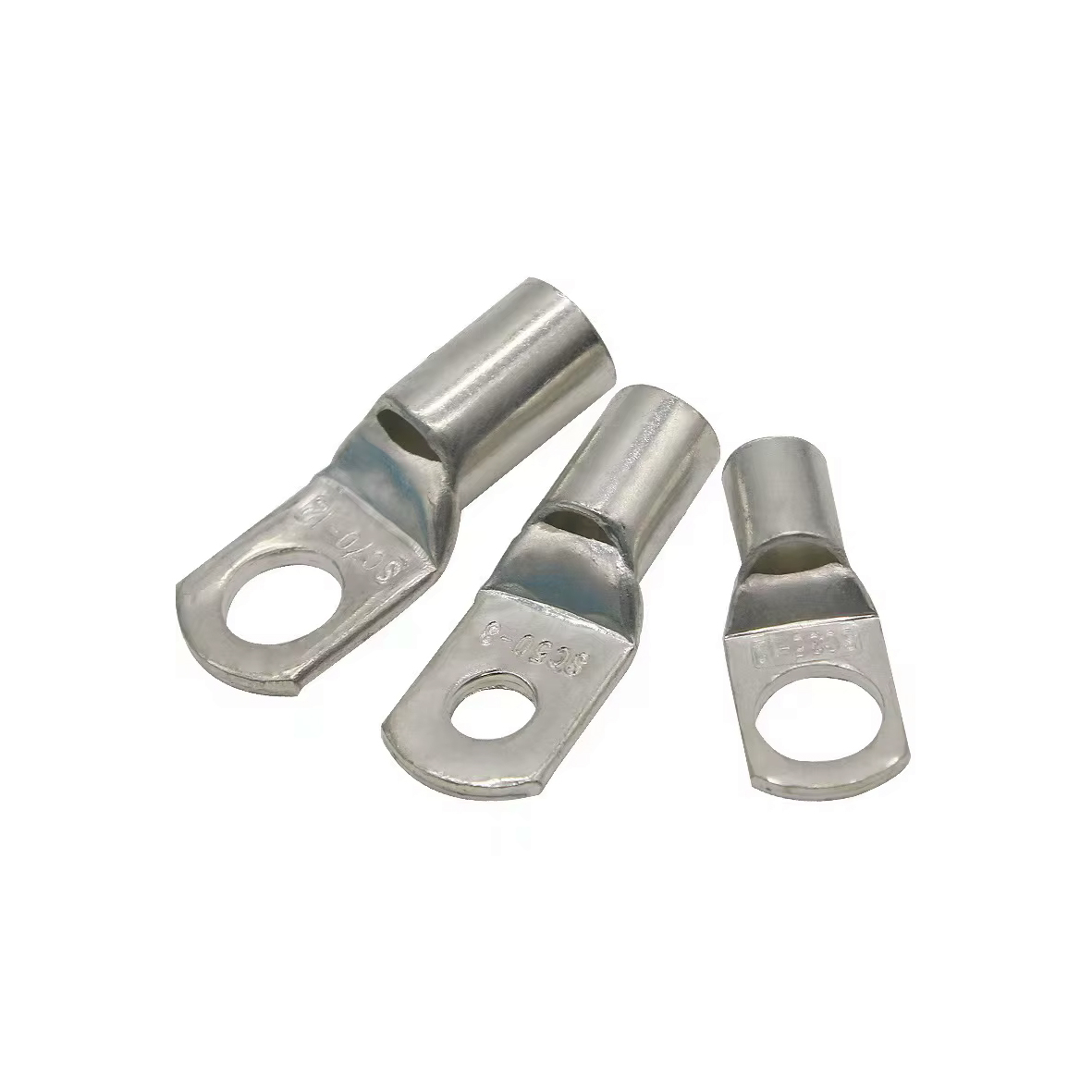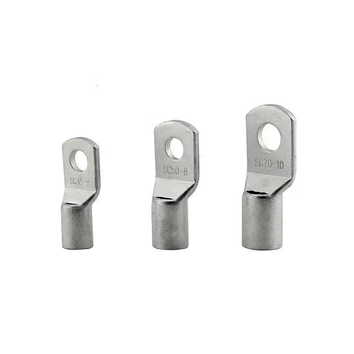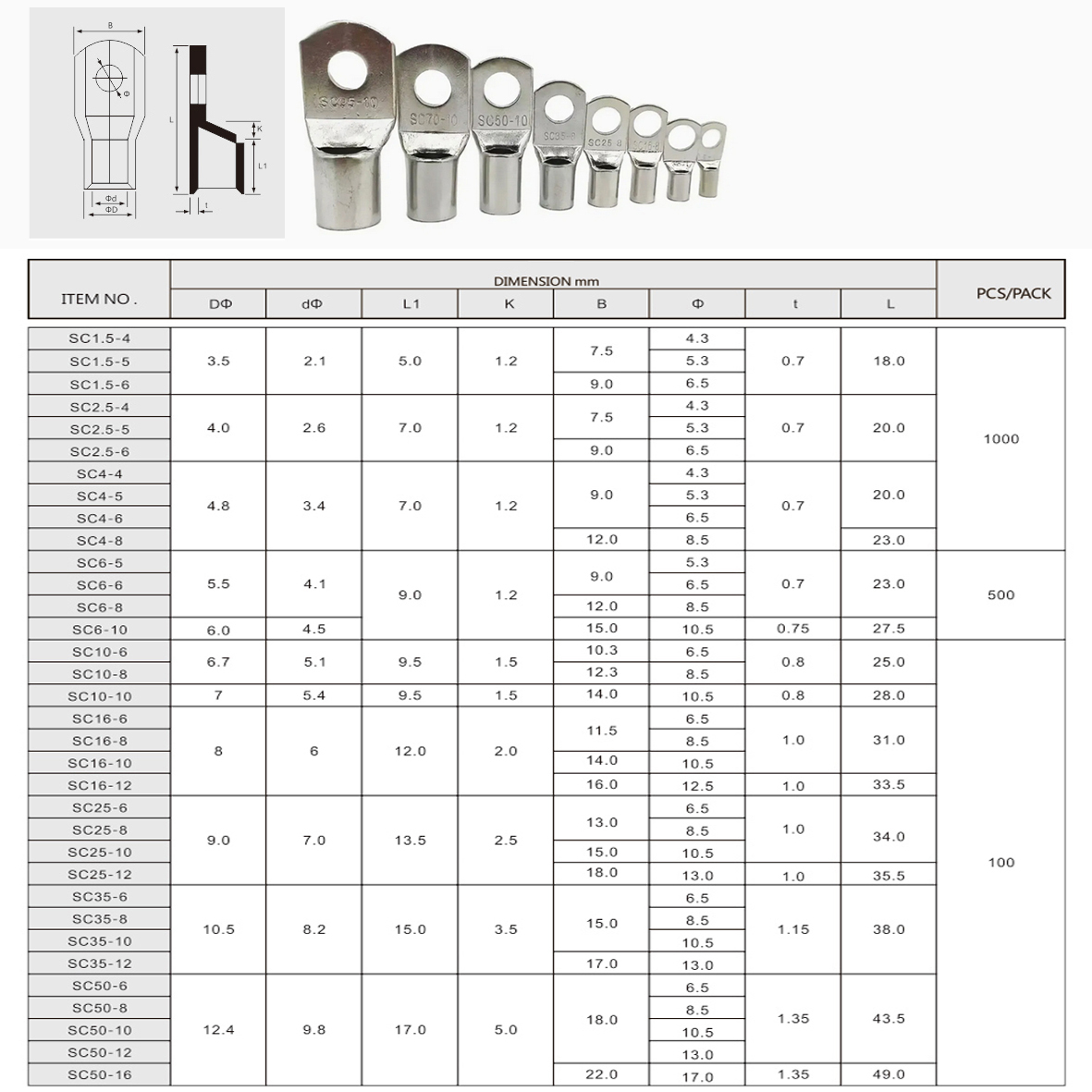 Кабельний мідний наконечник SC. Перша цифра в позначенні - площа перетину для опресувування в мм.кв., друга цифра - розмір гвинта (болта) для кріплення. Наприклад - SC-35-6 розшифровується як : наконечник для опресовки кабелю максимальним перетином 35мм.кв. з отвором для кріплення під гвинт (болт) М6 Основна функція кабельних наконечників полягає в зменшенні перехідного опору в місці контакту. Перехідний опір виникає в місцях з`єднання двох металів, і величина його залежить від хімічних і фізичних властивостей матеріалу, а також від площі зіткнення цих матеріалів. При виникненні великого контактного з`єднання в процесі експлуатації в цьому місці може відбуватися сильне нагрівання і можливе займання ізоляції кабелю. Розміри і характеристики наконечників наведені в таблиці на фото.