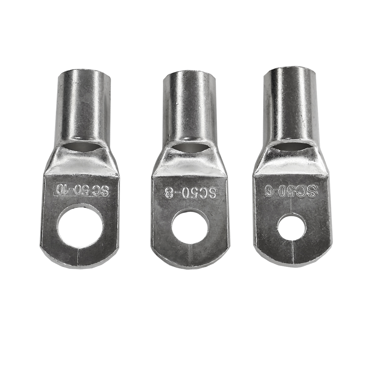 Кабельний мідний наконечник SC. Перша цифра в позначенні - площа перетину для опресувування в мм.кв., друга цифра - розмір гвинта (болта) для кріплення. Наприклад - SC-35-6 розшифровується як : наконечник для опресовки кабелю максимальним перетином 35мм.кв. з отвором для кріплення під гвинт (болт) М6 Основна функція кабельних наконечників полягає в зменшенні перехідного опору в місці контакту. Перехідний опір виникає в місцях з`єднання двох металів, і величина його залежить від хімічних і фізичних властивостей матеріалу, а також від площі зіткнення цих матеріалів. При виникненні великого контактного з`єднання в процесі експлуатації в цьому місці може відбуватися сильне нагрівання і можливе займання ізоляції кабелю. Розміри і характеристики наконечників наведені в таблиці на фото.