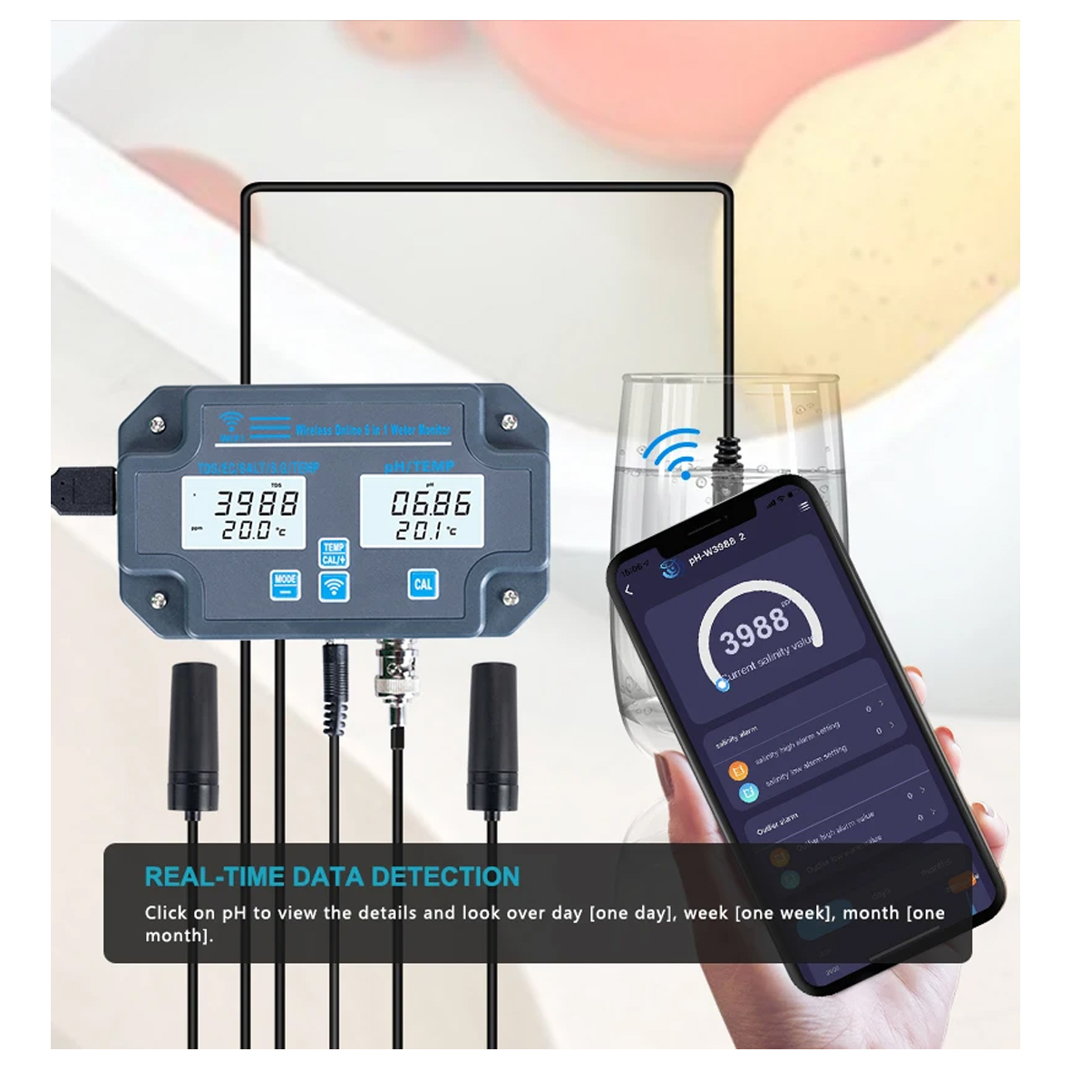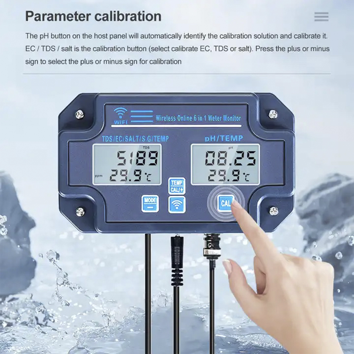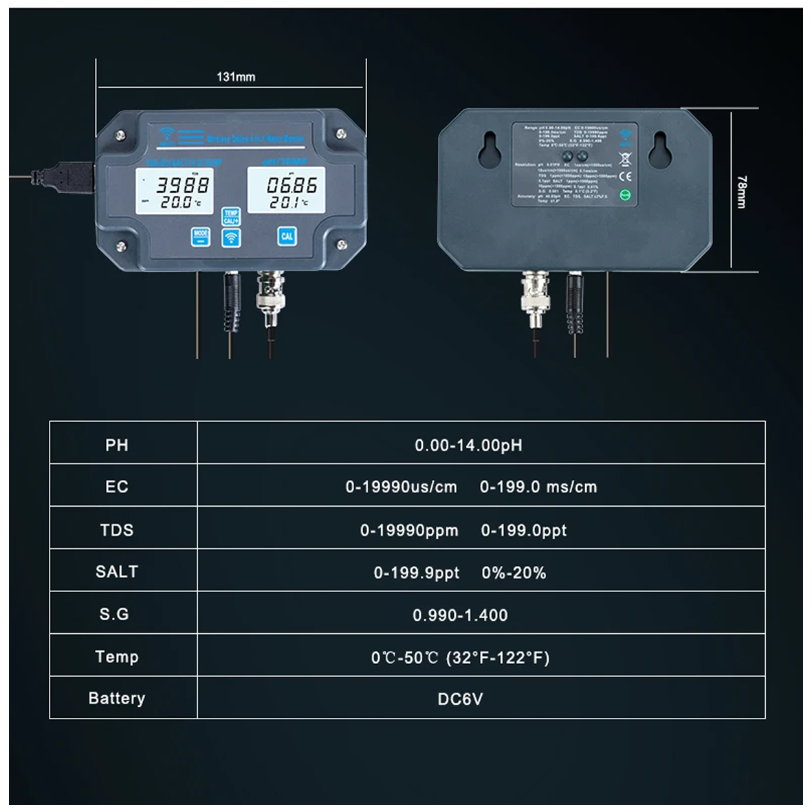 Найновіша модель багатофункціонального SMART тестера 6 в 1 для вимірювання всіх необхідних якісних параметрів води - PH / EC / TDS / SALT / G.S / ТЕМПЕРАТУРИ. Коротко натискаючи кнопку «MODE» відбувається перемикання між режимами відображення. Передбачений вибір одиниць вимірювання температури : ℃/ ℉. Пристрій легко підключається через вбудований модуль WiFi до мережі інтернет і передає всі параметри на хмарний сервер. Користувач за допомогою популярного додатку Tuya або SmartLife зі смартфону може в режимі онлайн контролювати контролер якості води в будь-який час і в будь-якому місці, переглядати результати вимірювань, діаграми, узагальнювати дані вимірювань, змінювати налаштування пристрою, а також створювати розумні сценарії для управління іншими пристроями та встановити значення сигналів тривоги. Цифровий екран із підсвічуванням значно покращує зчитування інформації. Має широкий діапазоном вимірювання: PH коливається від 0,00 до 14,00, EC — від 0 до 19000 мкс/см, TDS — від 0 до 19990 ppm тощо. Аналізатор якості води можна використовувати для розрізнення питної води та непитної води. Також для перевірки води в акваріумі, гідропоніці, басейні, ставку, лабораторії тощо. Компактний і легкий. Є дві присоски та пластиковий настінний кронштейн для легкого встановлення. Корисне відео