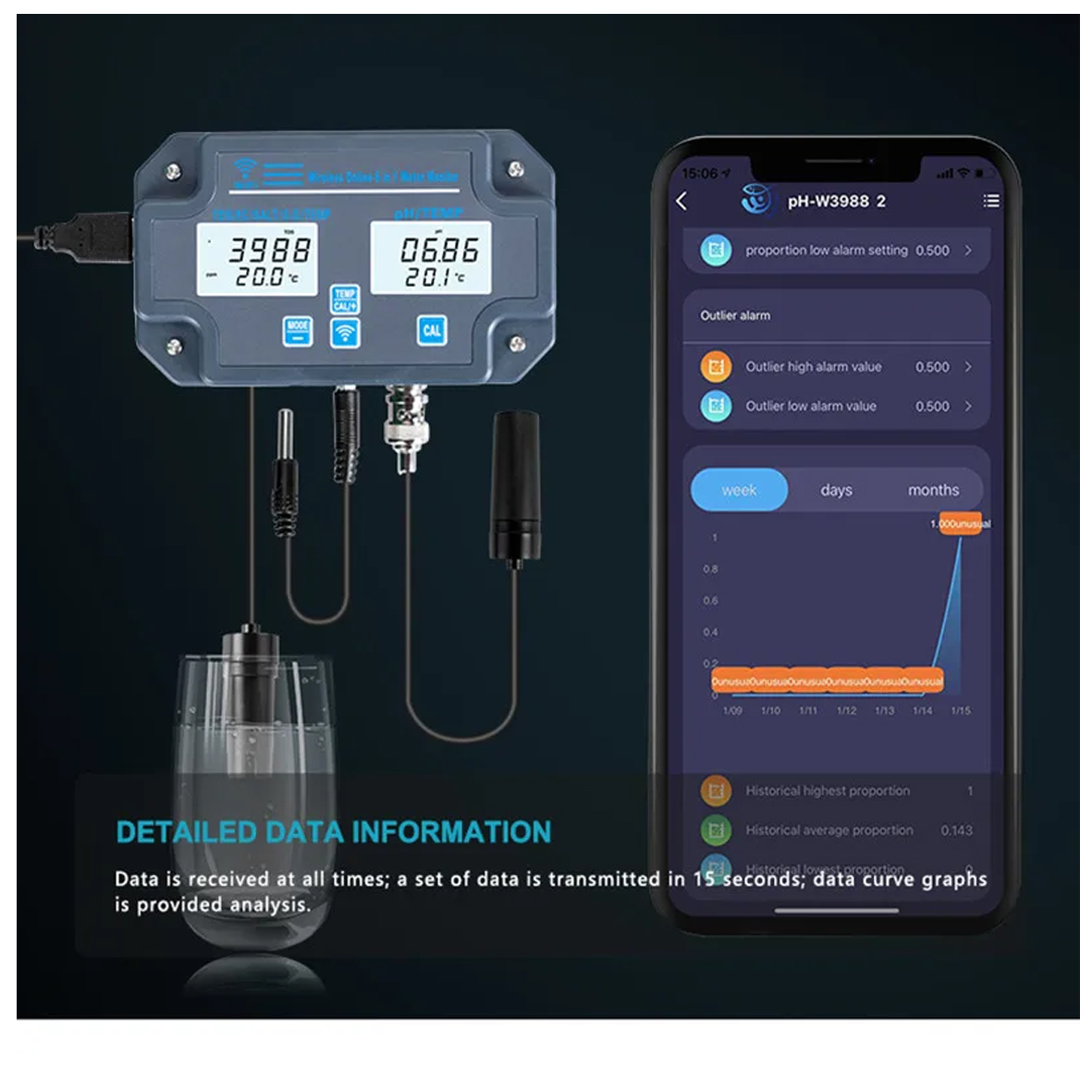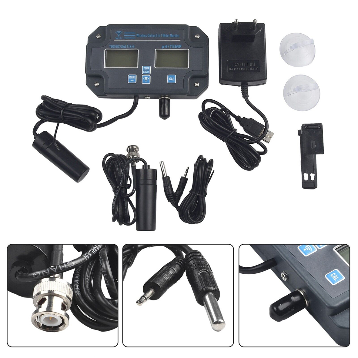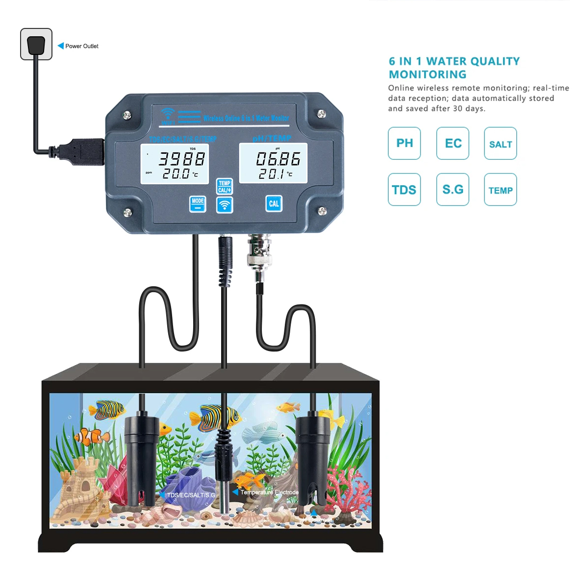 Найновіша модель багатофункціонального SMART тестера 6 в 1 для вимірювання всіх необхідних якісних параметрів води - PH / EC / TDS / SALT / G.S / ТЕМПЕРАТУРИ. Коротко натискаючи кнопку «MODE» відбувається перемикання між режимами відображення. Передбачений вибір одиниць вимірювання температури : ℃/ ℉. Пристрій легко підключається через вбудований модуль WiFi до мережі інтернет і передає всі параметри на хмарний сервер. Користувач за допомогою популярного додатку Tuya або SmartLife зі смартфону може в режимі онлайн контролювати контролер якості води в будь-який час і в будь-якому місці, переглядати результати вимірювань, діаграми, узагальнювати дані вимірювань, змінювати налаштування пристрою, а також створювати розумні сценарії для управління іншими пристроями та встановити значення сигналів тривоги. Цифровий екран із підсвічуванням значно покращує зчитування інформації. Має широкий діапазоном вимірювання: PH коливається від 0,00 до 14,00, EC — від 0 до 19000 мкс/см, TDS — від 0 до 19990 ppm тощо. Аналізатор якості води можна використовувати для розрізнення питної води та непитної води. Також для перевірки води в акваріумі, гідропоніці, басейні, ставку, лабораторії тощо. Компактний і легкий. Є дві присоски та пластиковий настінний кронштейн для легкого встановлення. Корисне відео