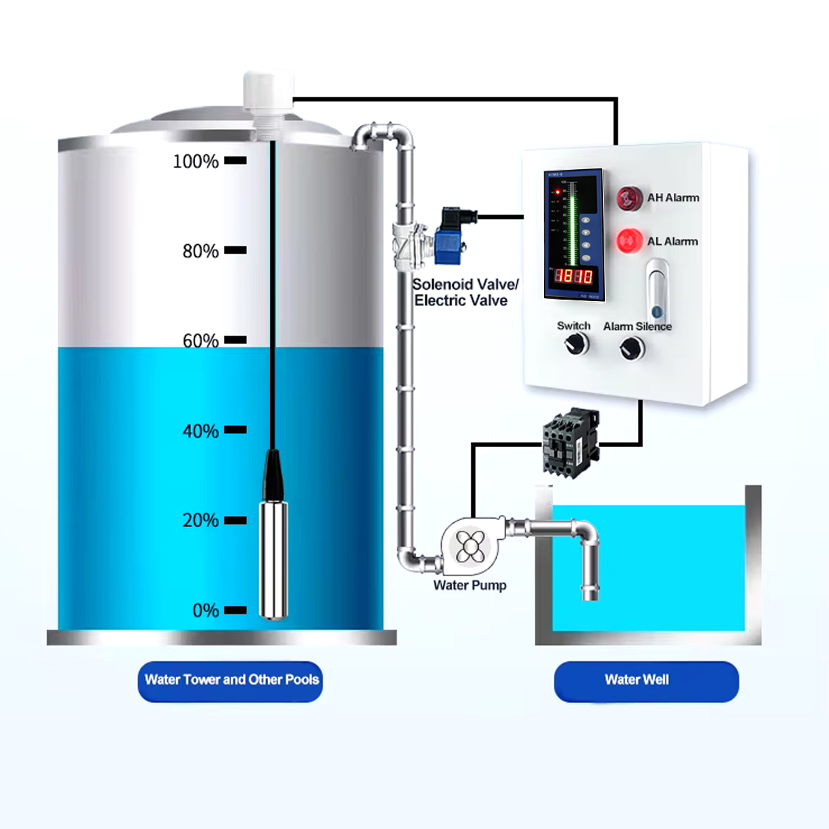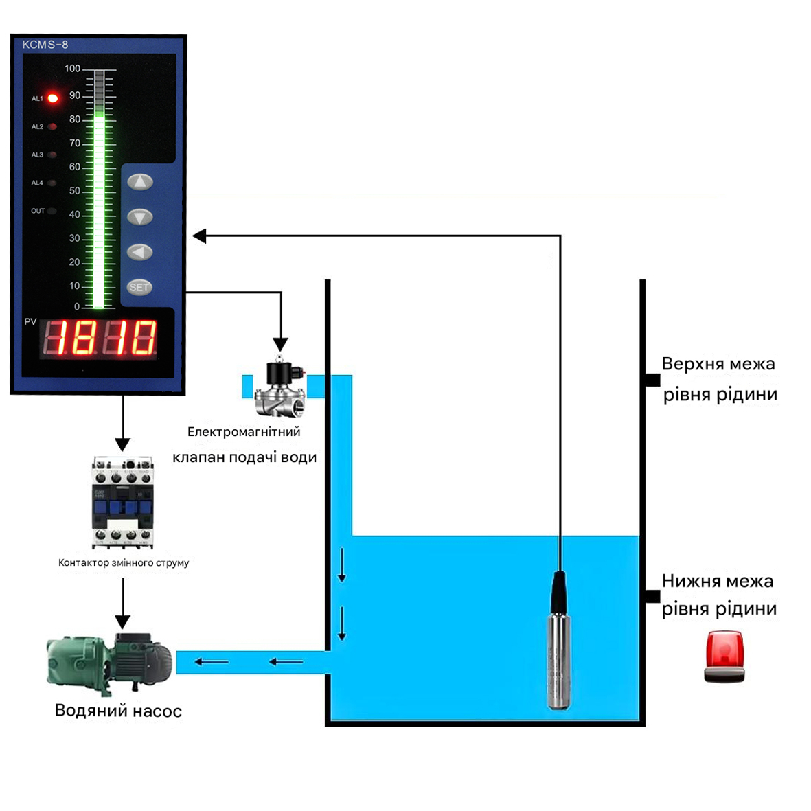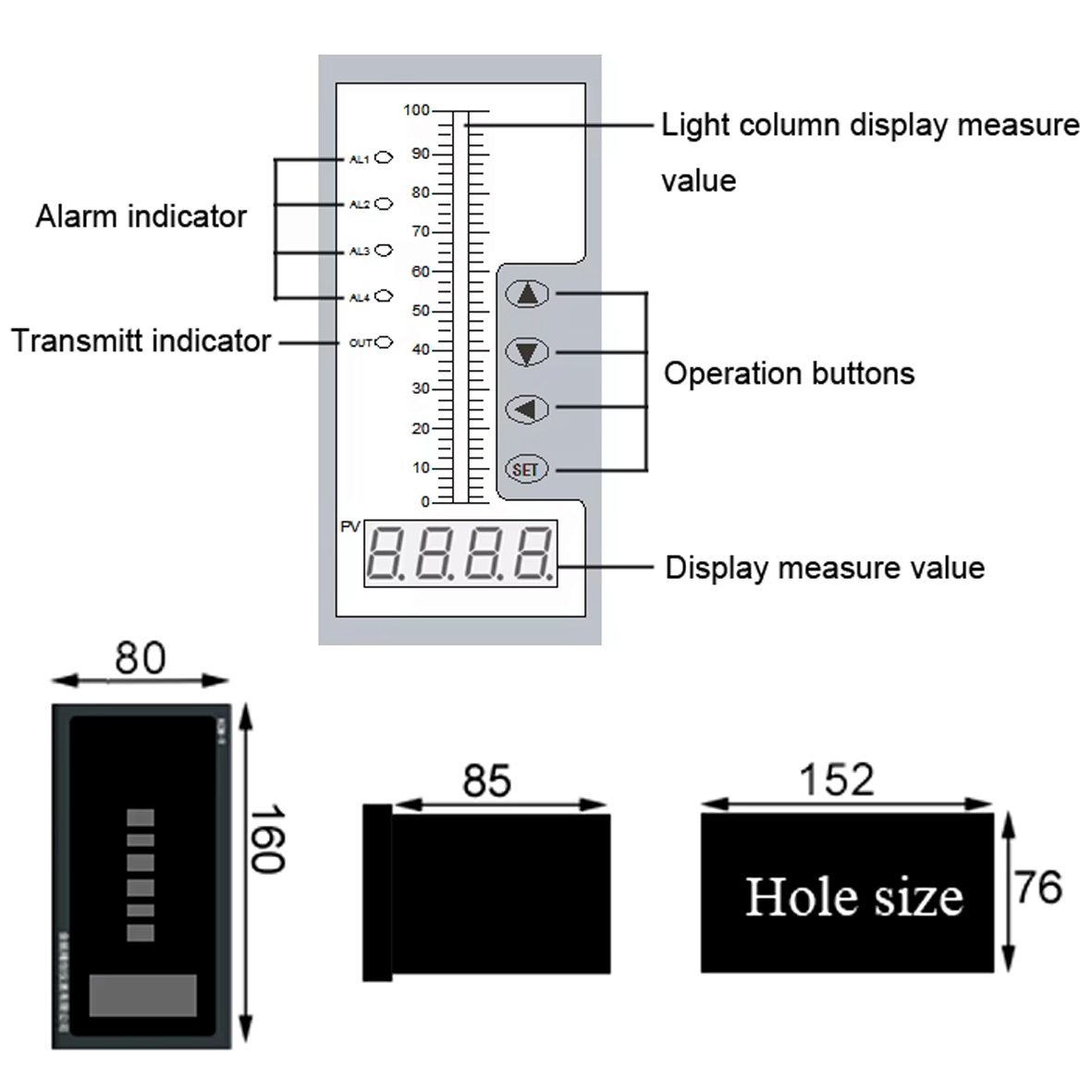 Контролер рівня має два покажчики – світлова стрічка від 0 до 100% (з можливістю налаштування 0-100%) та цифровий покажчик, який дозволяє відображати кількісні значення рівня рідини – в мм, см, метрах, літрах, м.куб. кг., тн. тощо. Контролер має 4 релейних виходи, активація кожного виходу має окремі налаштування. За потреби контролер може мати RS-485 інтерфейс.Контролер рівня має два покажчики – світлова стрічка від 0 до 100% (з можливістю налаштування 0-100%) та цифровий покажчик, який дозволяє відображати кількісні значення рівня рідини – в мм, см, метрах, літрах, м.куб. кг., тн. тощо. Контролер має 4 релейних виходи, активація кожного виходу має окремі налаштування. За потреби контролер може мати RS-485 інтерфейс. Параметри контролеру рівня: Розміри - 80*160mm Інтерфейс підключення - 4-20mA (струмове коло) Напруга - AC/DC85-240V Додаткові інтерфейси - RS-485 Вага - 0,42кг.