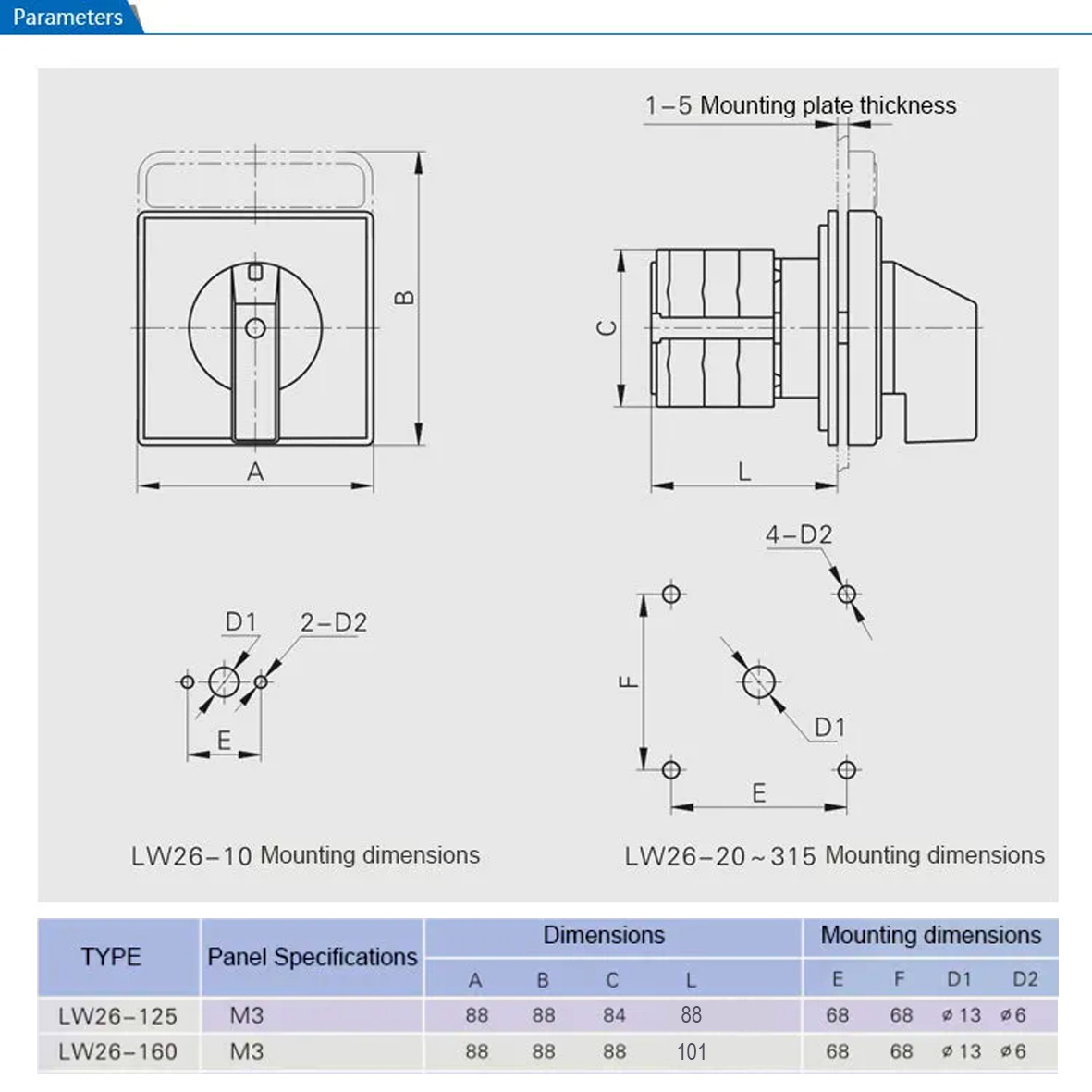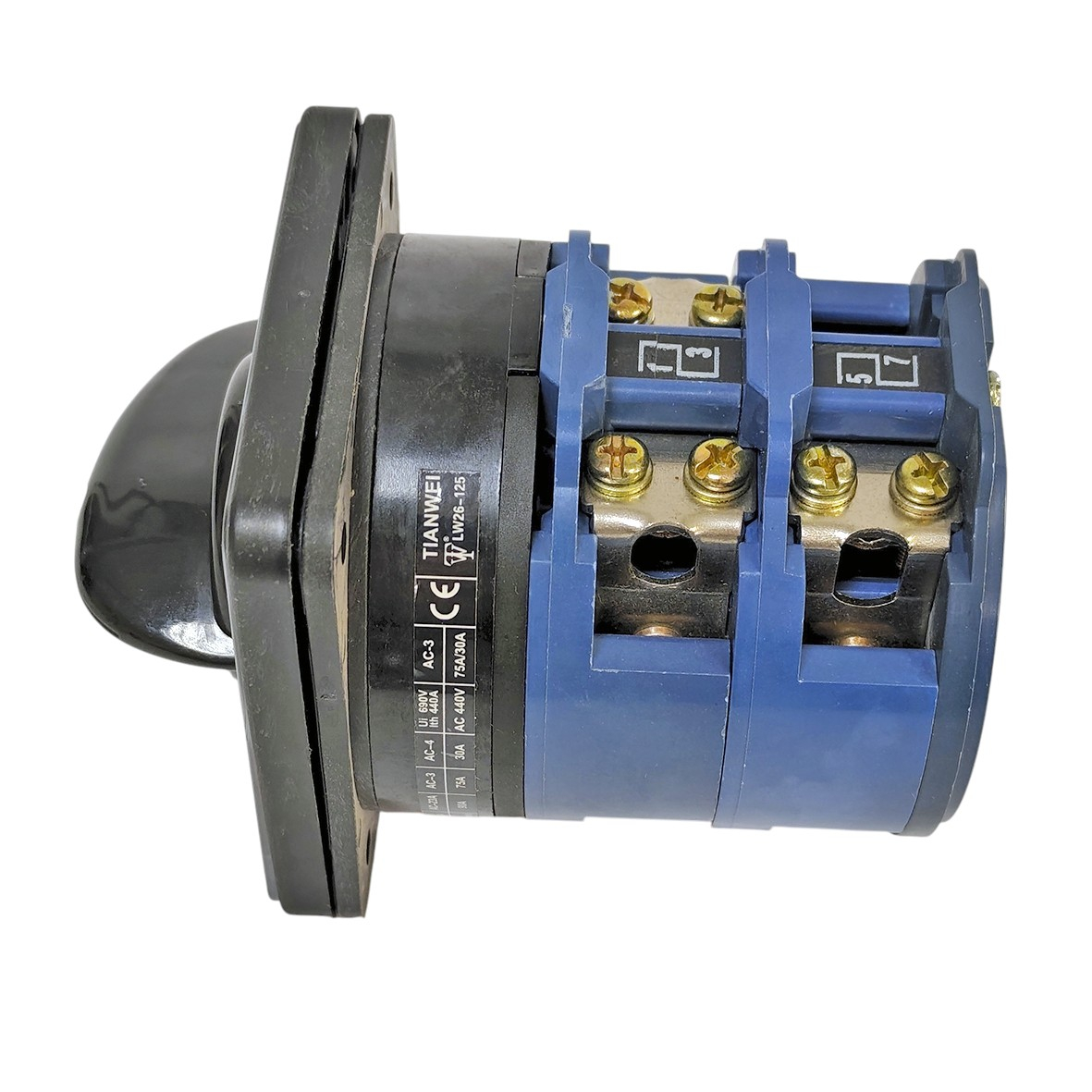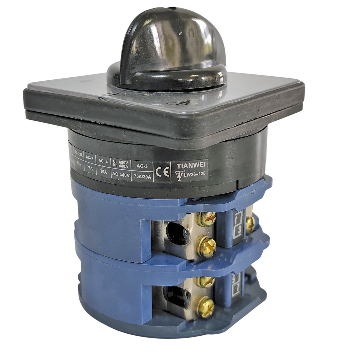 Кулачковий перемикач 3 полюси 125А 380В Тип пристрою: поворотний кулачковий перемикач Модель: LW26-125 Виробник: YZTW Основні характеристики: