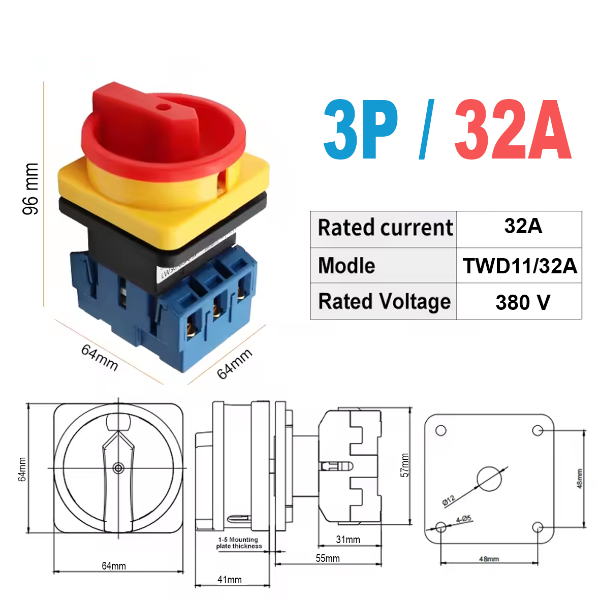 Кулачковий перемикач 3 полюси 32А 380В Тип пристрою: поворотний кулачковий перемикач Модель: TWD11/32A Виробник: YZTW Основні характеристики: