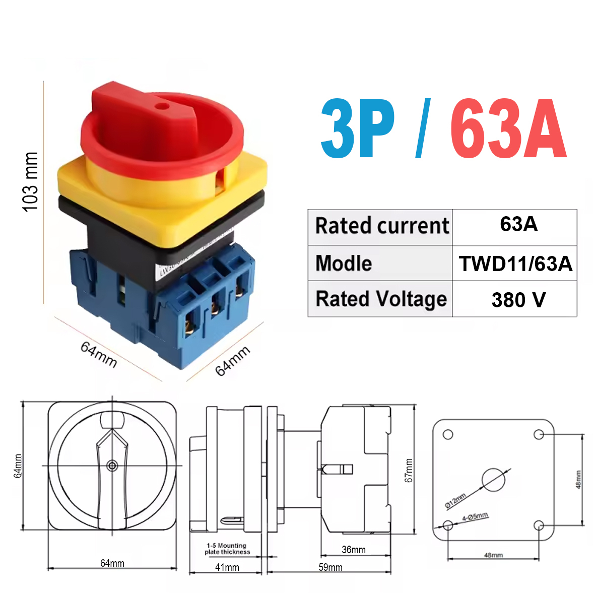 Кулачковий перемикач 3 полюси 63А 380В Тип пристрою: поворотний кулачковий перемикач Модель: TWD11/63A Виробник: YZTW Основні характеристики: