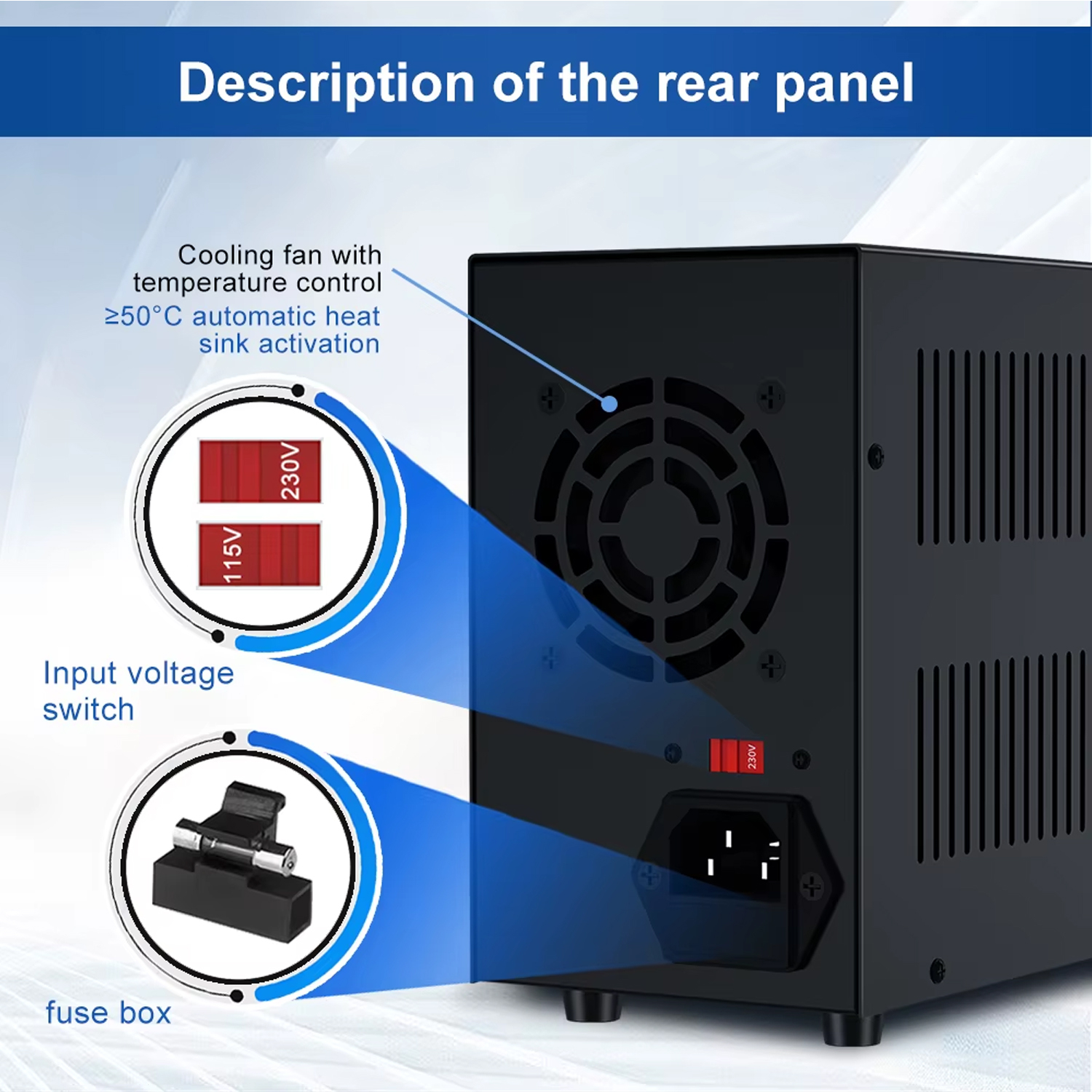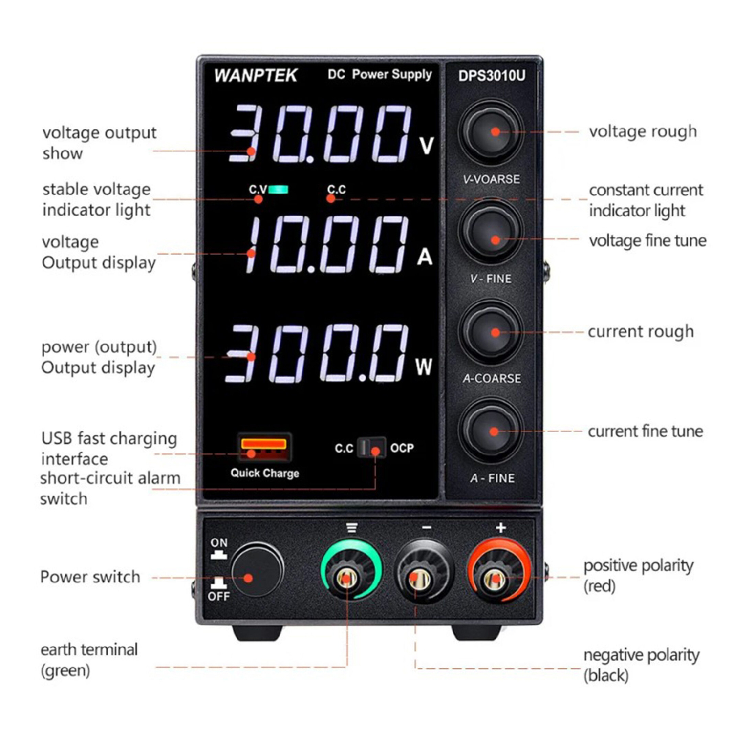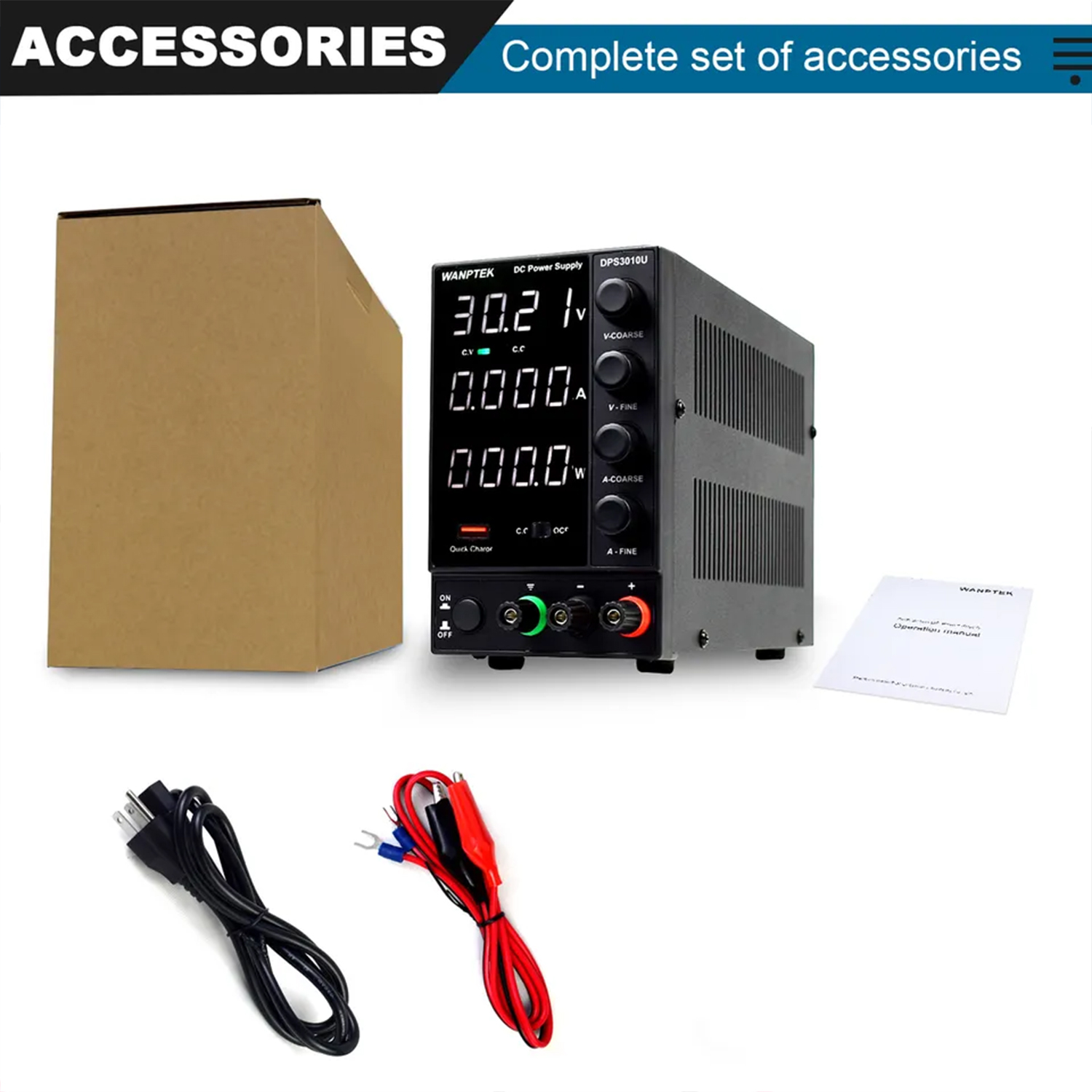 | Допоміжні функції | Швидка зарядка USB QC3.0, режим контролю перевищення току OCP, чотири багатофункціональних регулятора току/напруги для грубого та точного налаштування. | ||
