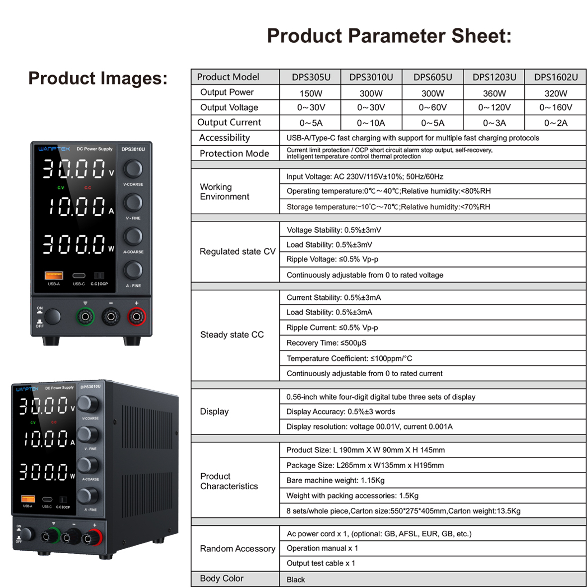 Блок живлення серії DPS – це програмований регульований лабораторний блок живлення постійного струму, розроблений для забезпечення найвищої точності та гнучкості у ваших проектах. Цей пристрій має тривіконний чотирирозрядний цифровий дисплей для одночасного відображення напруги, струму та потужності, а також має функцію зберігання даних. Вихідні напругу та струм можна плавно регулювати від 0 до номінального значення за допомогою зручних кодованих енкодерів, а встановлене значення можна відображати заздалегідь, що зручно у використанні та налаштуванні. Пристрій має інтерфейс швидкої зарядки USB-A та Type-C, що підтримує різноманітні протоколи швидкої зарядки. Блок живлення має надійну схему захисту OVP та OCP. Цей продукт також забезпечує функцію зв’язку з комп’ютером (опціонально), що зручно для користувачів для підключення до джерела живлення та ПК, ви можете керувати використанням джерела живлення через програмний інтерфейс для реалізації дистанційного керування. Стабільність та коефіцієнт пульсацій джерела живлення дуже хороші. Він має невеликий розмір, гарний дизайн, простий в експлуатації, може працювати при повному навантаженні протягом тривалого часу, що подобається користувачам.