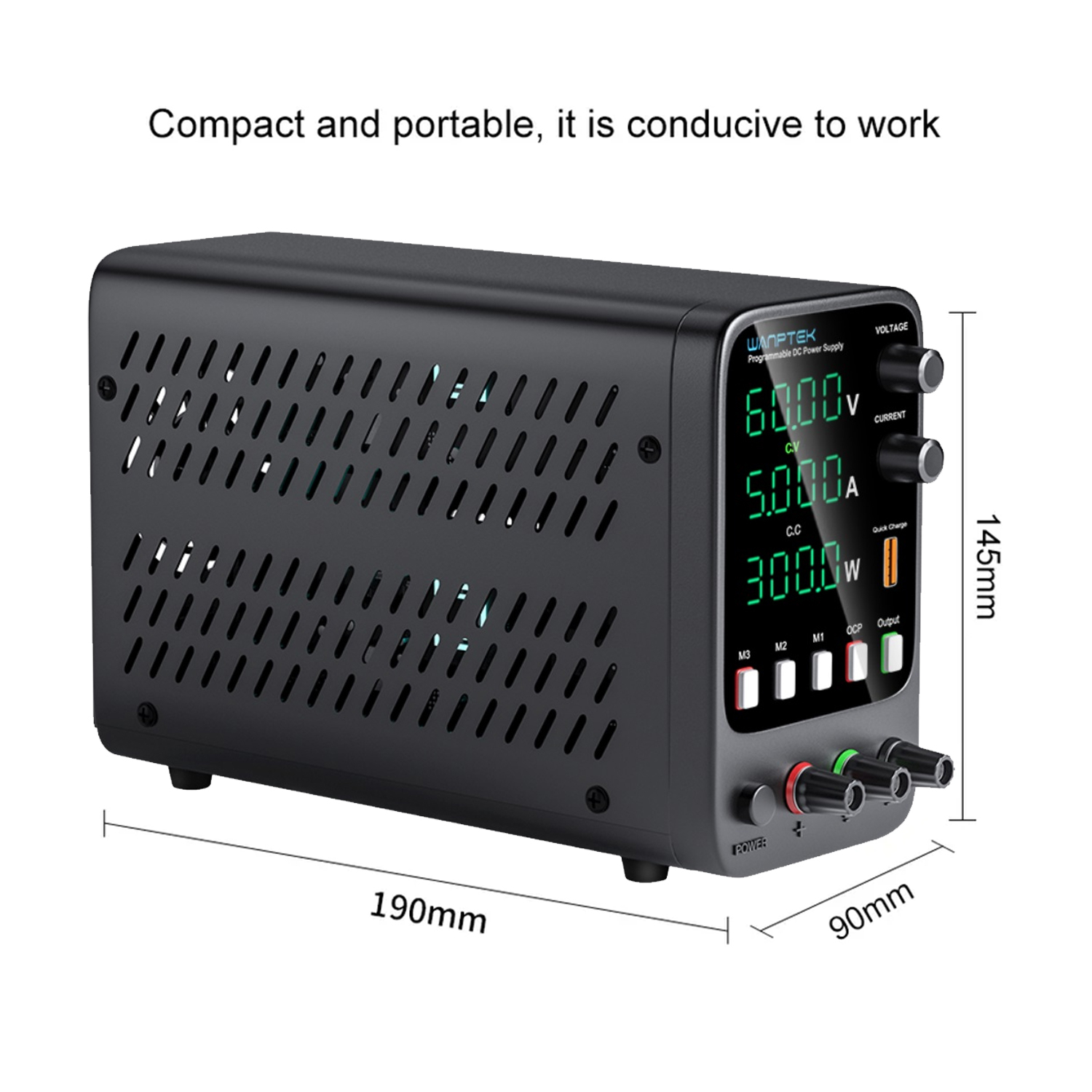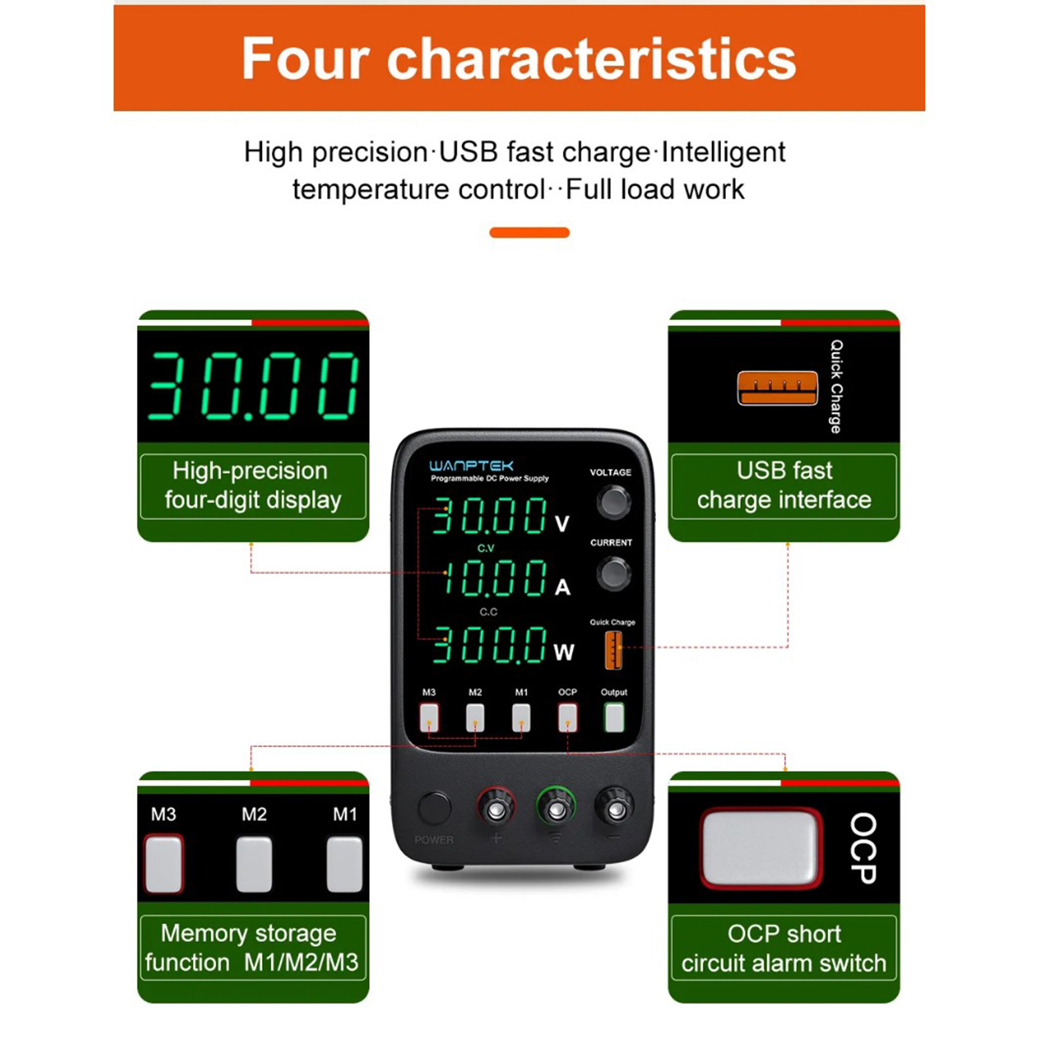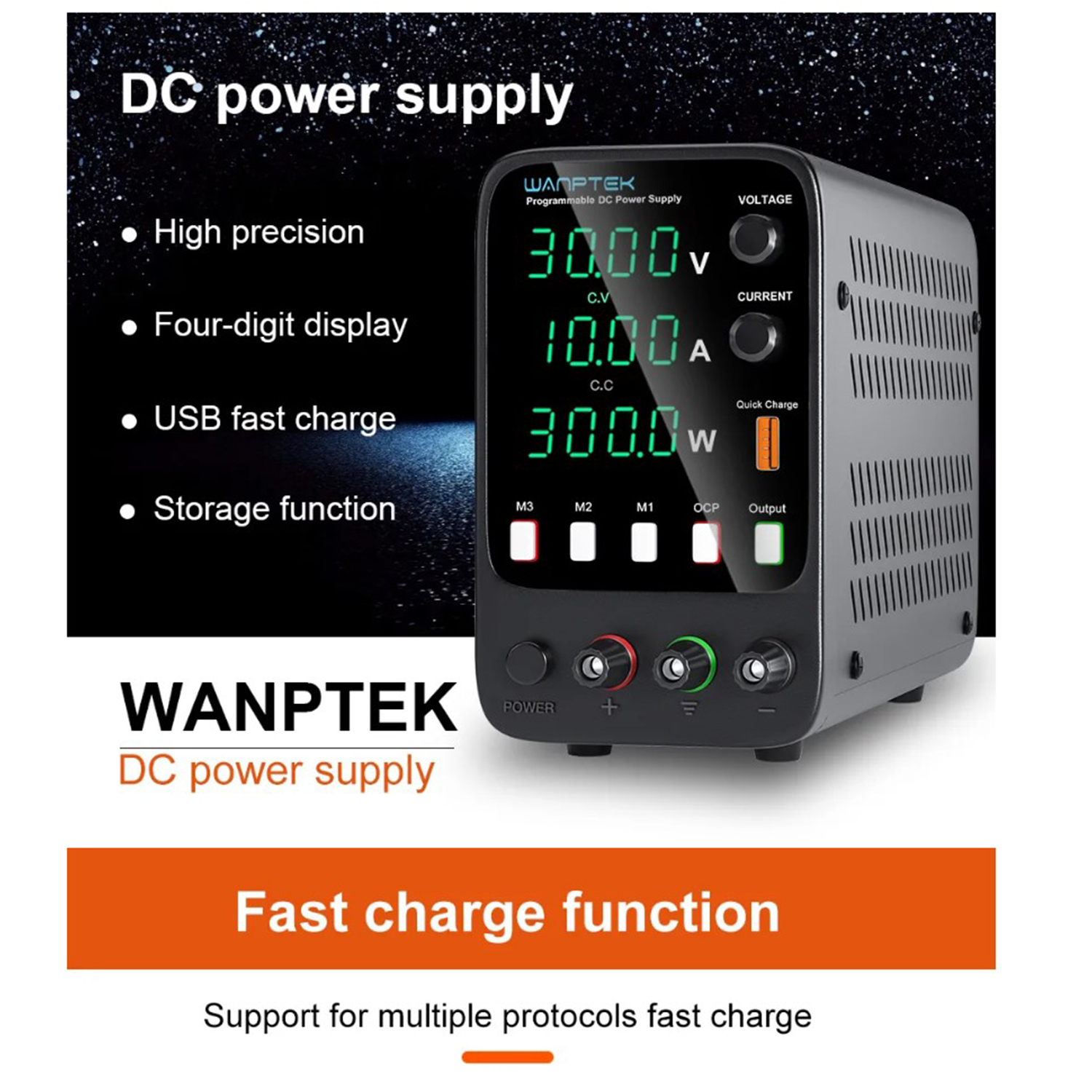 Блок живлення серії APS – це високоточні блоки живлення постійного струму з трьома показниками та чотирма цифровими розрядами в кожному, із програмованим керуванням, регулятори напруги постійного струму з функцією зберігання даних, які можуть одночасно відображати напругу, струм та потужність. Продукти широко використовуються в ремонті мобільних телефонів, ремонті комп'ютерів, зарядці акумуляторів, шкільному навчанні та на виробничих лініях. Вихідну напругу та вихідний струм можна плавно регулювати від 0 до номінального значення за допомогою кодованого потенціометра, а встановлене значення можна відображати заздалегідь, що зручно у використанні та налаштуванні. Пристрій має функцію швидкої зарядки USB та підтримує різні протоколи швидкої зарядки. Завдяки ідеальній схемі захисту від короткого замикання OVP та OCP, цей продукт також забезпечує функцію зв'язку з комп'ютером (опціонально), що дозволяє користувачам зручно підключати блок живлення до ПК за допомогою з'єднувального кабелю USB або RS485, щоб вони могли керувати використанням блоку живлення за допомогою програмного інтерфейсу та здійснювати дистанційне керування. Стабільність та коефіцієнт пульсацій блоку живлення дуже хороші. Він має невеликий розмір, легку вага, гарний дизайн, простий в експлуатації, може працювати при повному навантаженні протягом тривалого часу, що є популярним серед користувачів.