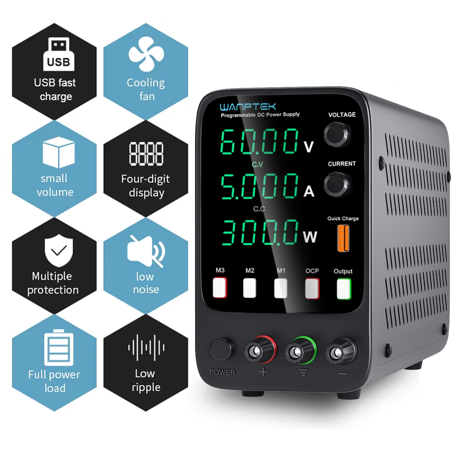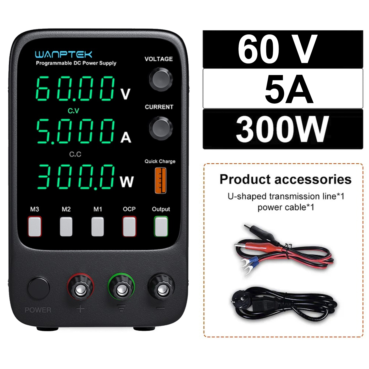 | Допоміжні функції | Швидка зарядка USB QC3.0, вихід OUT вмикається та вимикається кнопкою, 3 кнопки пам’яті налаштованих параметрів струму та напруги, режим контролю перевищення току OCP | ||||