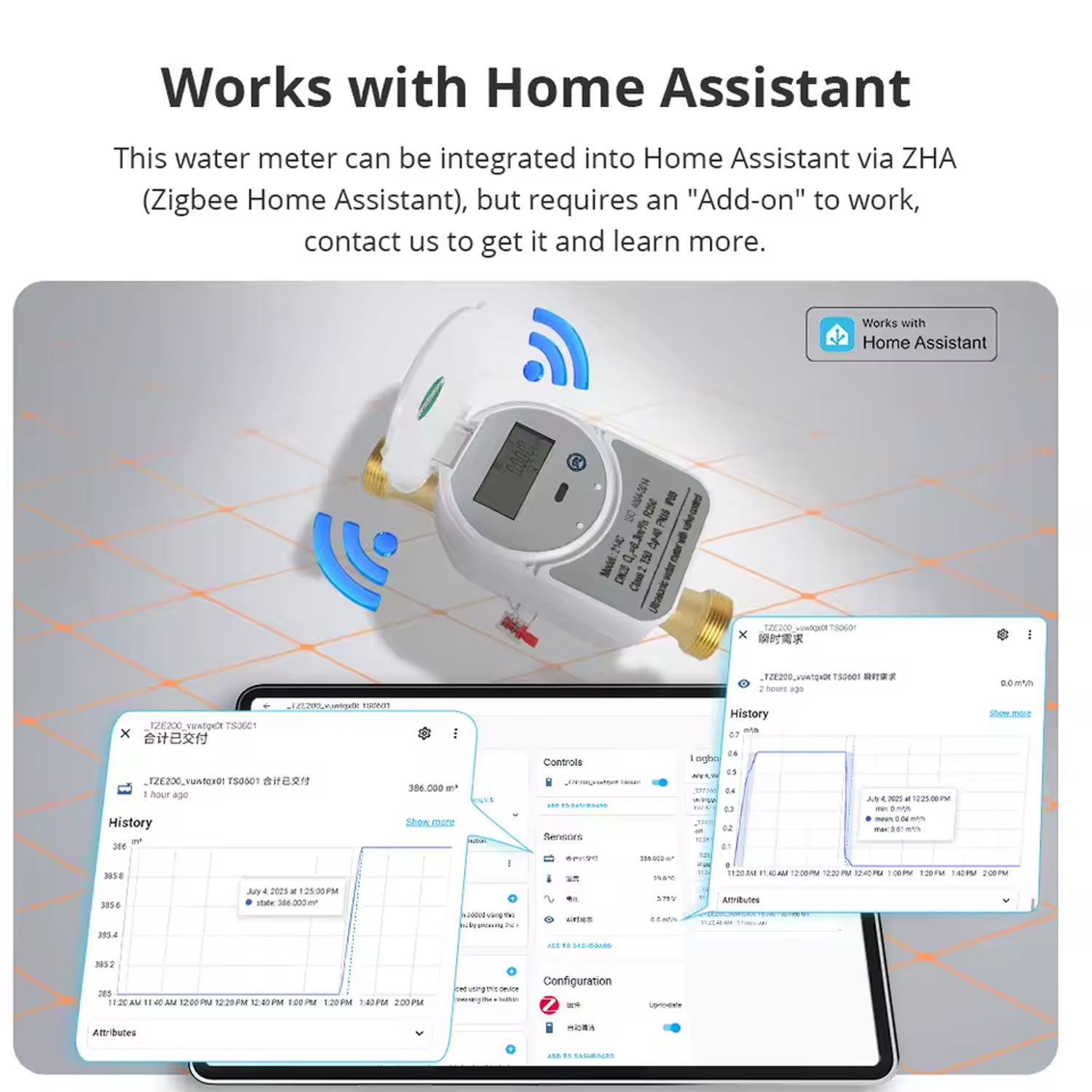 Лічильник води DN15 SMART ZigBee - це розумний лічильник рідини з вбудованим клапаном використовується для повного контролю протоку будь якої рідини / води, та загальним витратам води зі статистикою в розрізі годин / місцяів / років. Завдяки найновішій технології ультразвукового вимірювання потоку (без рухомих елементів та механізмів всередині) можлива установка лічильника під кількома кутами, водночас мінімізуючи втрати тиску в трубопроводі, а сам лічильник має практично необмежений ресурс роботи та не вимагає регулярного обслуговування і калібрування. Може використовуватись як для побутових, так і для промислових споживачів. За допомогою вбудованого радіомодуля ZigBee приєднується через недорогий шлюз ZigBee-WiFi до бездротової мережі WiFi і передає всі параметри до хмари на сервері, ці параметри зручно контролюються в будь який момент з мобільного додатку SmartLife або TuyaSmart. Додаток дозволяє віддалено змінювати всі параметри налаштувань лічильника, переглядати поточні параметри лічильника, витрати води за довільний період в розрізі годин / місяців / років, є можливість програмування часу увімкнення/вимкнення подачі води за допомогою вбудованого клапана, а також вимкнення подачі води при досягненні певного рівня витрат води. Пристрій має надійний вбудований клапан, який дозволяє віддалено відмикати/вмикати об’єкт водопостачання. ZigBee WiFi SMART лічильник має цифровий дисплей, на якому відображаються поточні параметри.